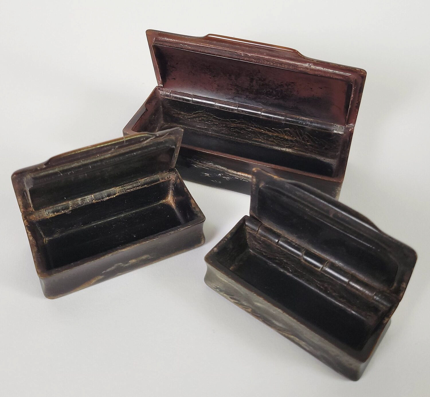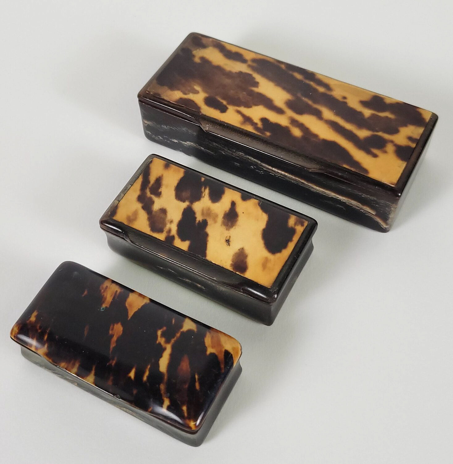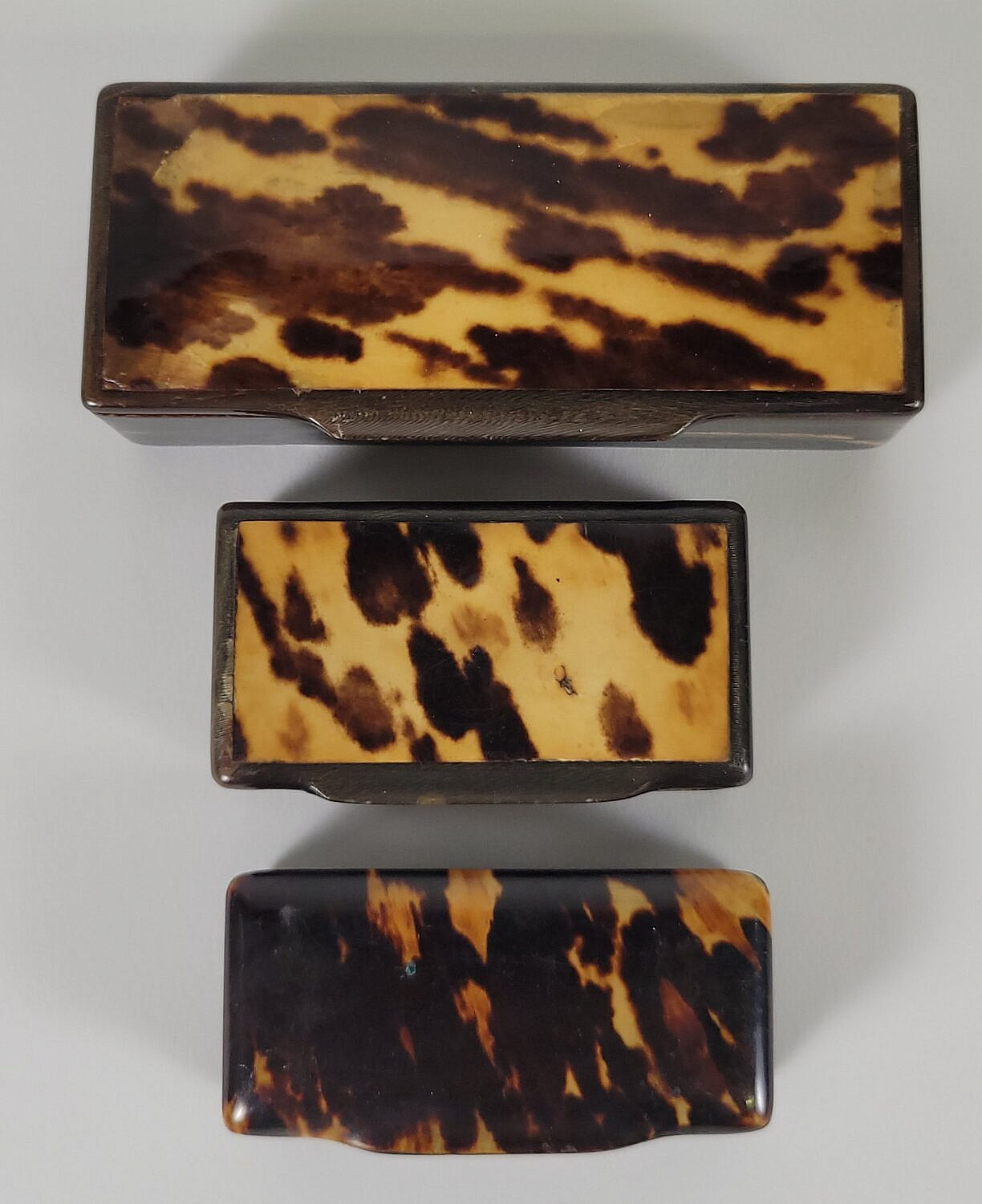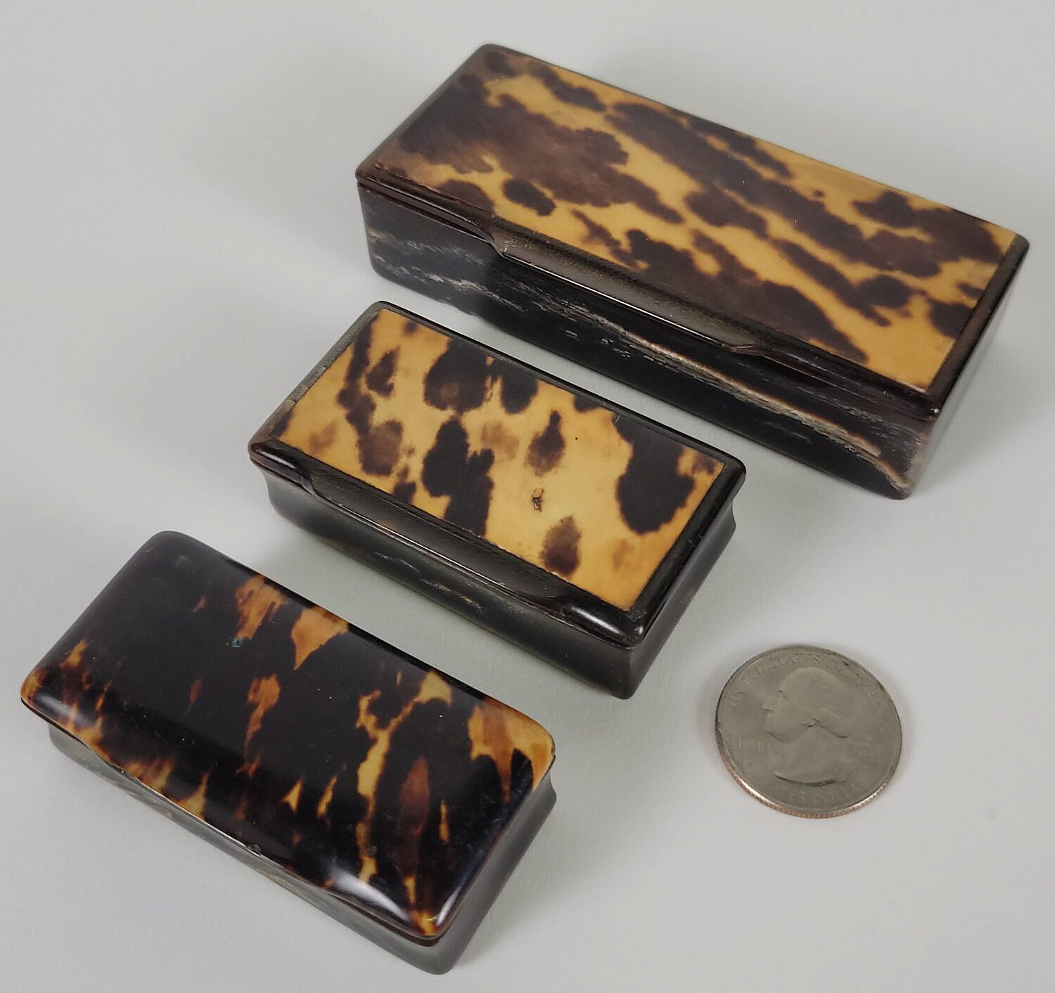 Three Antique 19th C. English Tortoiseshell Miniature Boxes Consign Now DeptDecorative ArtsSizeHeight .75 in. Width 2.5 in. Depth 1.25 in. to Height 1 in. Width 3.75 in. Depth 1.5 in. Three Antique 19th C. English Tortoiseshell Miniature Boxes, Sizes ranging from Height .75 in. Width 2.5 in. Depth 1.25 in. to Height 1 in. Width 3.75 in. Depth 1.5 in. Please note that this auction has ended. Click here for an overview of this auction.