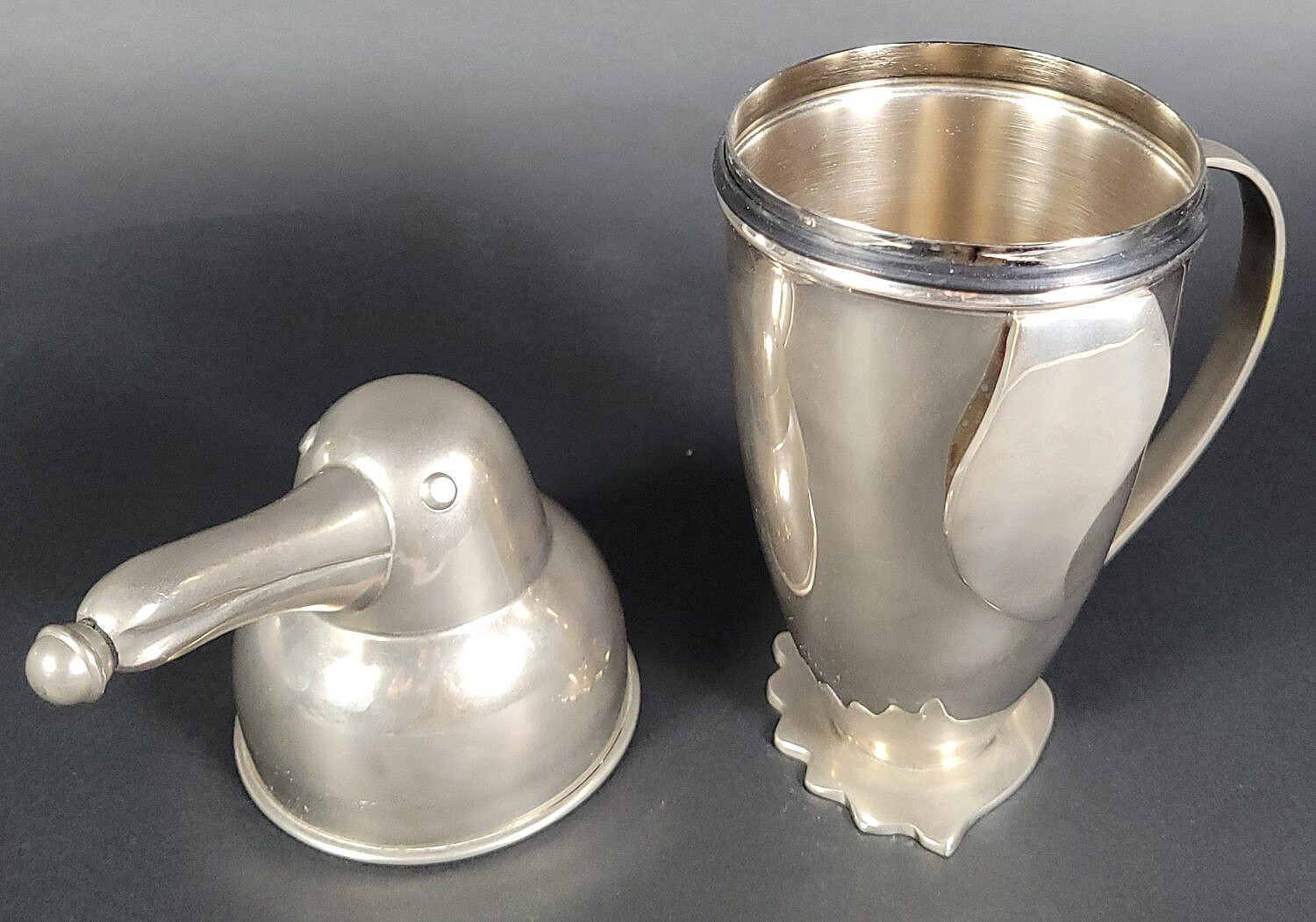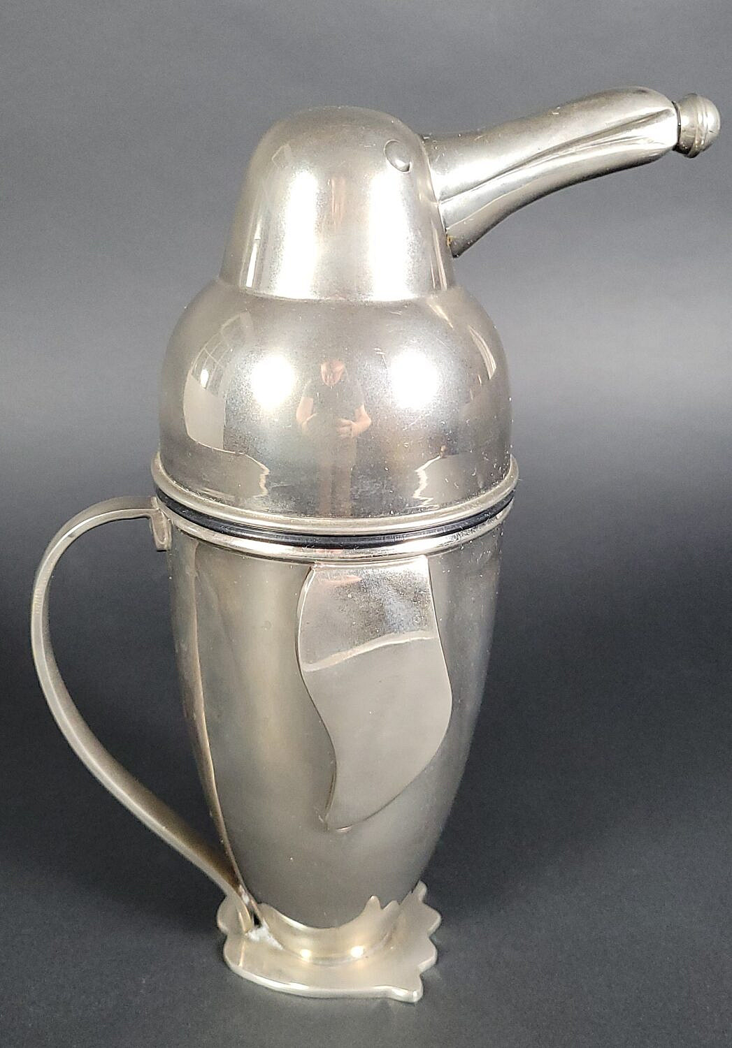Vintage Art Deco Style Silver Plated Penguin Cocktail Shaker Consign Now DeptDecorative ArtsSizeHeight 11 in. Width 4 in. Depth 6 in. Vintage Art Deco Style Silver Plated Penguin Cocktail Shaker, in two sections with stopper at end of beak. Height 11 in. Width 4 in. Depth 6 in. Please note that this auction has ended. Click here for an overview of this auction.