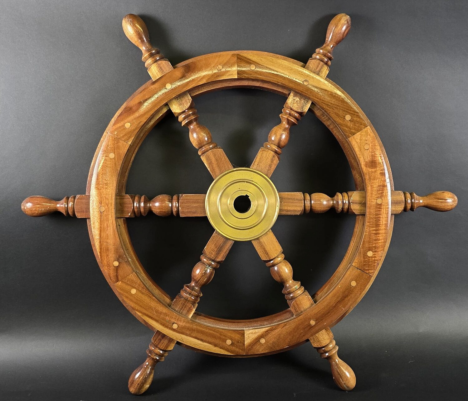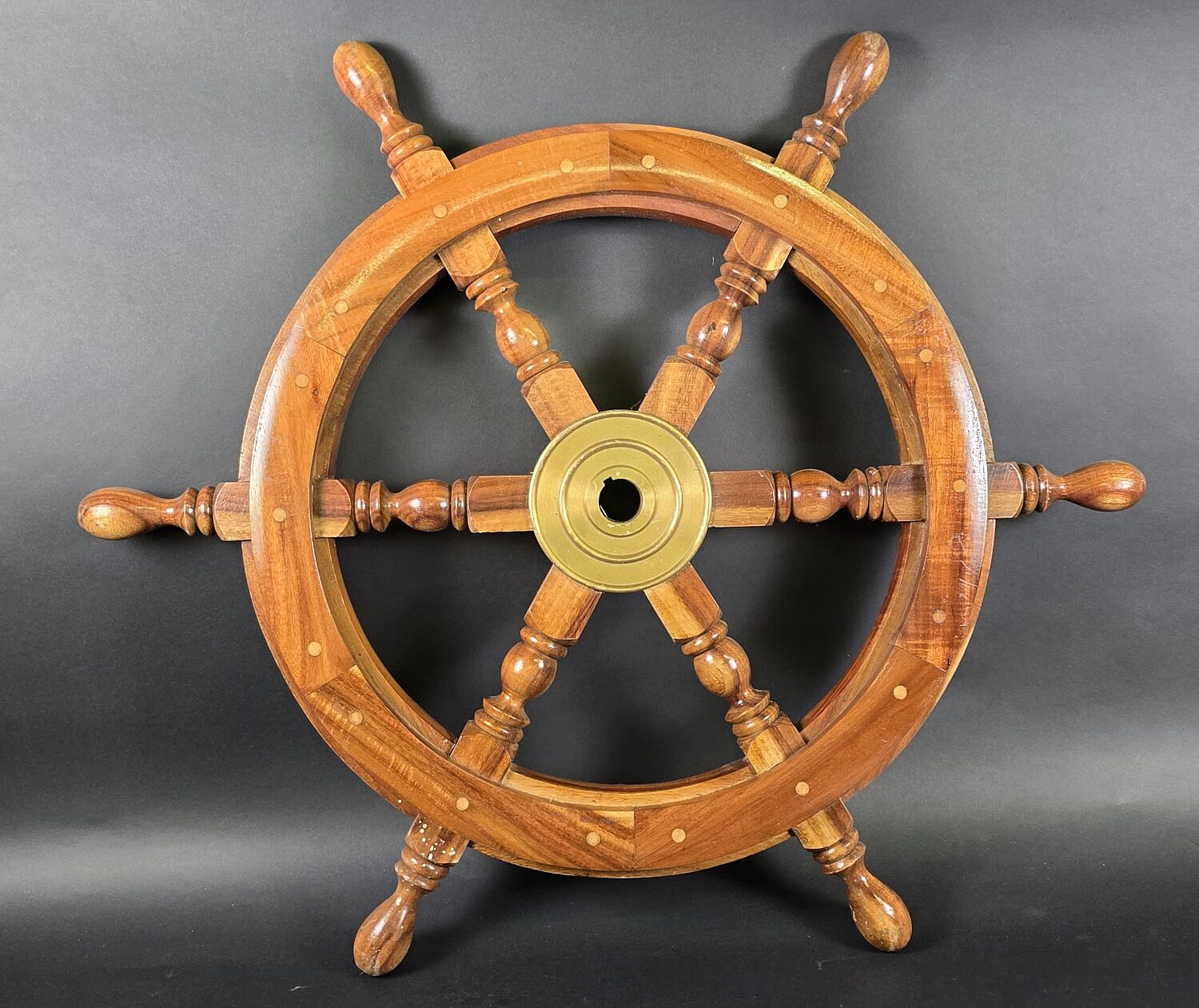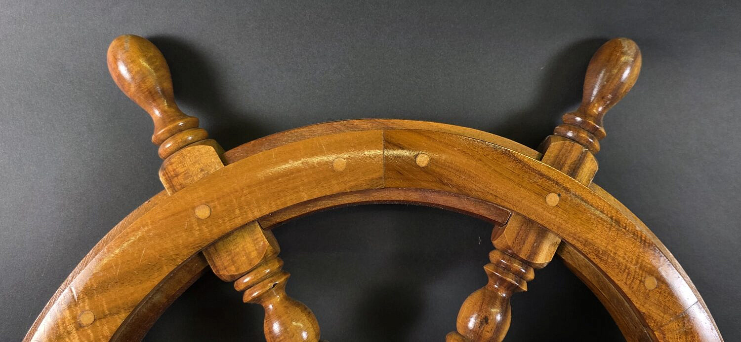 Vintage Inlaid Six-Spoke Ships Steering Wheel, 20th century.