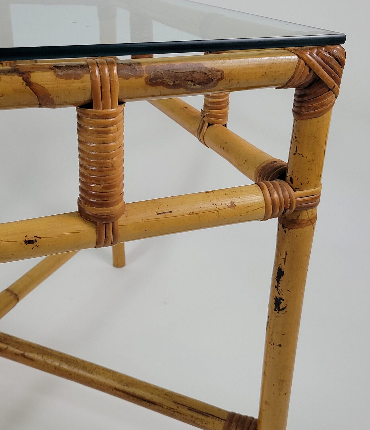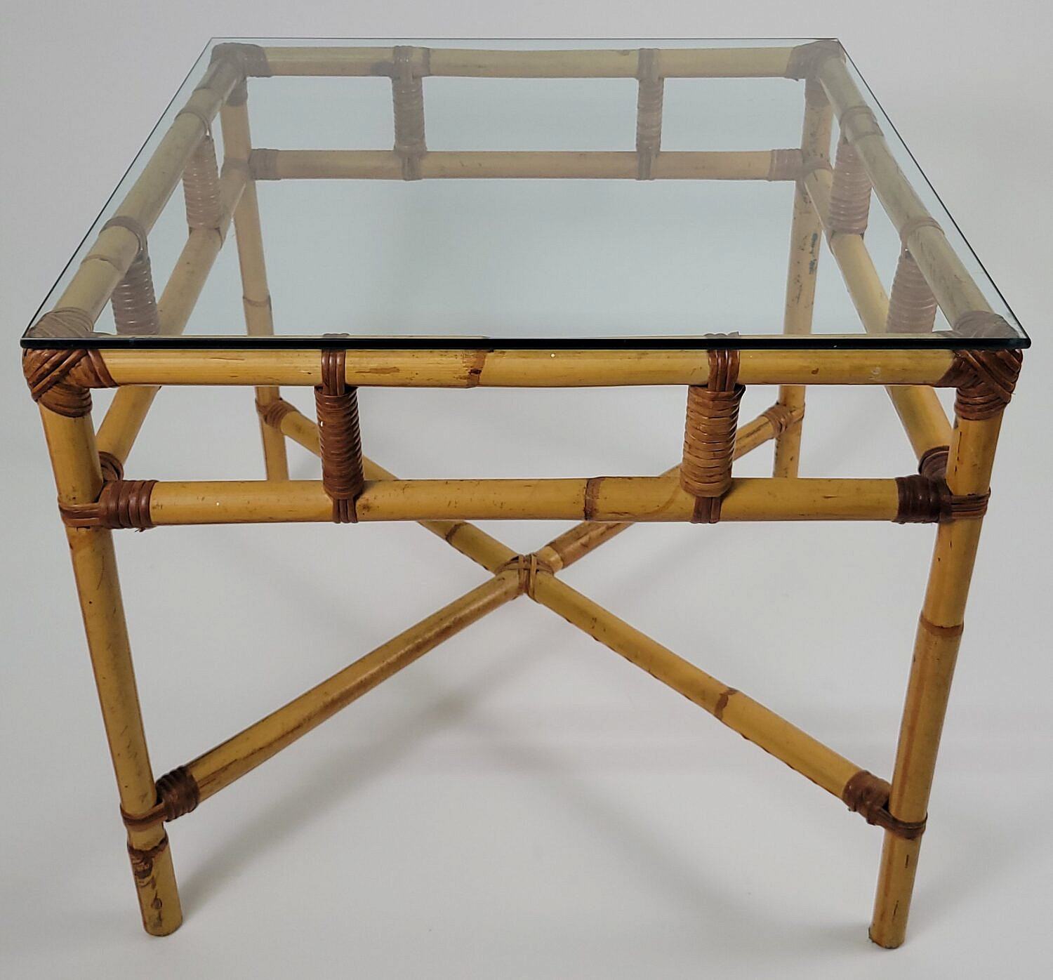 Vintage Mid Century Modern Glass Top Bamboo Table Consign Now Dept20th Century Design, FurnitureSizeHeight 22.5 in. Width 25 in. Depth 25 in. Vintage Mid Century Modern Glass Top Bamboo Table, with rattan woven joints, glass top. Height 22.5 in. Width 25 in. Depth 25 in. Please note that this auction has ended. Click here for an overview of this auction.