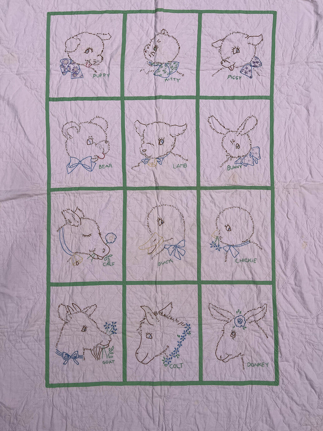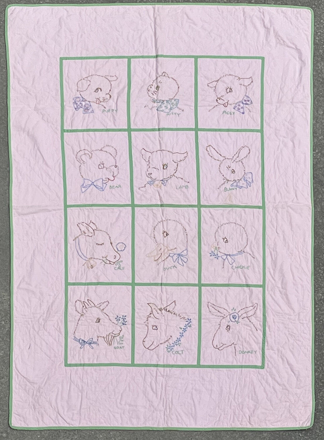 Vintage Pink and Green Animal Embroidered Crib Quilt, circa 1940s, depicting puppy, kitty, piggy, bear, lamb, bunny, calf, duck, chickie, colt and donkey