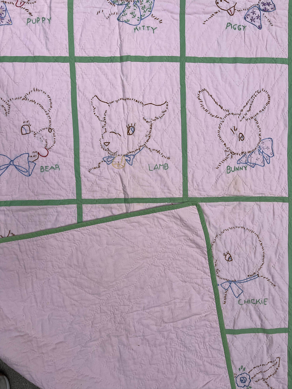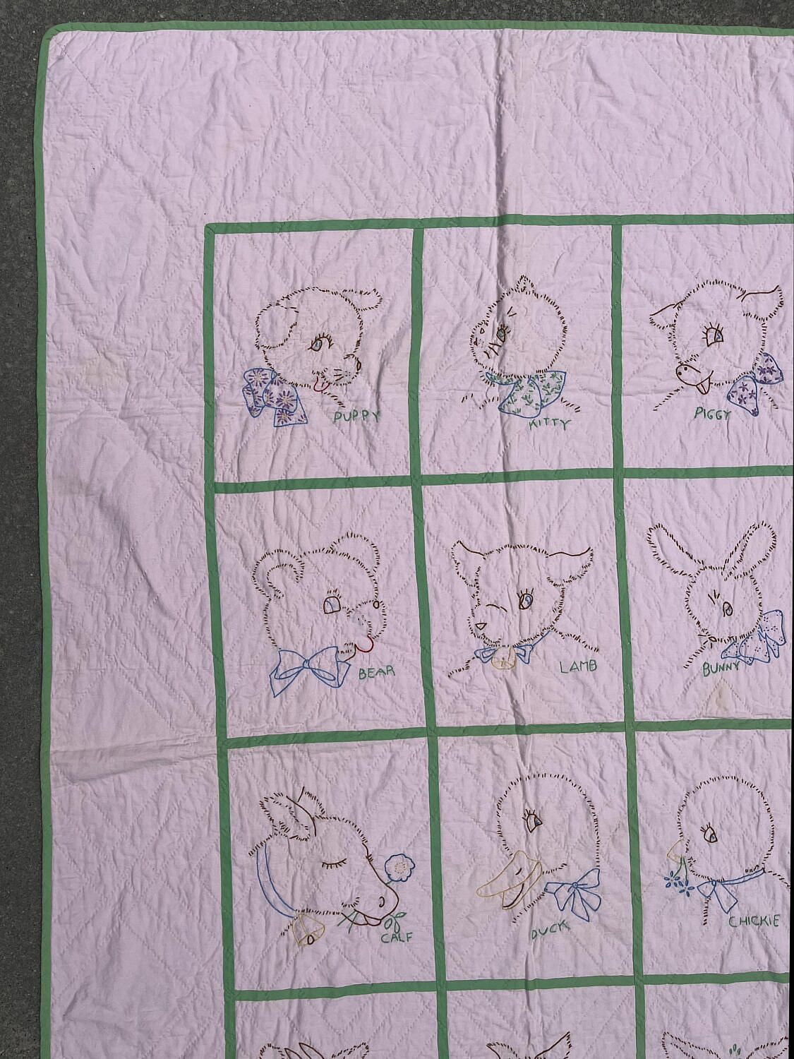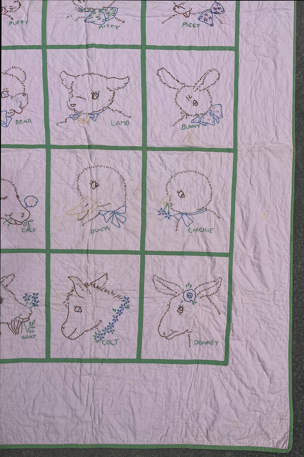 42784 Crib Quilt A_IMG_9350Vintage Pink and Green Animal Embroidered Crib Quilt, circa 1940sVintage Pink and Green Animal Embroidered Crib Quilt, circa 1940sVintage Pink and Green Animal Embroidered Crib Quilt, circa 1940sVintage Pink and Green Animal Embroidered Crib Quilt, circa 1940s