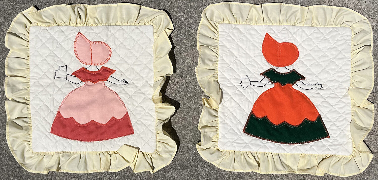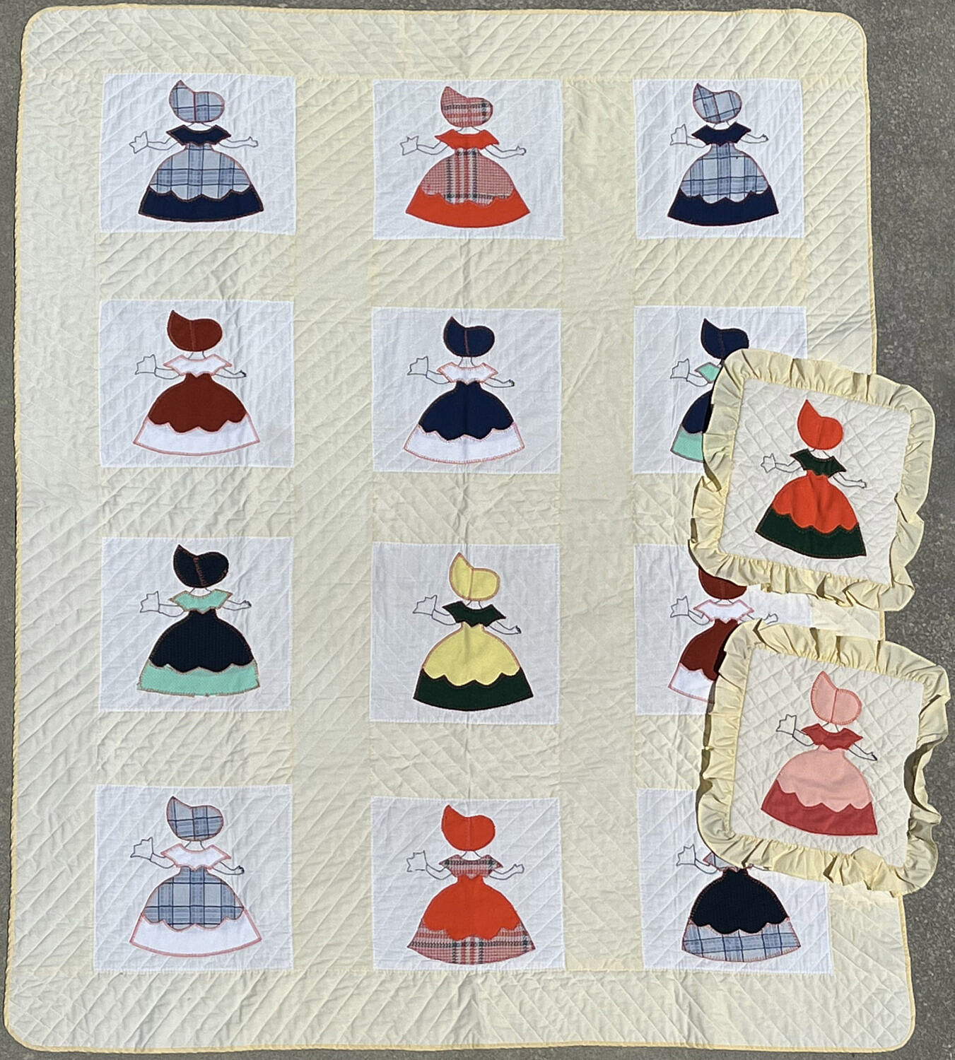 Vintage “Sun Bonnet Sue” Applique Quilt, pale yellow ground with embroidered highlights on twelve figures with two ruffle edge pillow covers