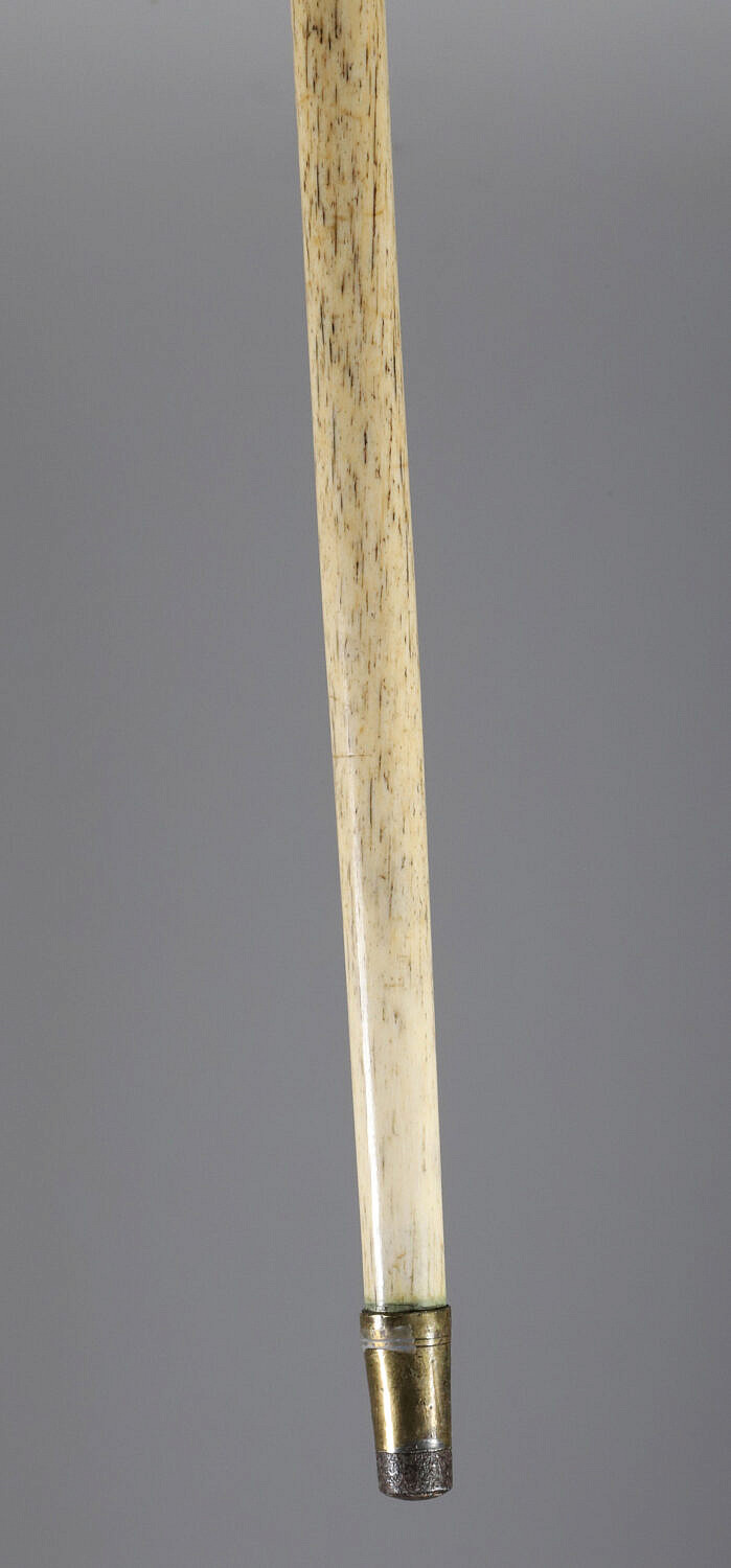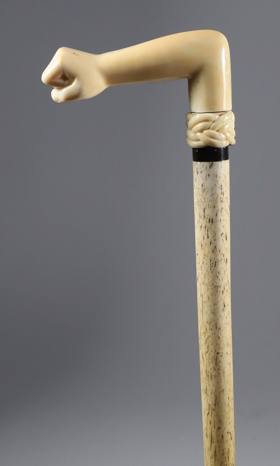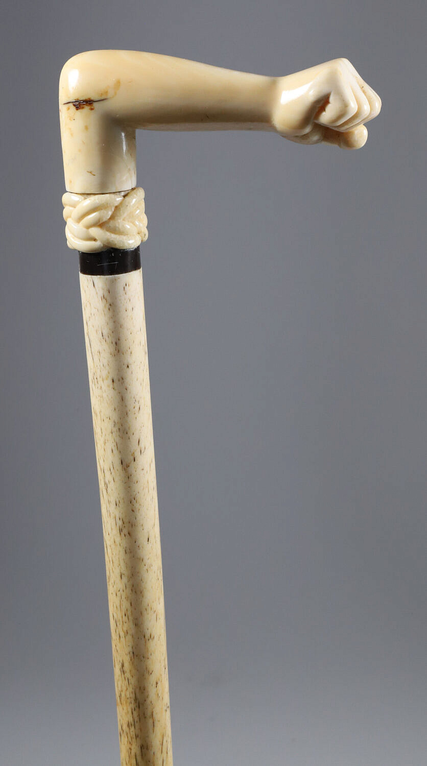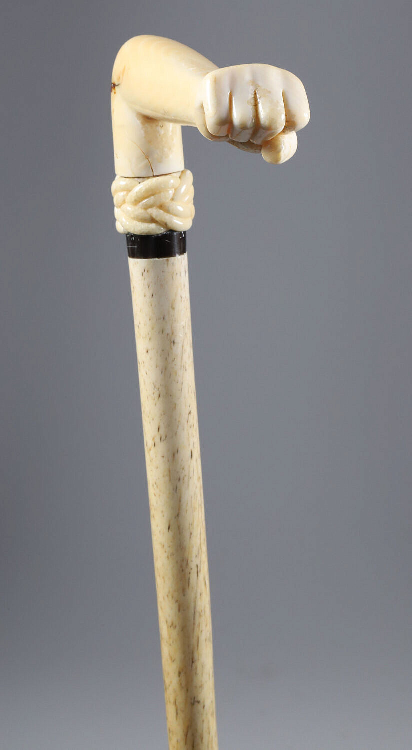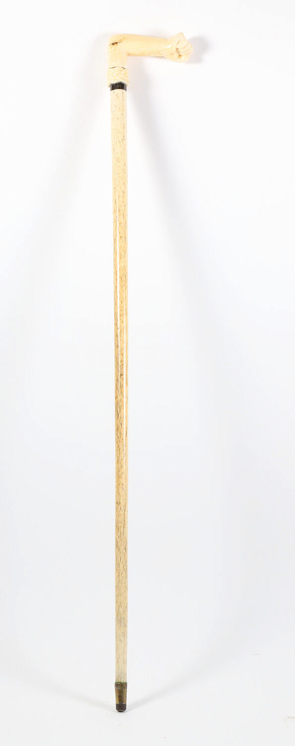Whaler Made Clenched Fist Cane, 19th Century Consign Now Dept19th Century Scrimshaw, Walking Sticks and CanesSizeLength 34 in. Whaler Made Clenched Fist Cane, 19th Century, antique walrus ivory clenched fist and turks head band on tapering whale bone shaft Length 34 in. Provenance: The Estate of Eddi Van Auken Please note that this auction has ended. Click here for an overview of this auction.