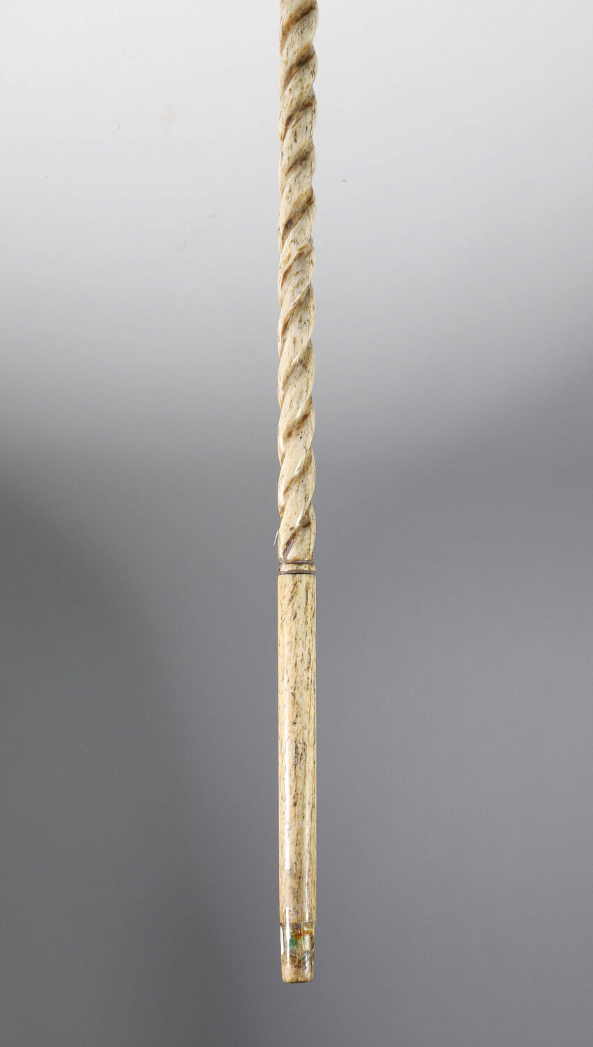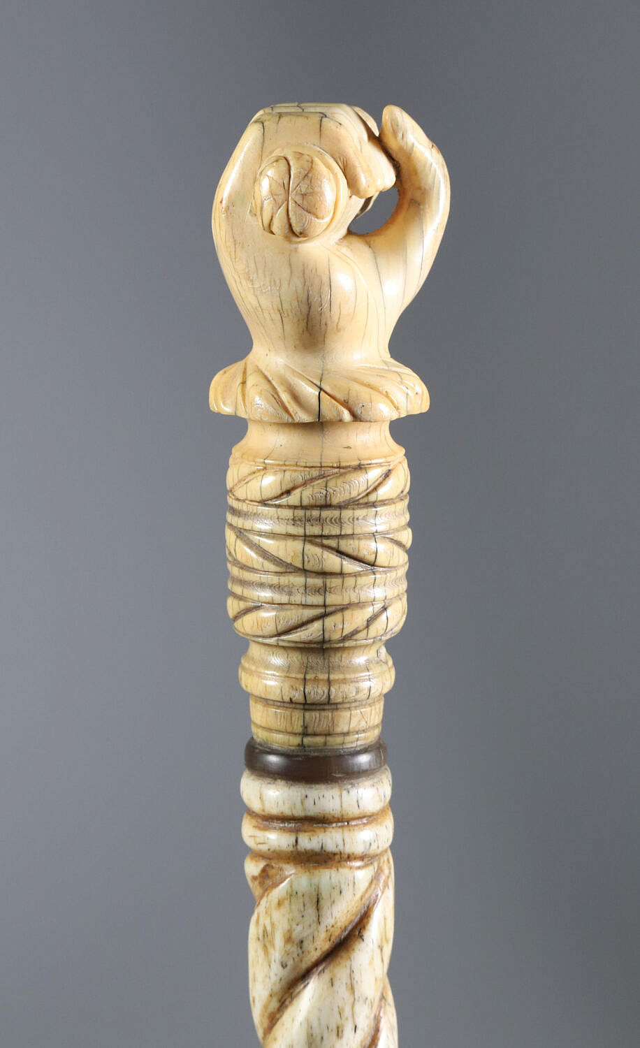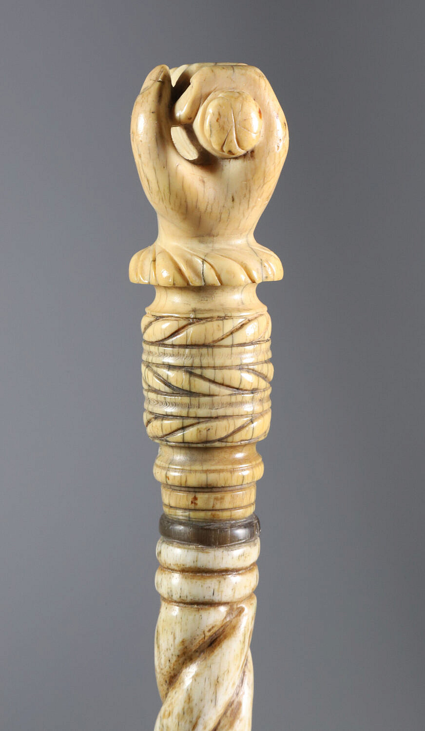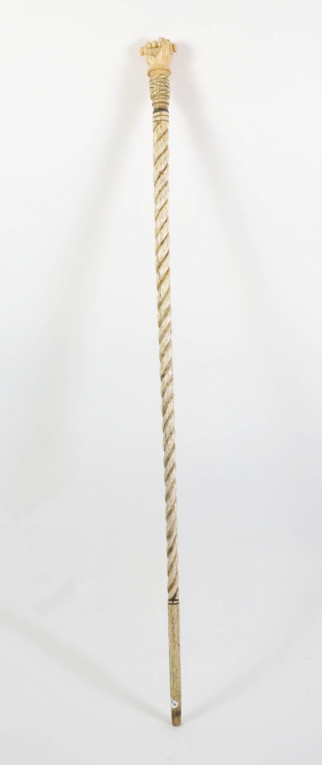 Whaler Made Fist Holding Dowel Walking Stick, early 19th Century Consign Now Dept19th Century Scrimshaw, Walking Sticks and CanesSizeLength 32.5 in. Whaler Made Fist Holding Dowel Walking Stick, early 19th Century, antique whale ivory carved hand holding a dowel with knob ends above a carved section, whale bone carved rope shaft Length 32.5 in. Provenance: The Estate of Eddi Van Auken Please note that this auction has ended. Click here for an overview of this auction.