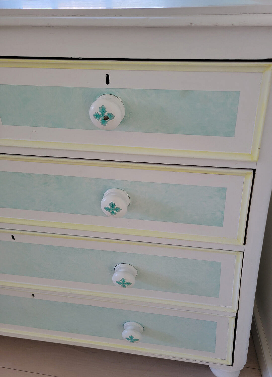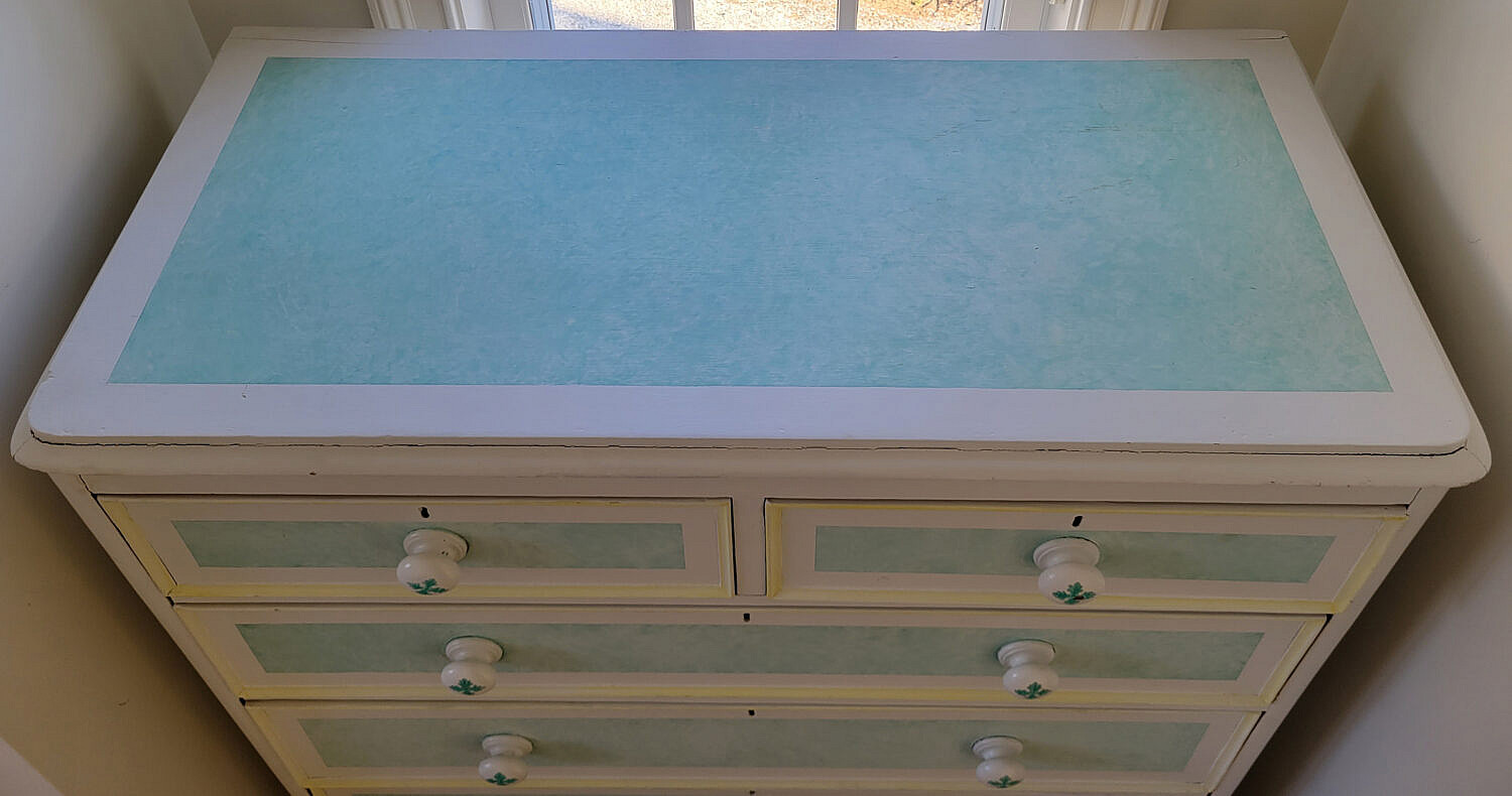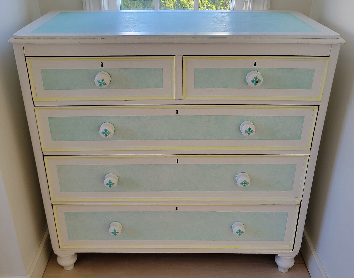 Baby Blue and White Paint Decorated Five-Drawer Tall Dresser, an antique cottage pine chest of drawers with later paint decoration, two over three drawer configuration on turned feet