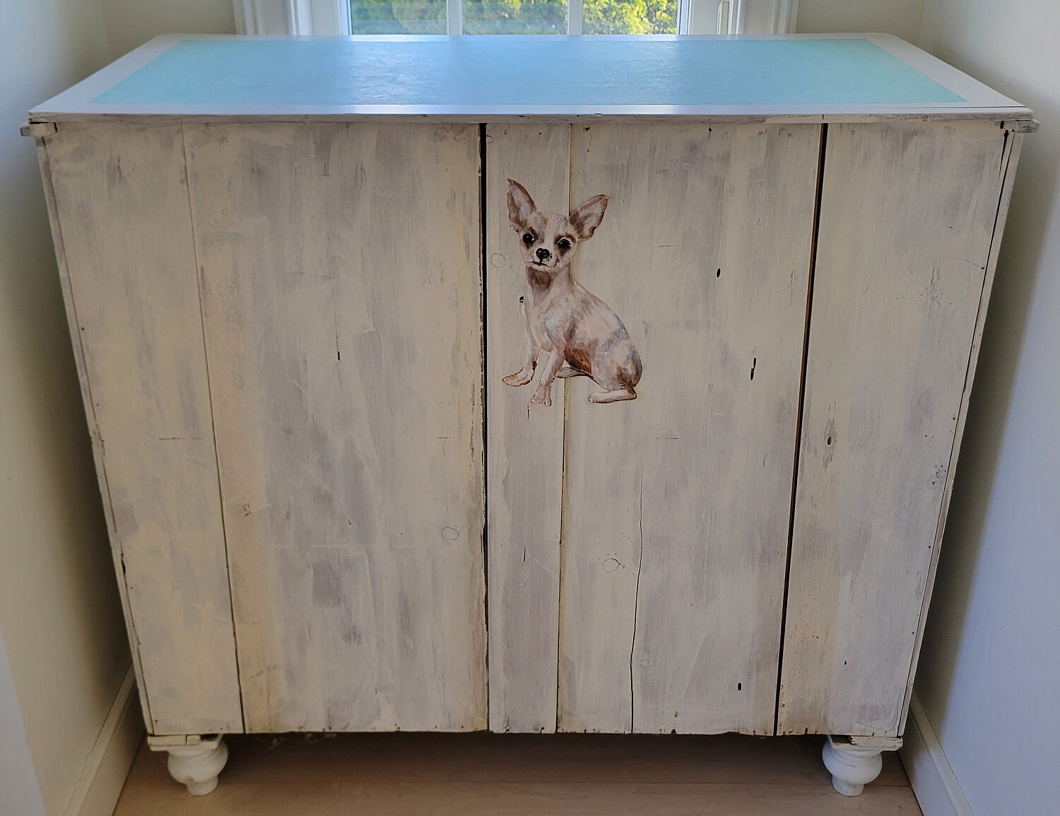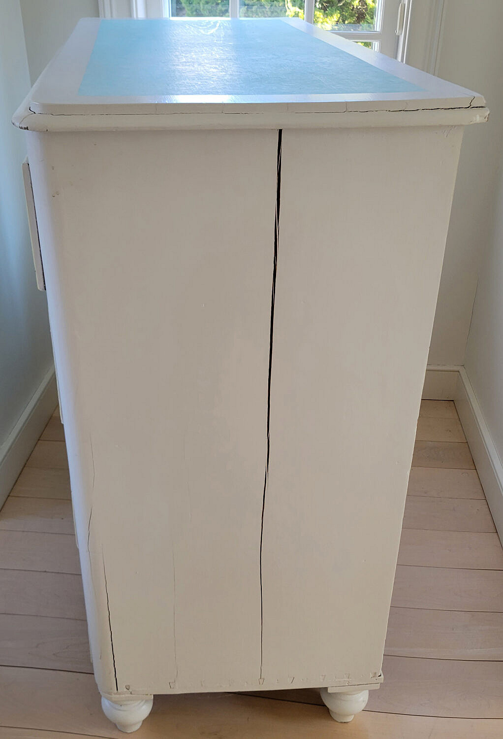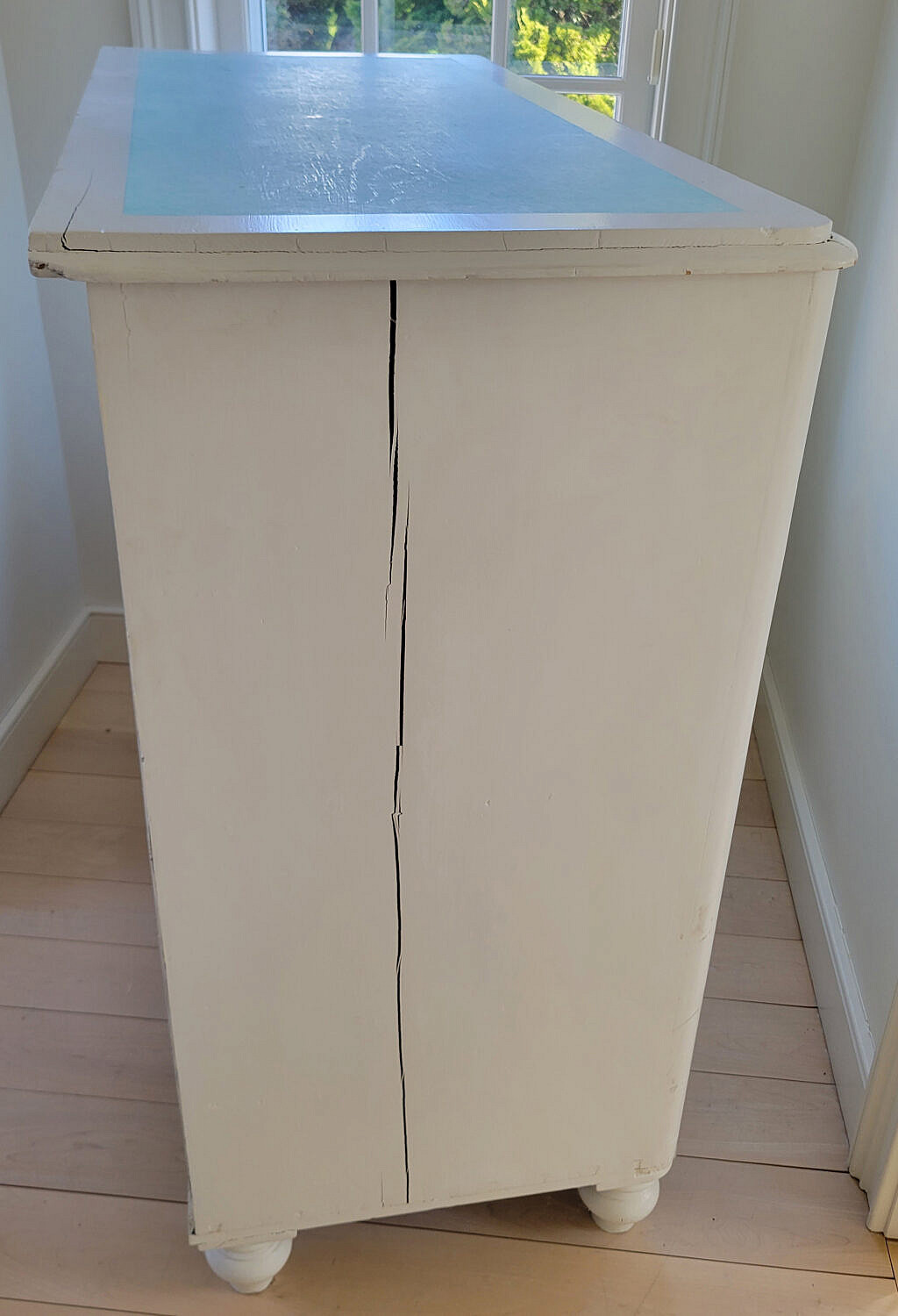 Baby Blue and White Paint Decorated Five-Drawer Tall Dresser, an antique cottage pine chest of drawers with later paint decoration, two over three drawer configuration on turned feet