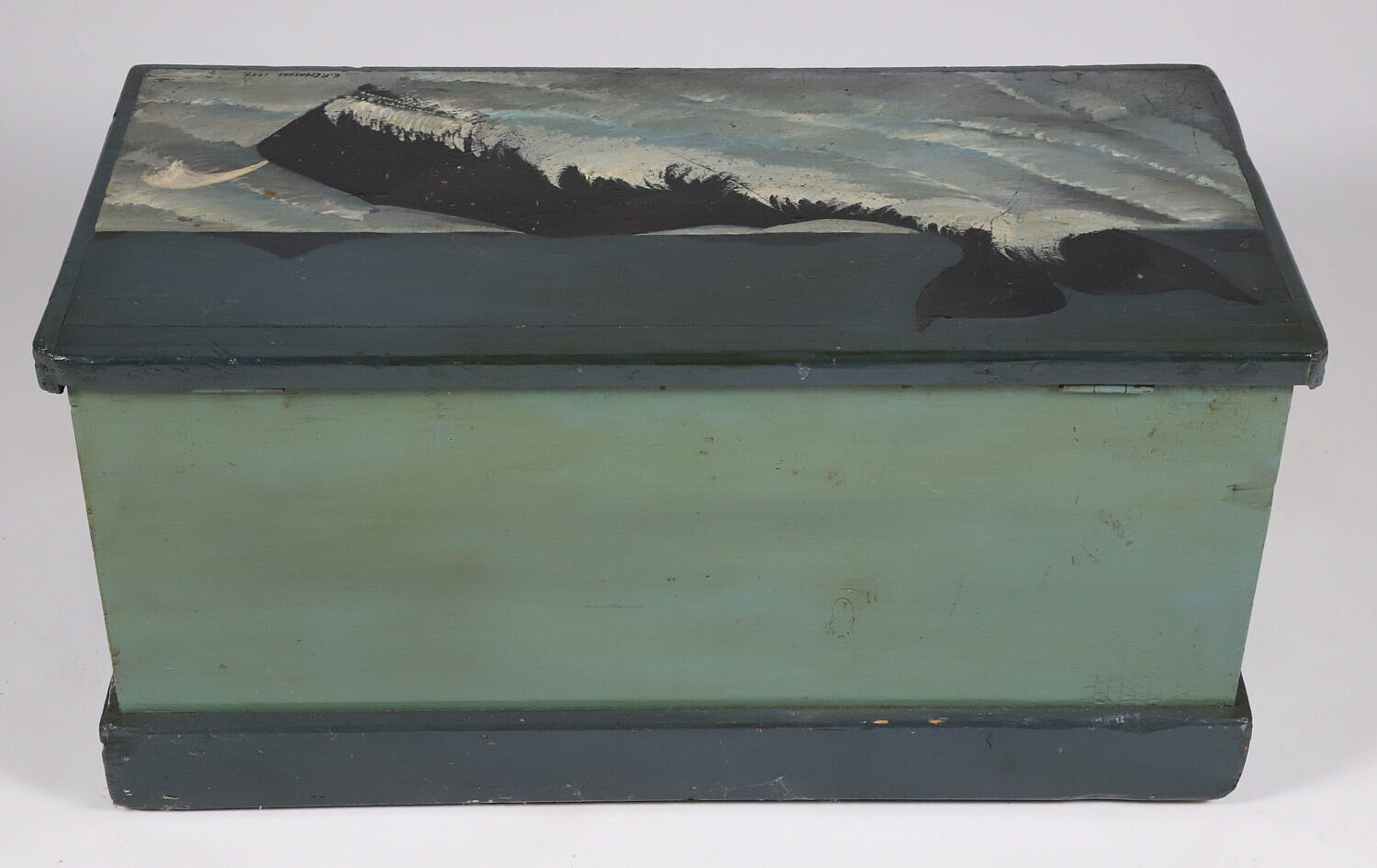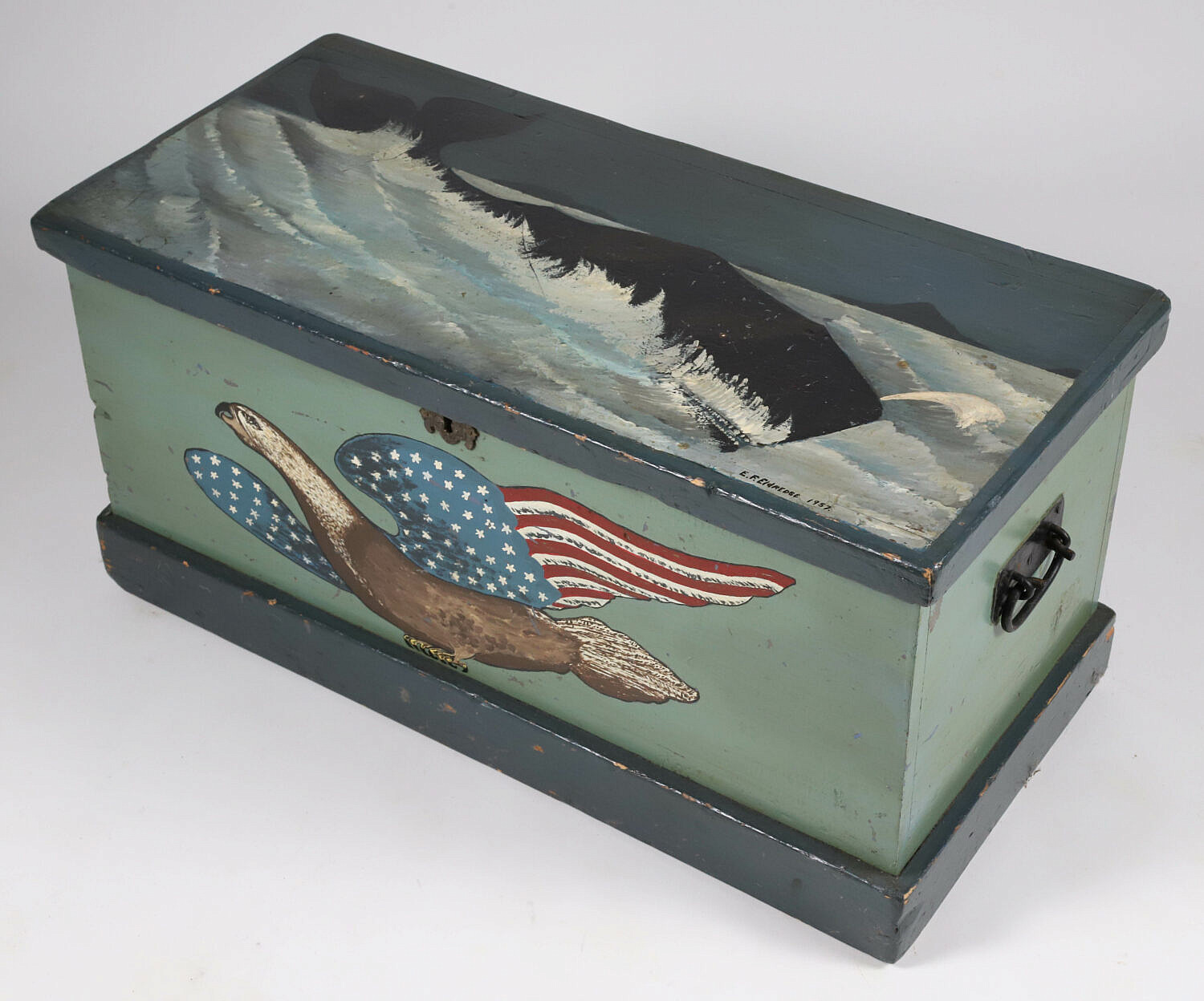 E. F. Eldredge Painted Whale and Eagle Storage Box, circa 1957 Consign Now DeptDecorative Arts, FurnitureSizeHeight 14 in. Width 28.5 in. Depth 14 in. E. F. Eldredge Painted Whale and Eagle Storage Box, circa 1957, signed and dated E.F. Eldredge, 1957 Height 14 in. Width 28.5 in. Depth 14 in. Provenance: The Estate of Joly Walton Stewart, Shimmo Pond Road, Nantucket Island, Massachusetts Please note that this auction has ended. Click here for an overview of this auction.
