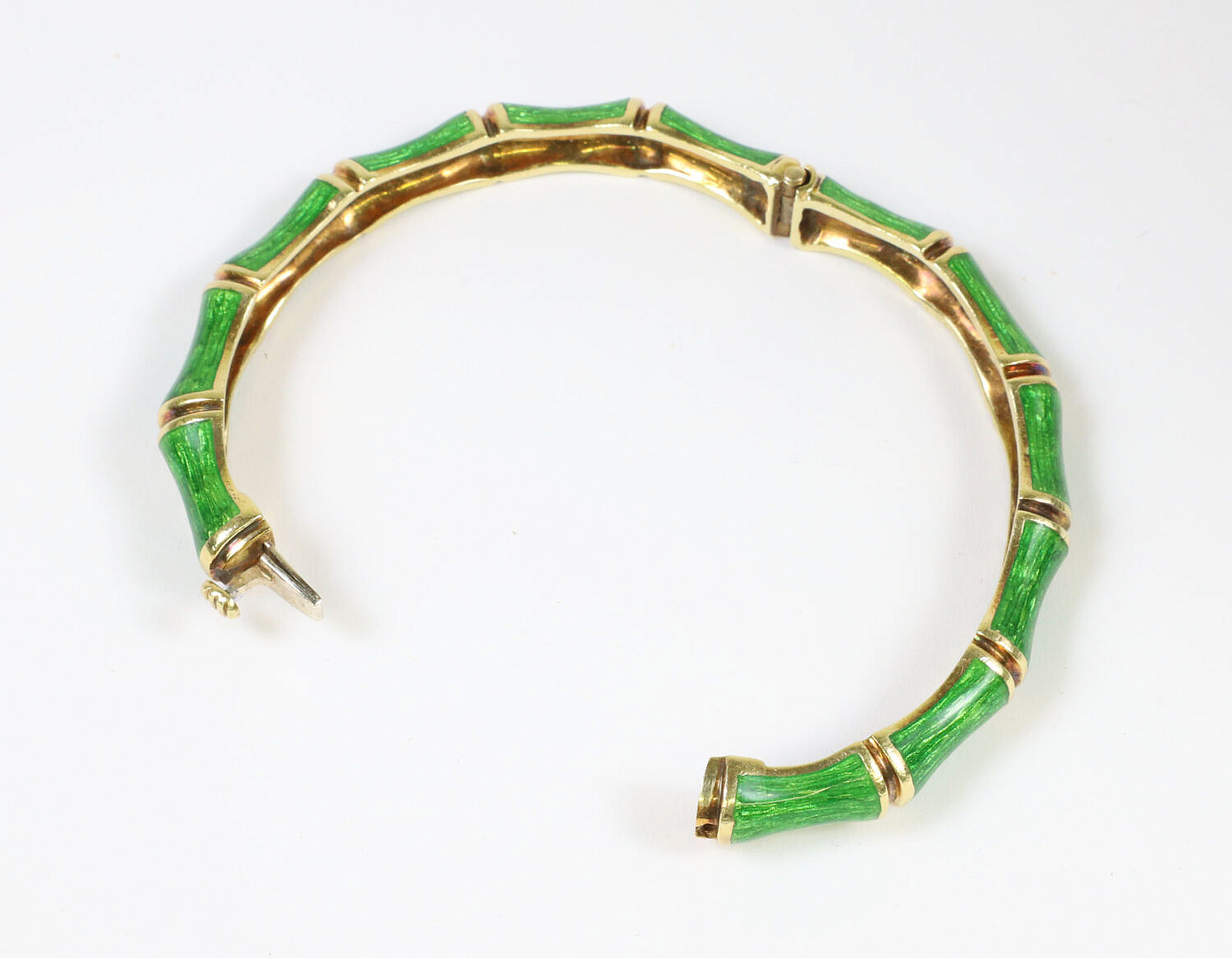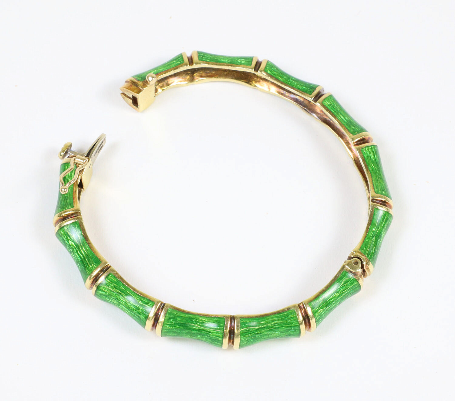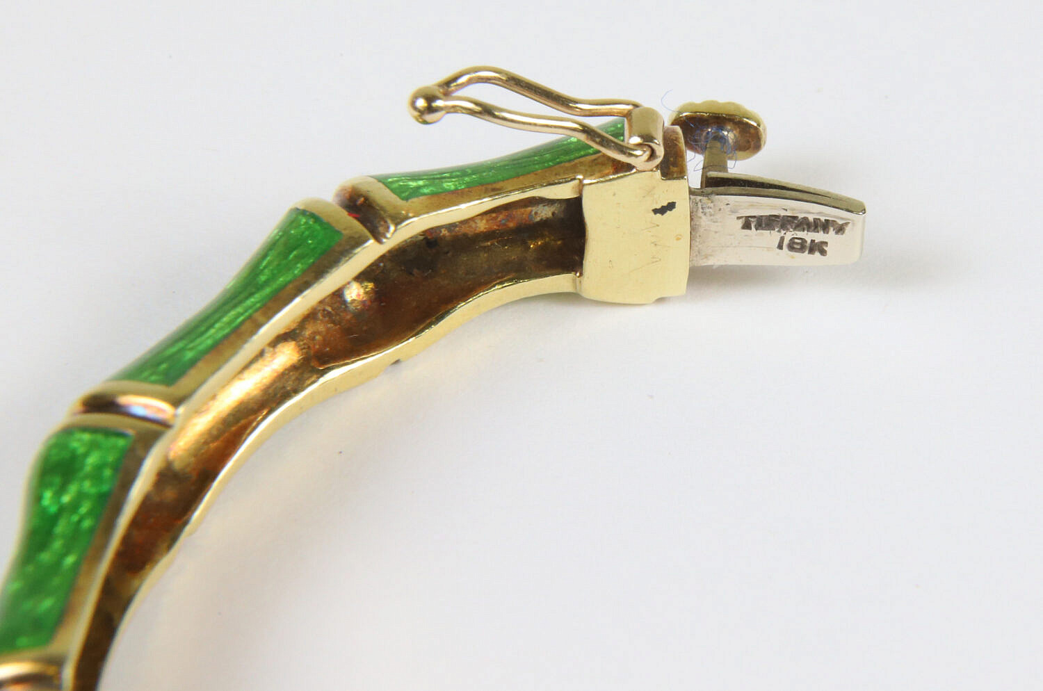 18k Gold Tiffany & Co. Jean Schlumberger Green Enamel Bracelet, marked Tiffany 18k. Interior Diameter 2.25 in. x 1.75 in.