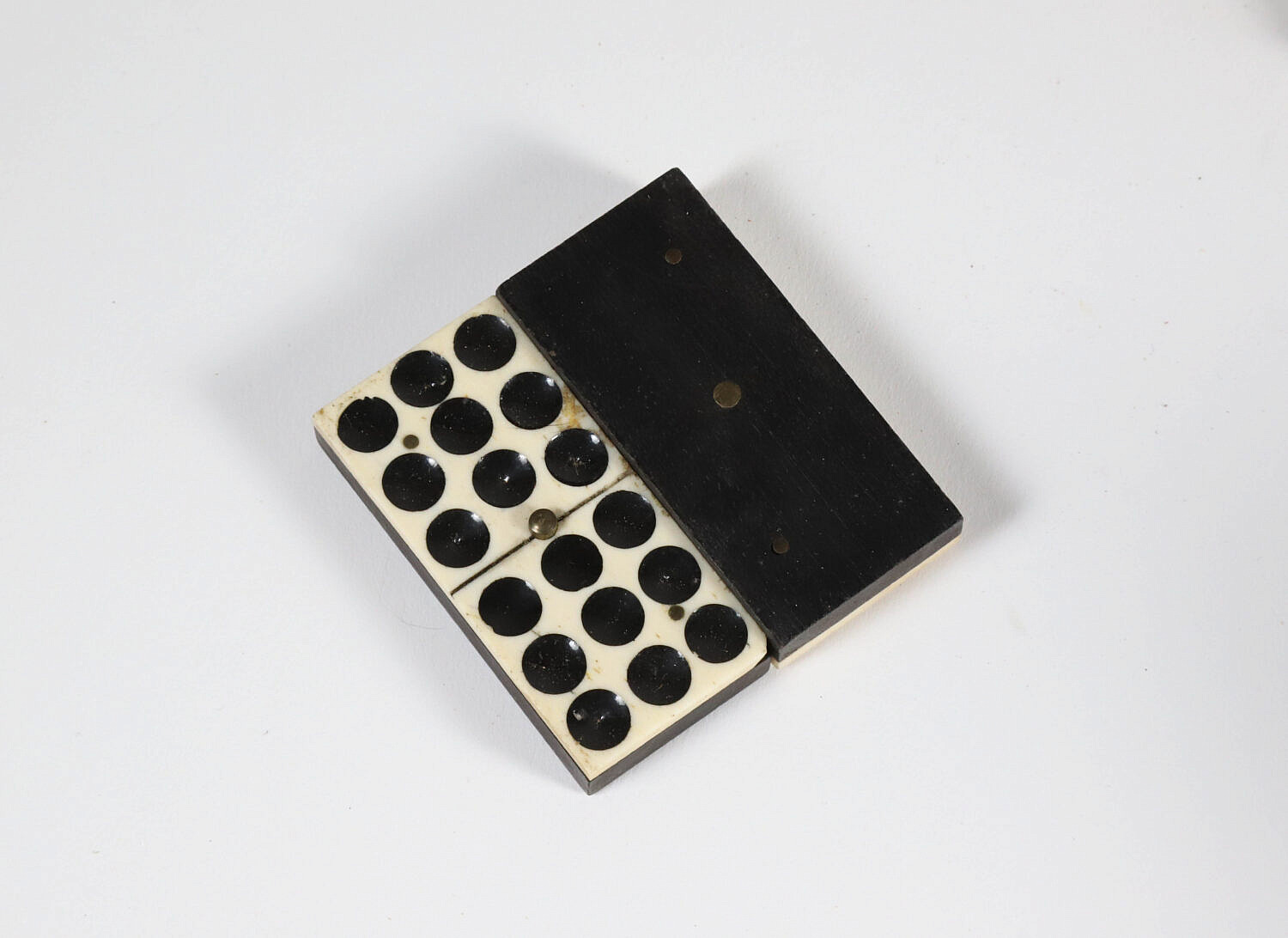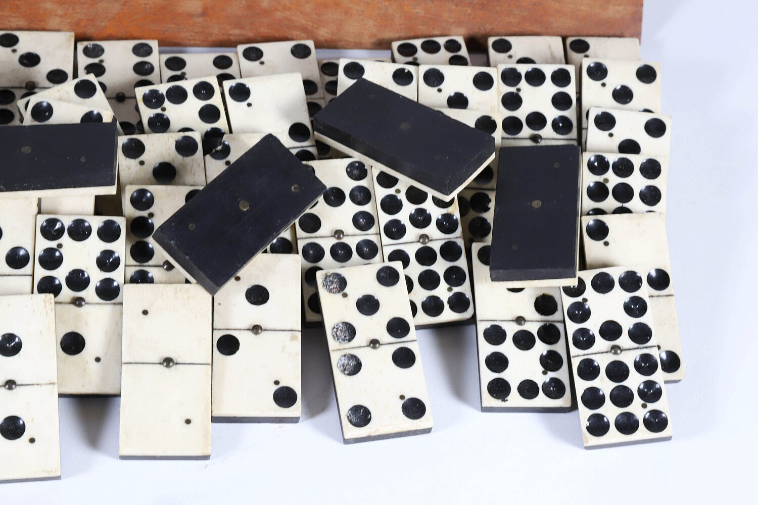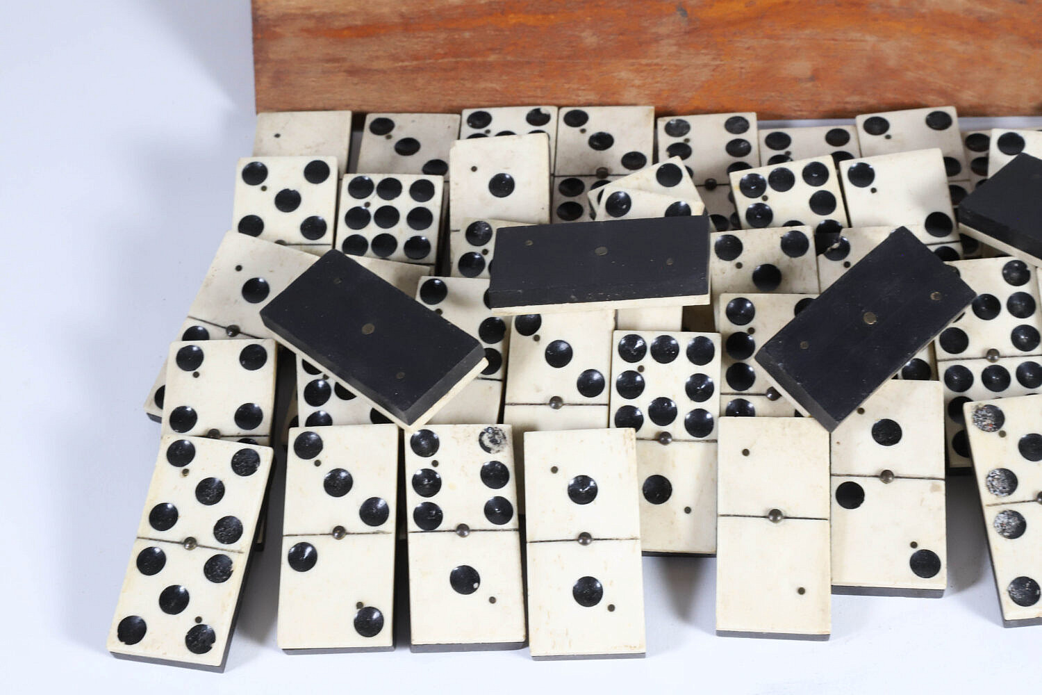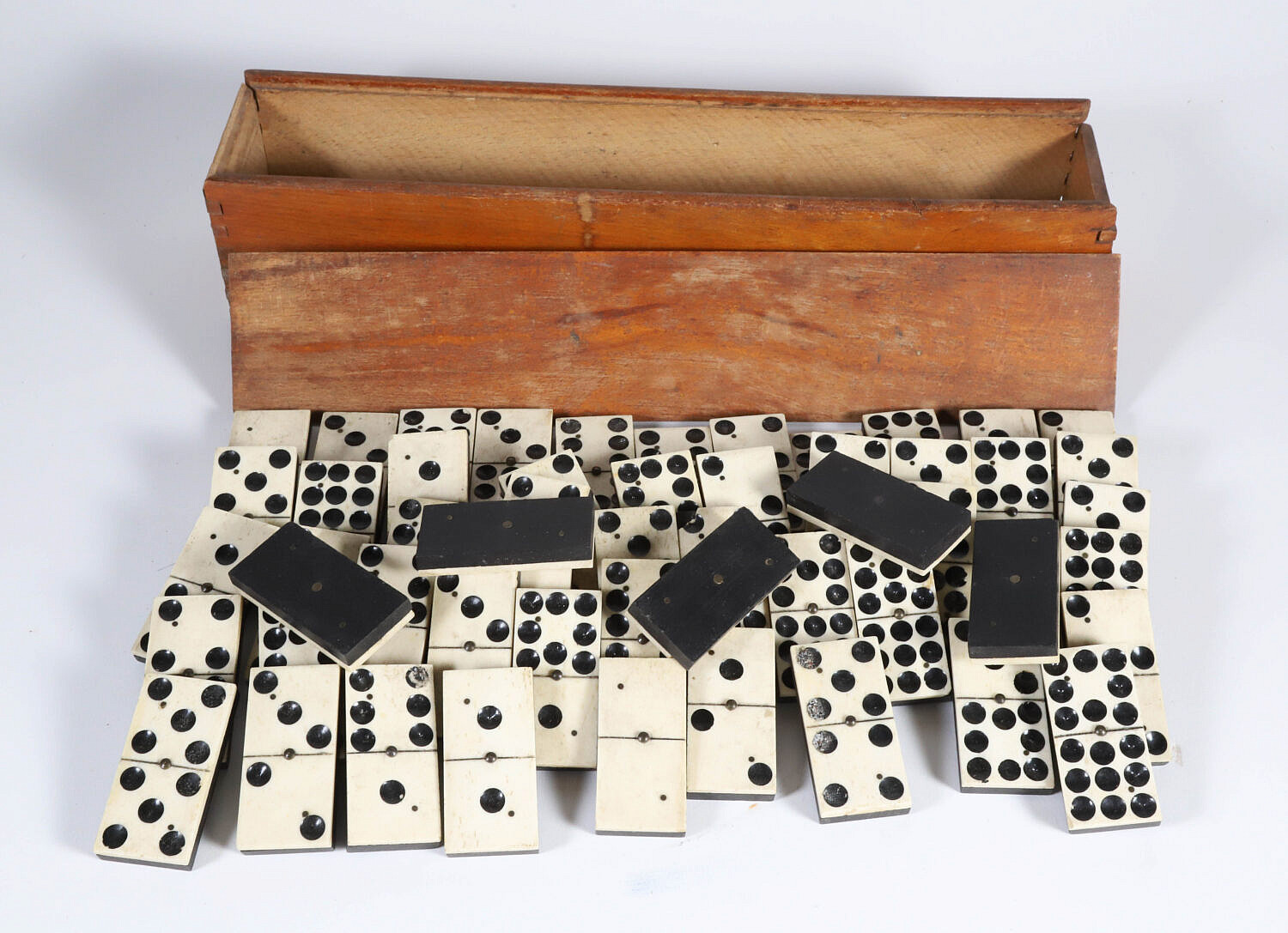 55 Piece Bone and Ebony Boxed Domino Set, 19th Century