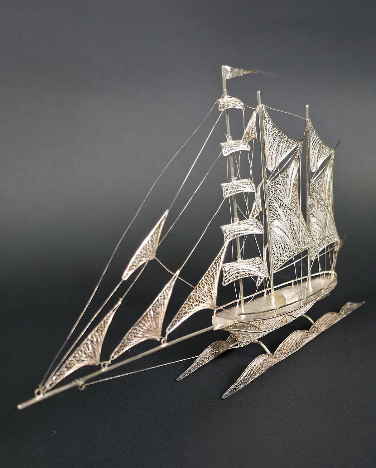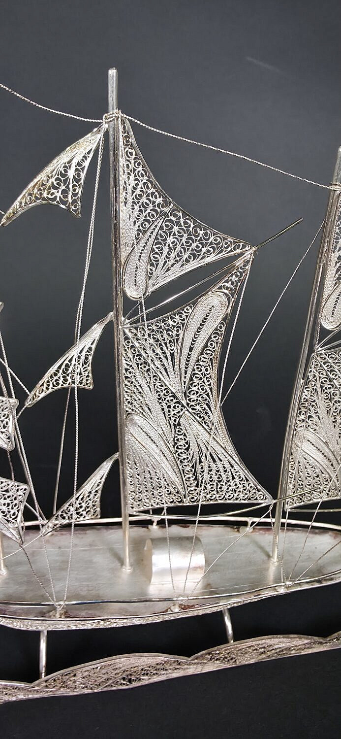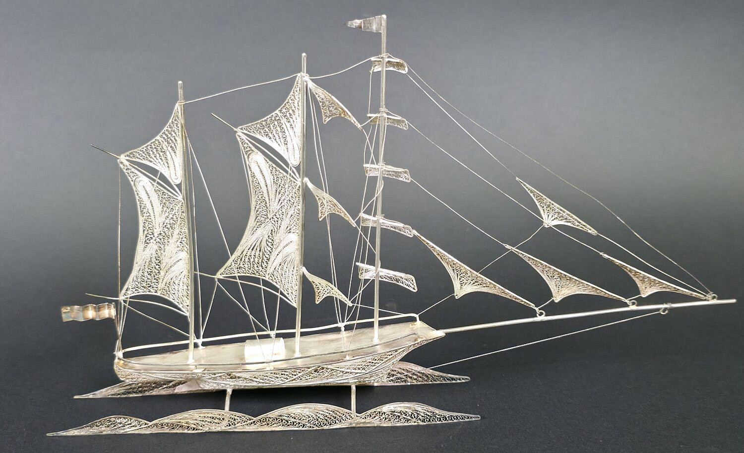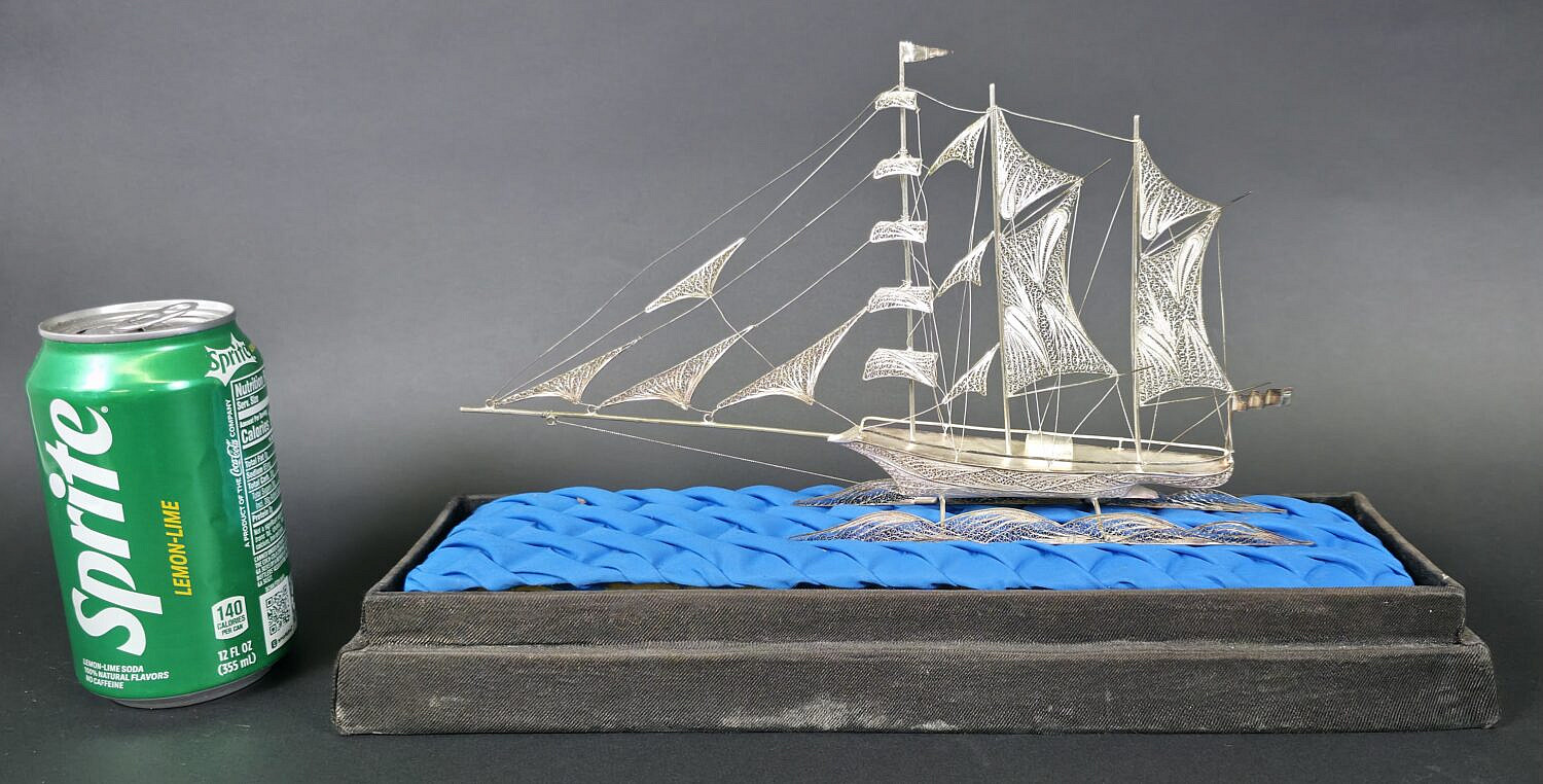 925 Sterling Silver Filigree Three Master Clipper Ship Model, 20th century