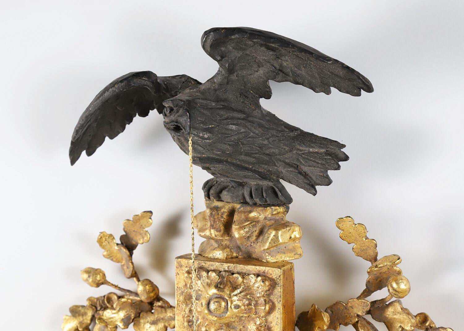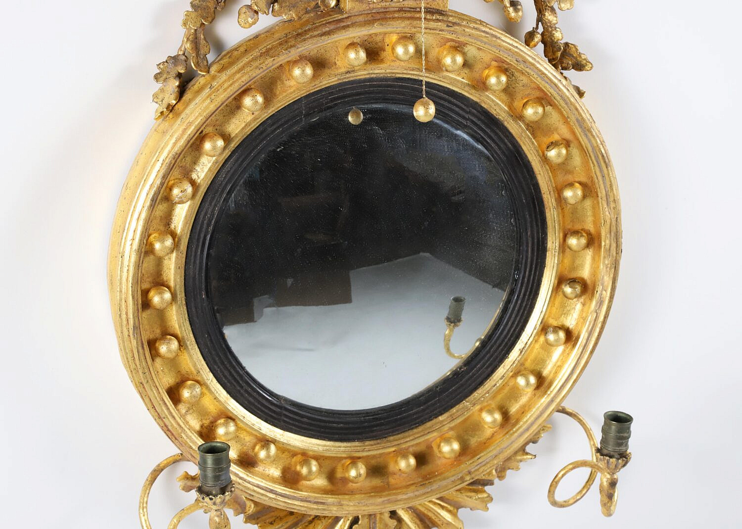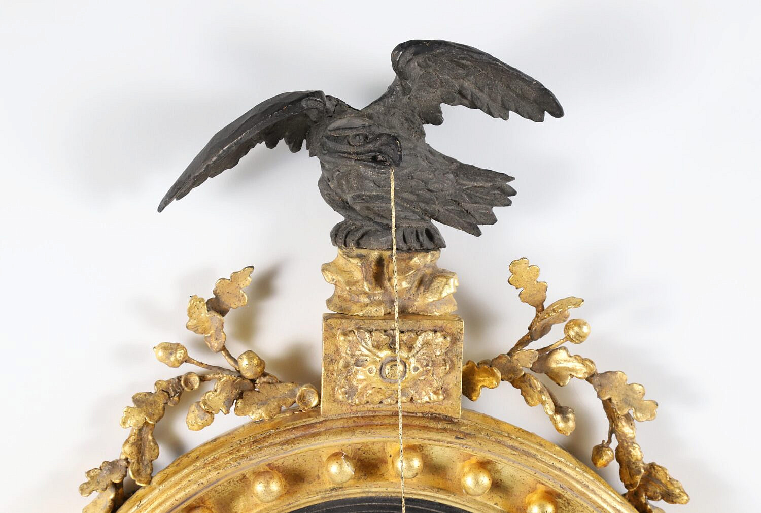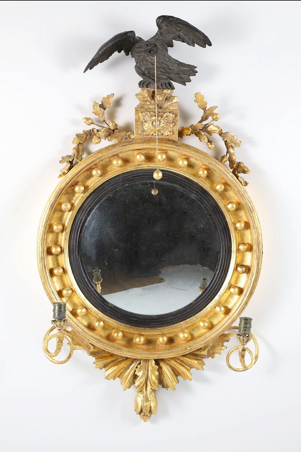 American Carved and Gilt Girondale Mirror, early 19th Century, spread wing eagle pediment on rock formation, flanked by acorn springs, 26 spherules, ebony reeded liner, foliage drop pediment flanked by two candle arms