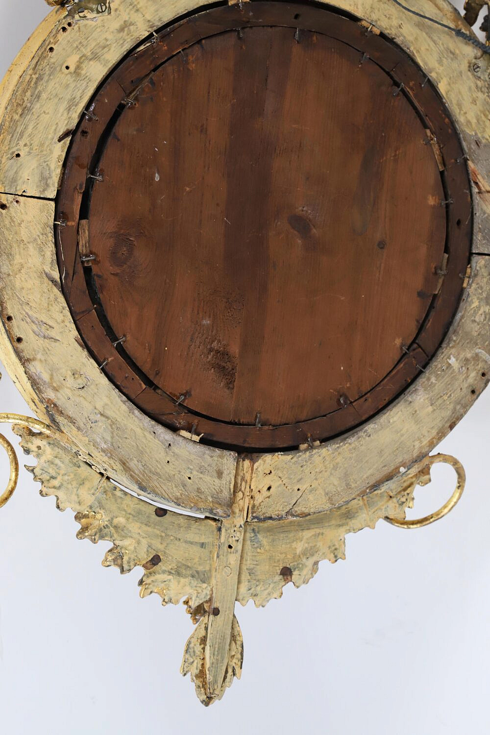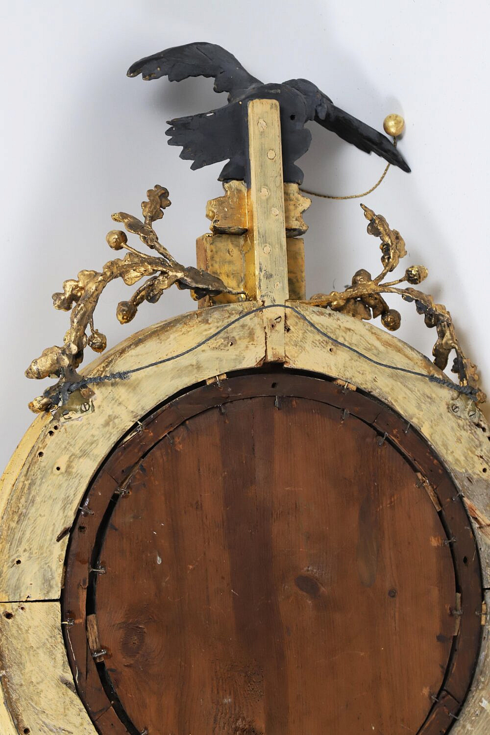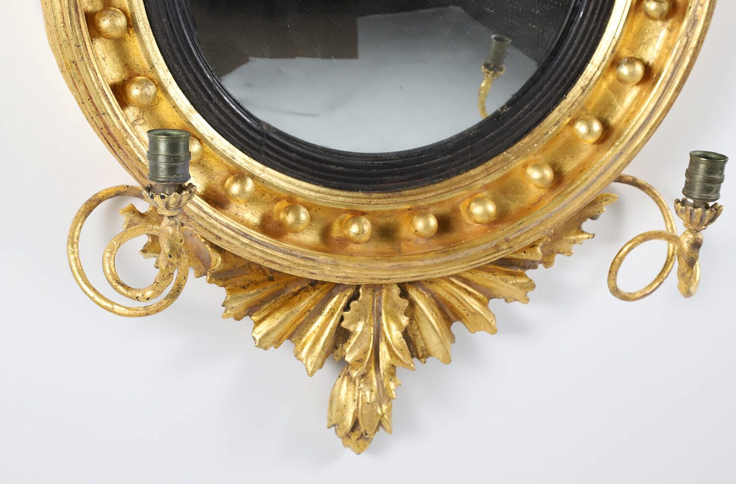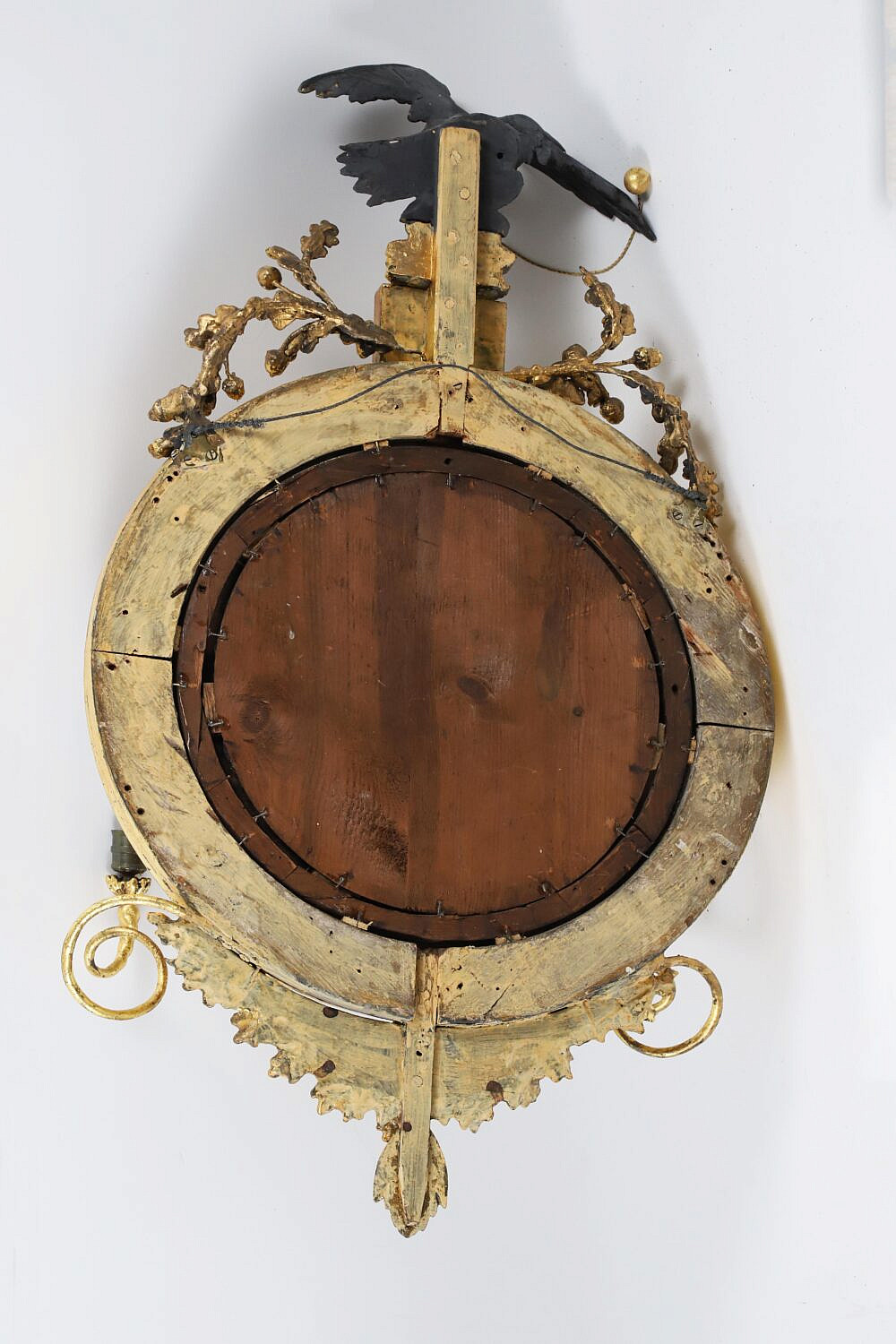 American Carved and Gilt Girondale Mirror, early 19th Century, spread wing eagle pediment on rock formation, flanked by acorn springs, 26 spherules, ebony reeded liner, foliage drop pediment flanked by two candle arms