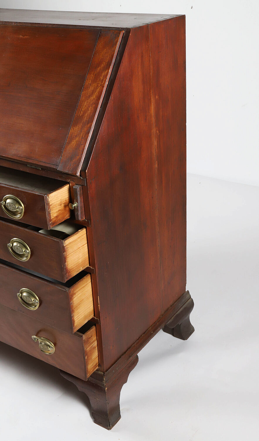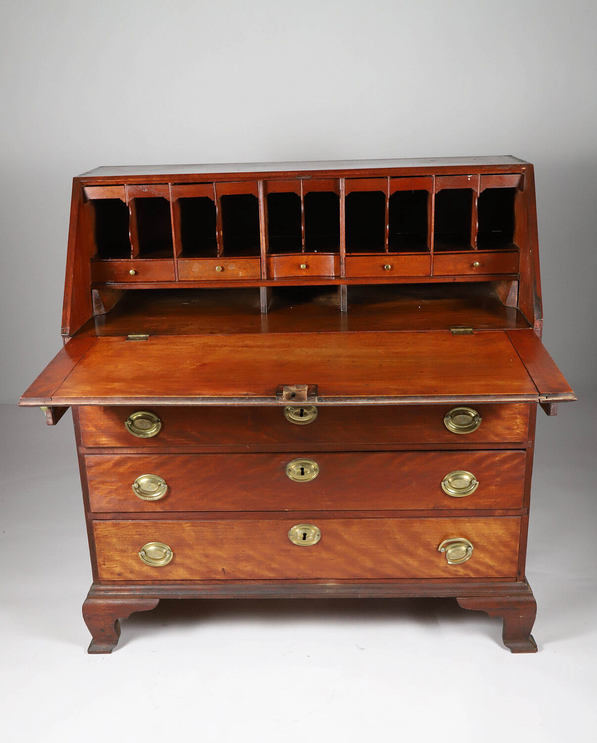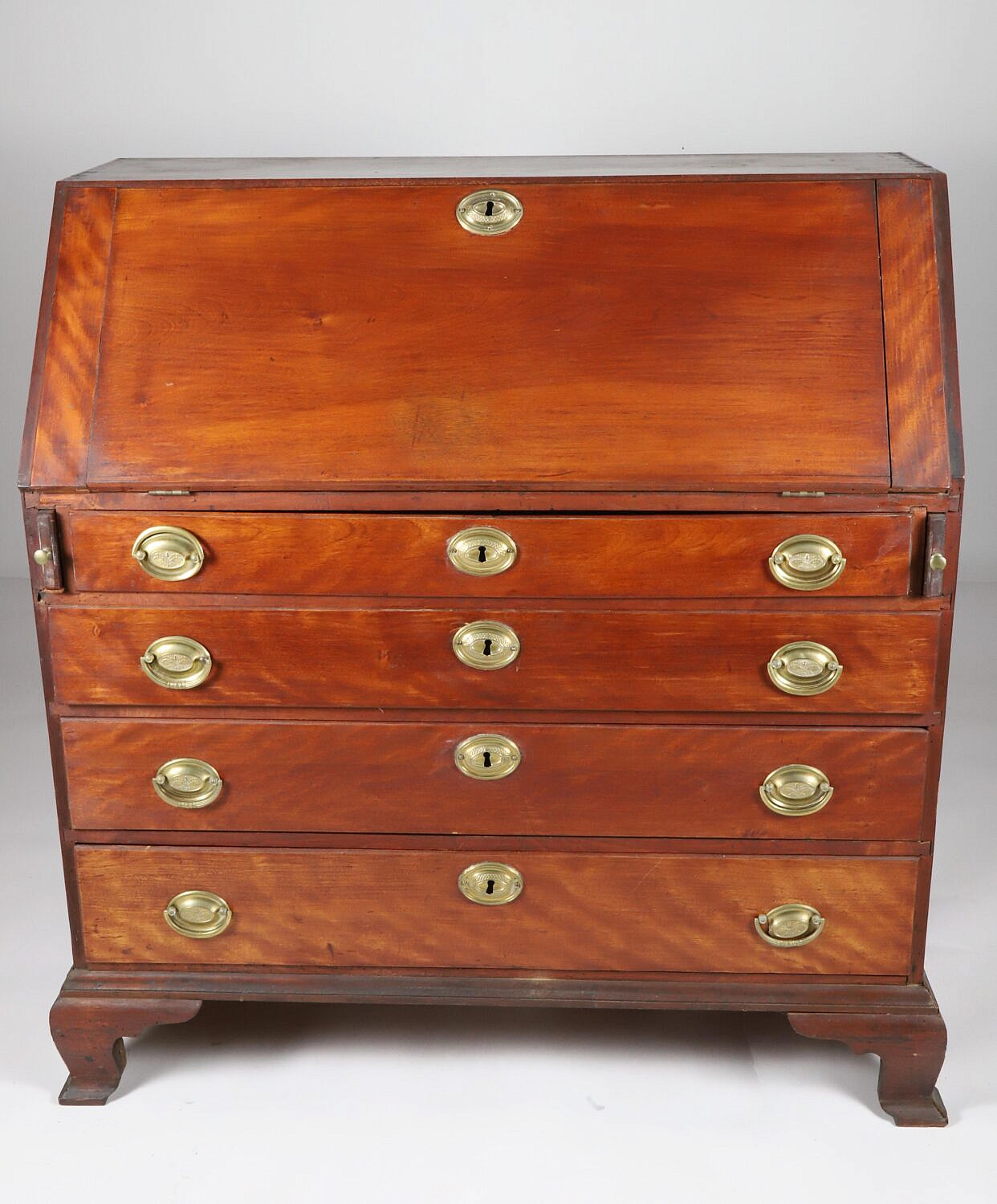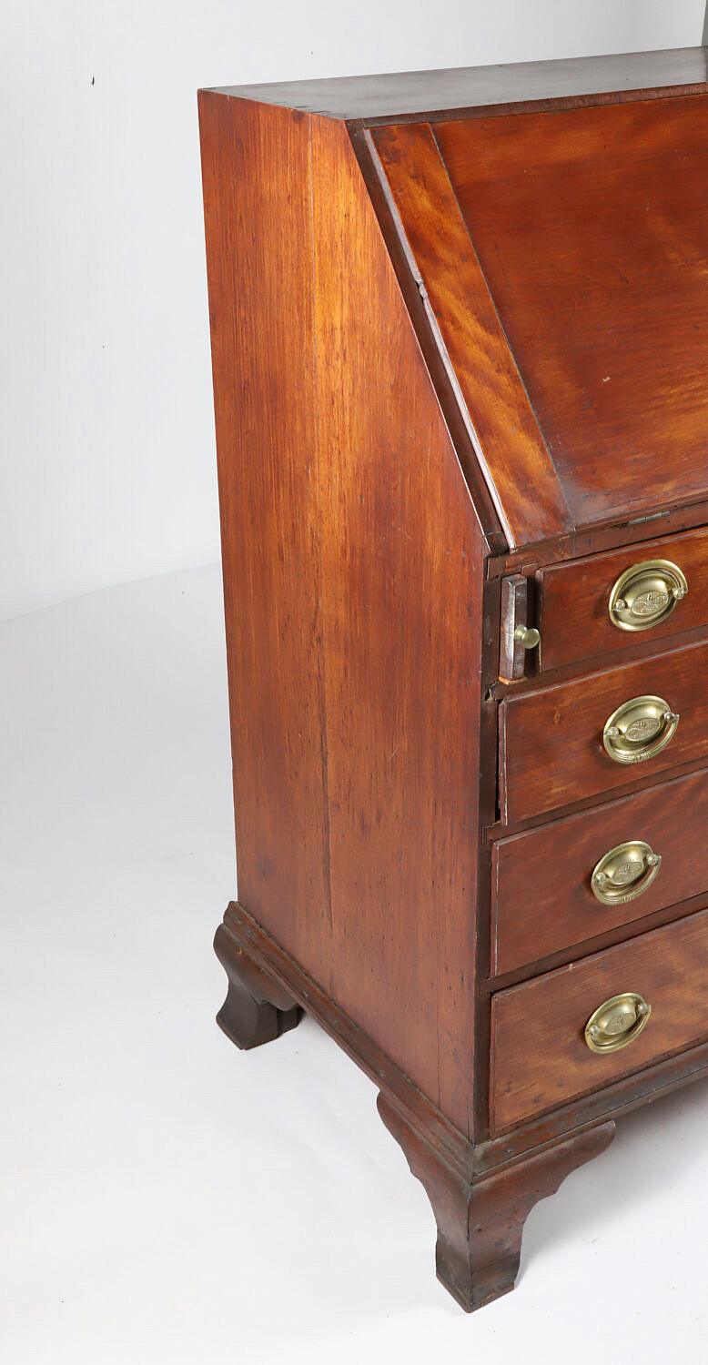 American Chippendale Flame Birch and Mahogany Slant Front Desk, 18th Century, the slant lid opens over lopers to reveal numerous cubby holes and drawers, over four graduated drawers, on bracket feet