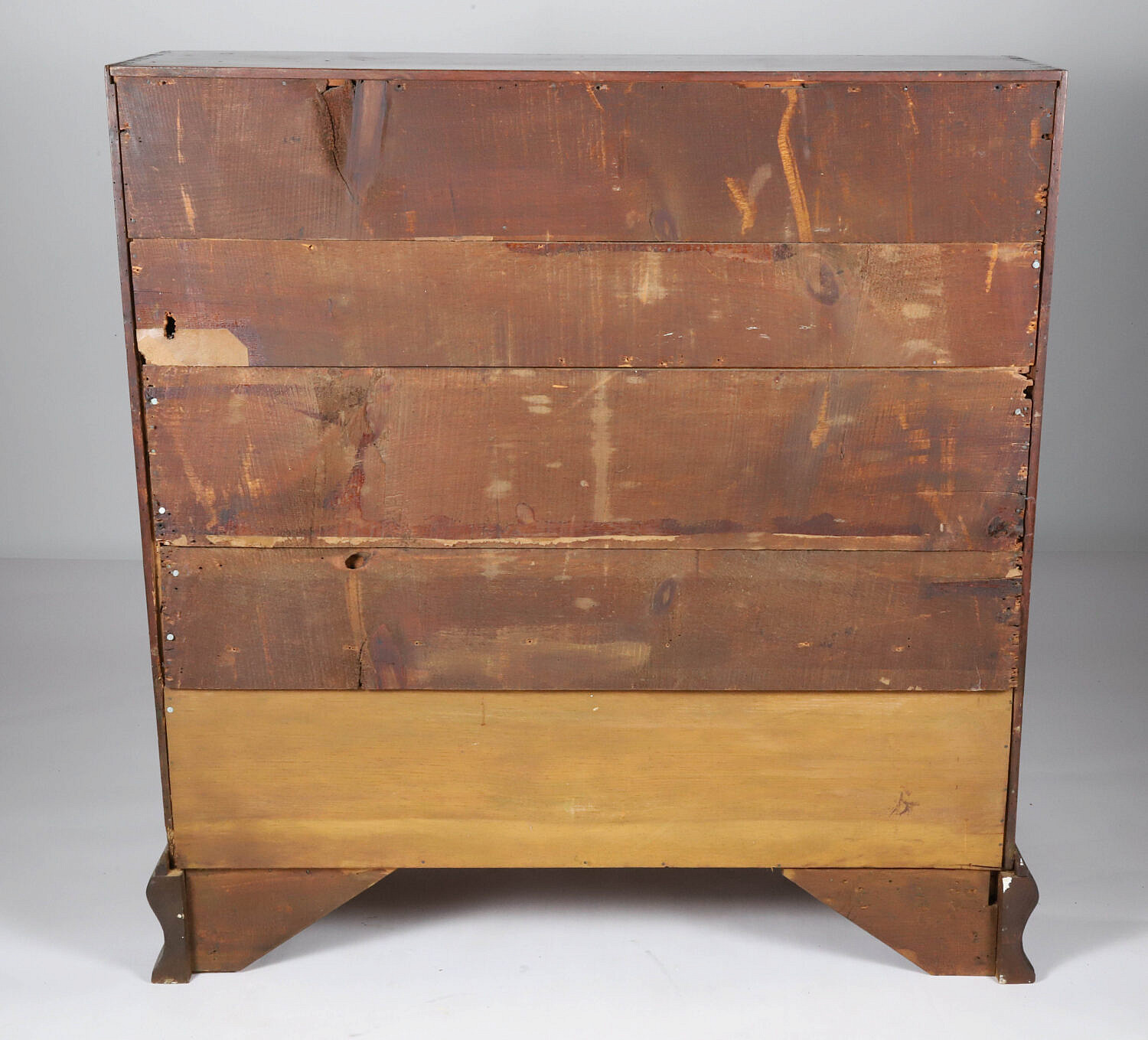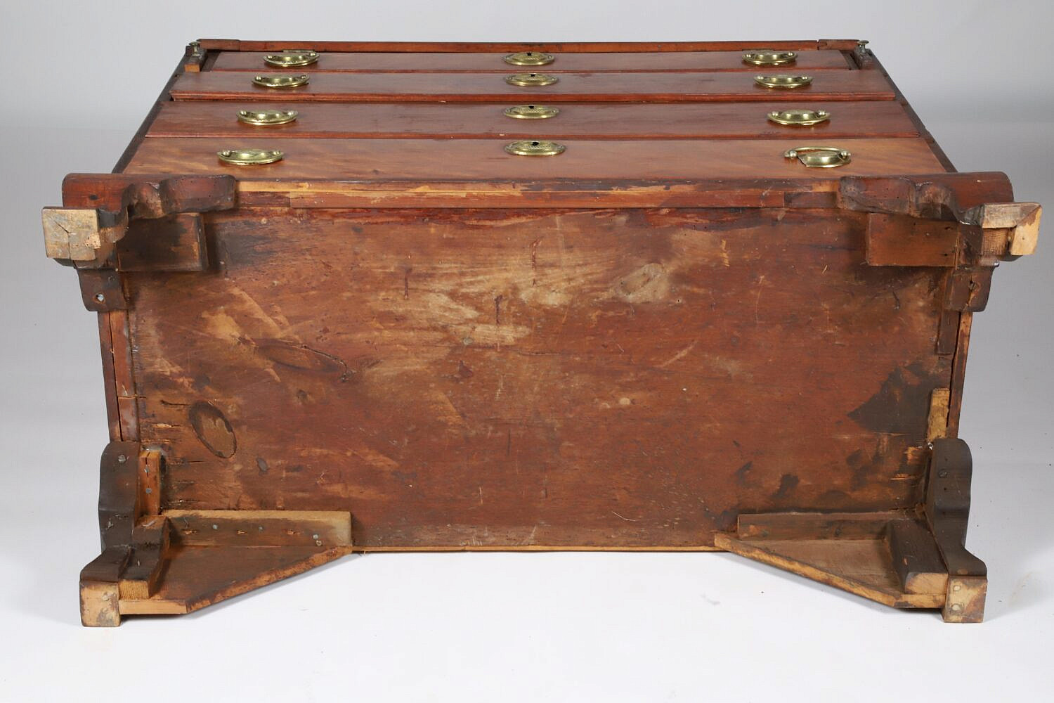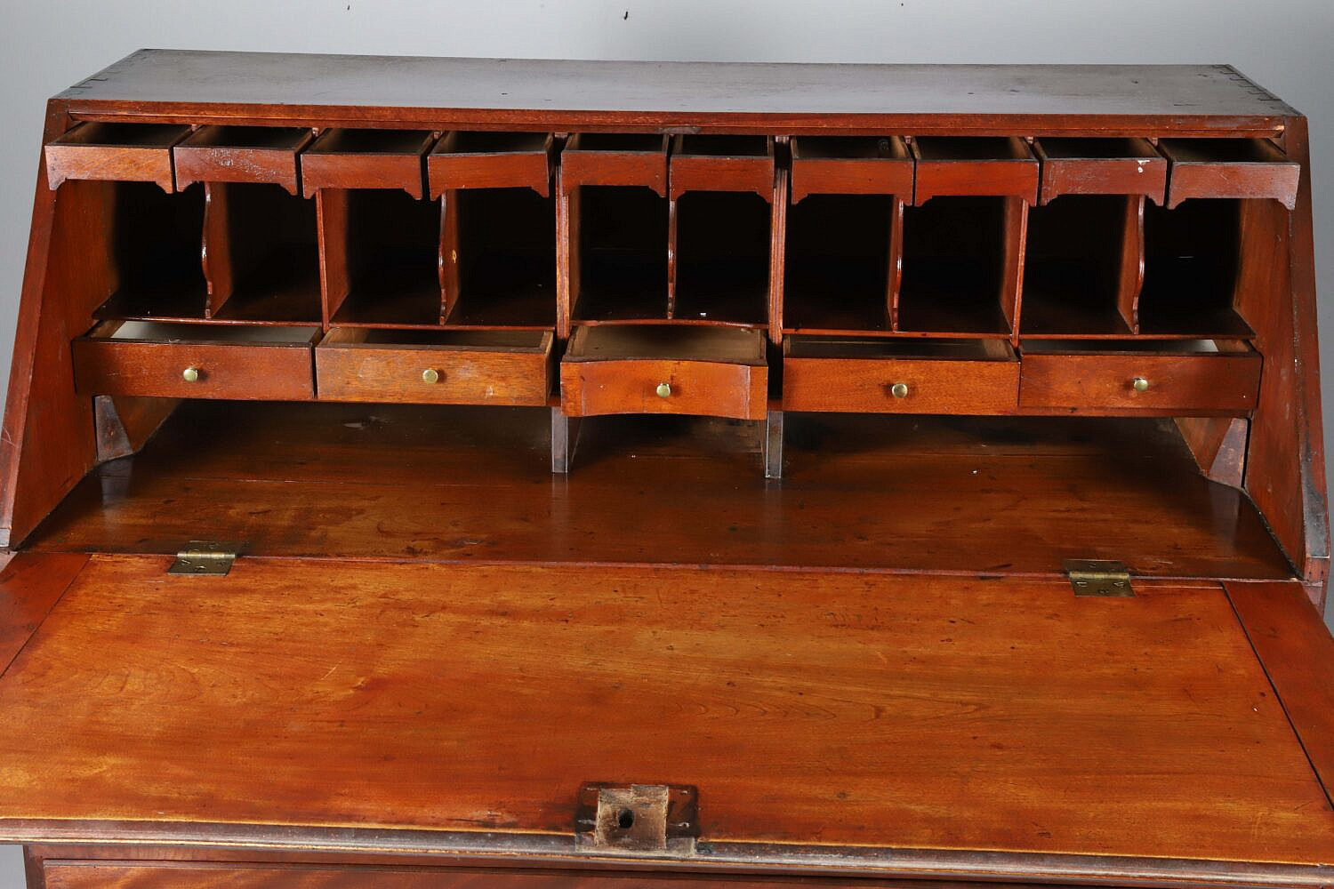 American Chippendale Flame Birch and Mahogany Slant Front Desk, 18th Century, the slant lid opens over lopers to reveal numerous cubby holes and drawers, over four graduated drawers, on bracket feet