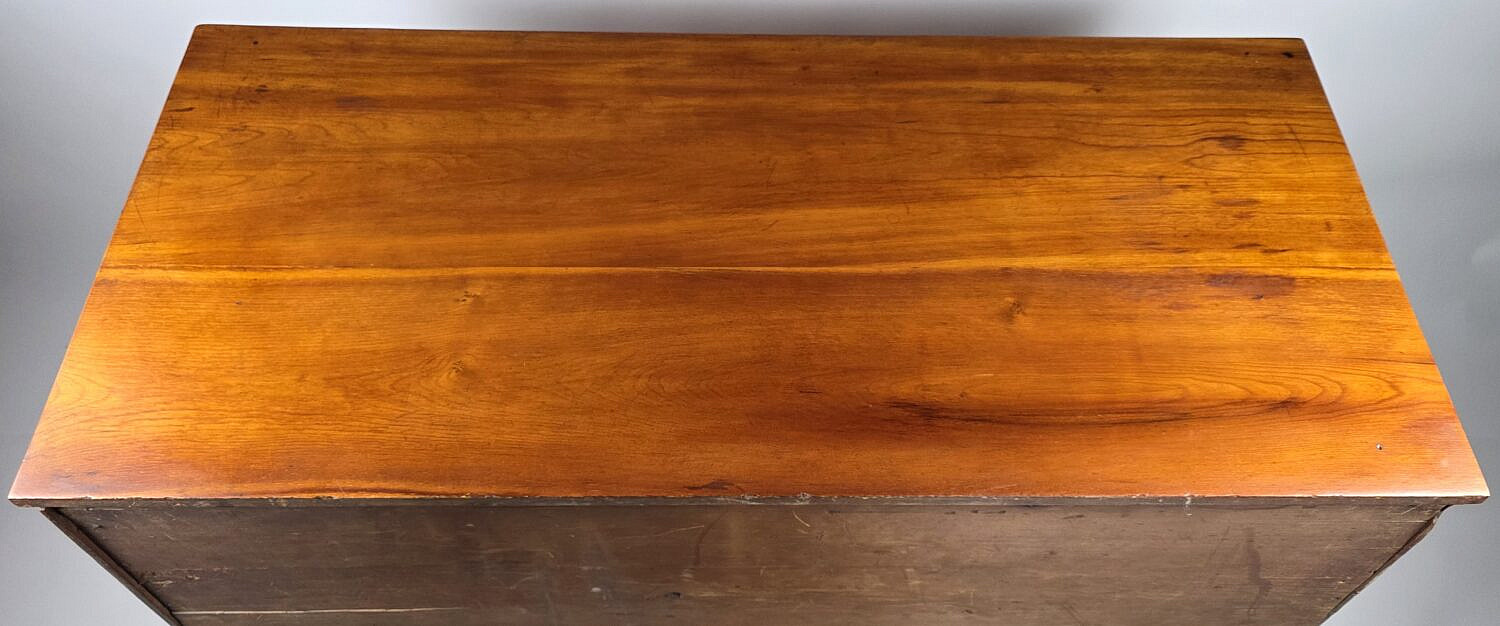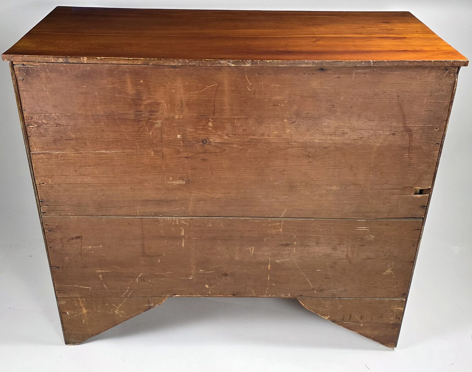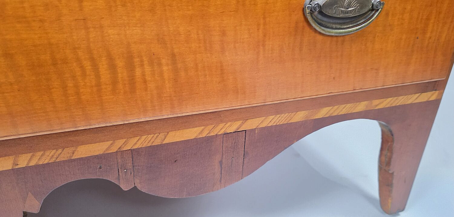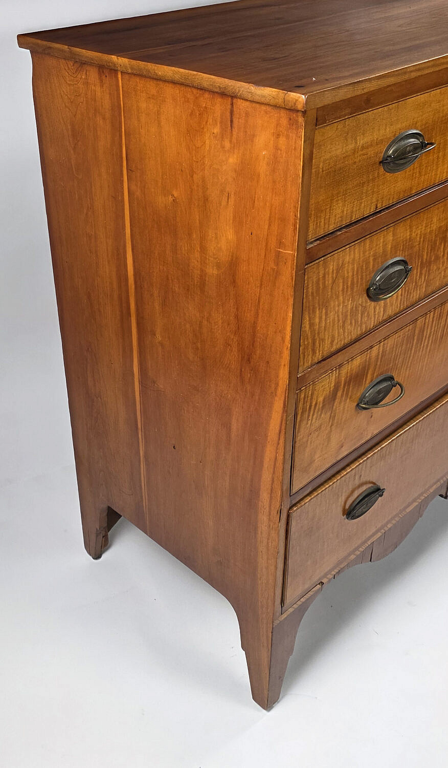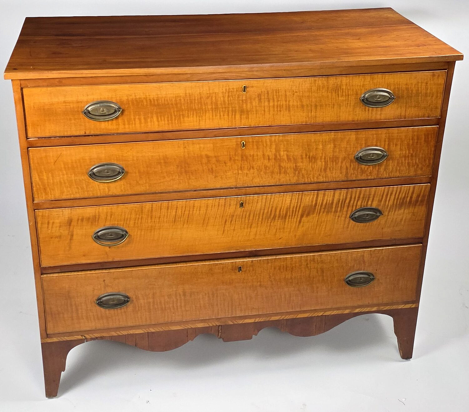 Antique American Tiger Maple and Cherry Four Drawer Chest of Drawers, 19th century, with shaped skirt, crossband inlays