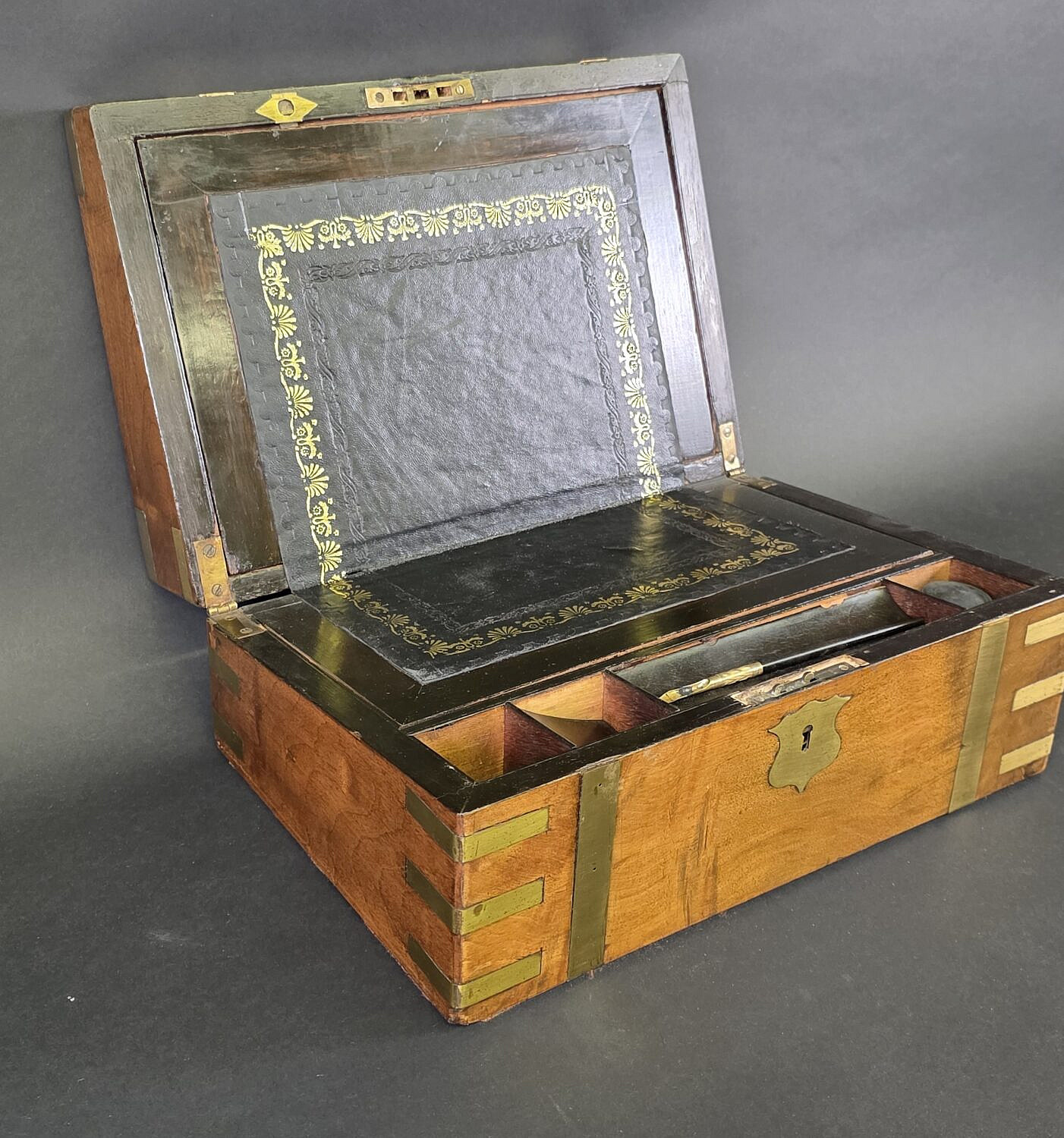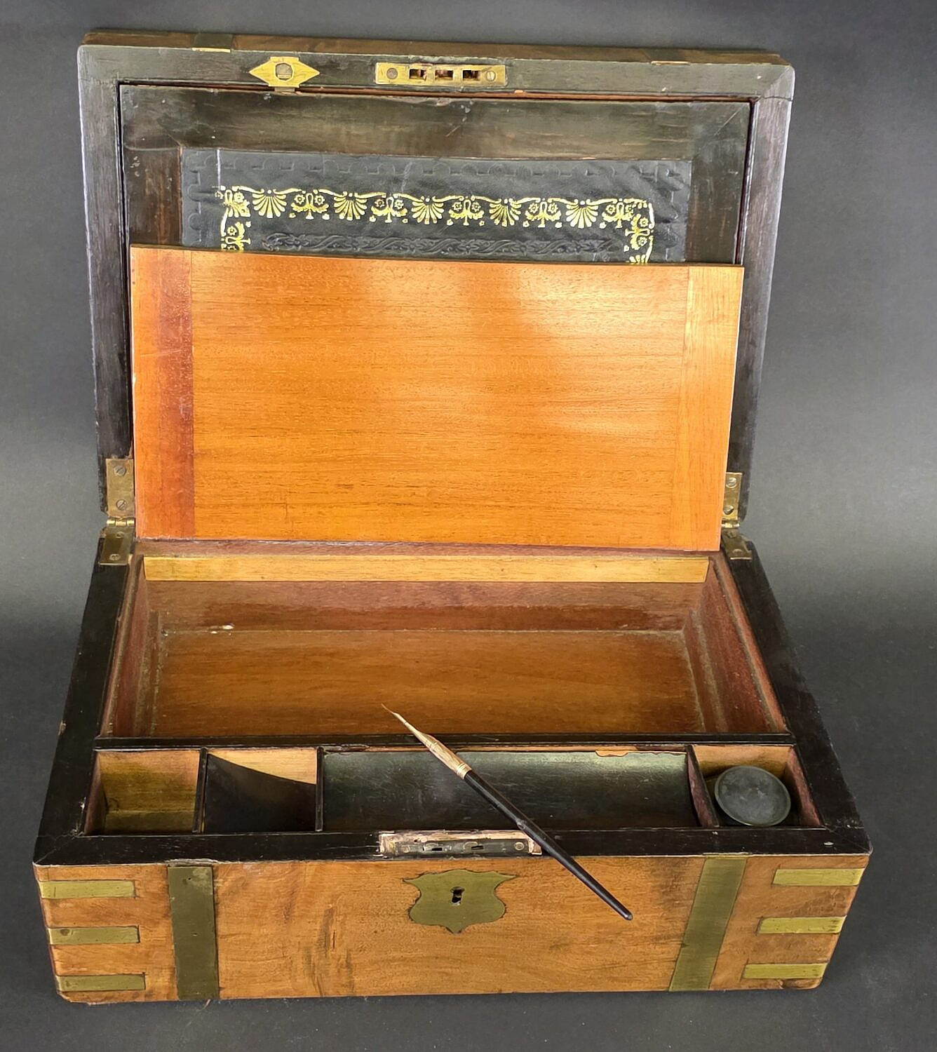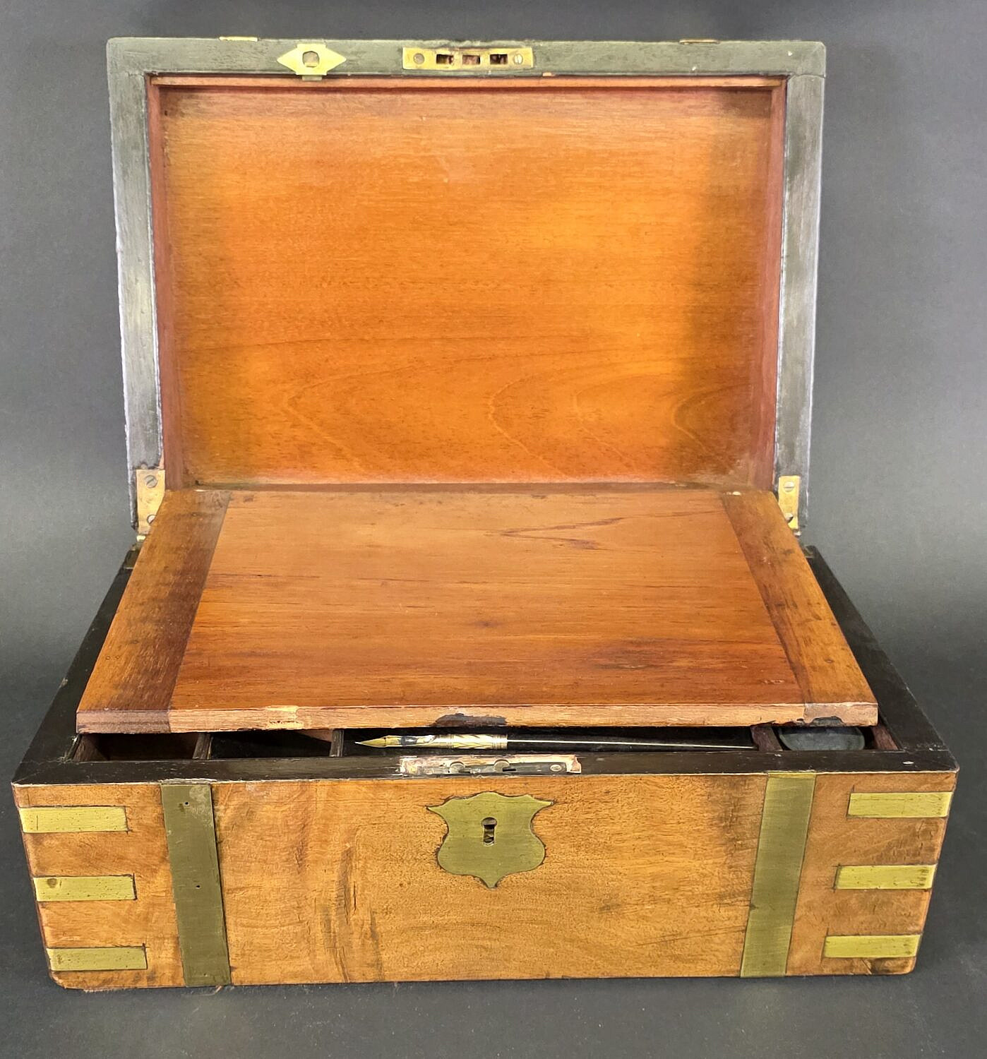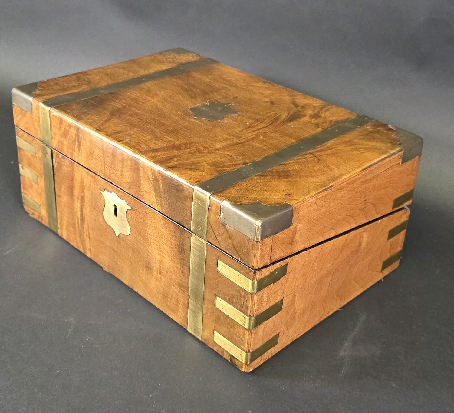 Antique Brass Bound Flame Birch Campaign Traveling Lap Desk, 19th century