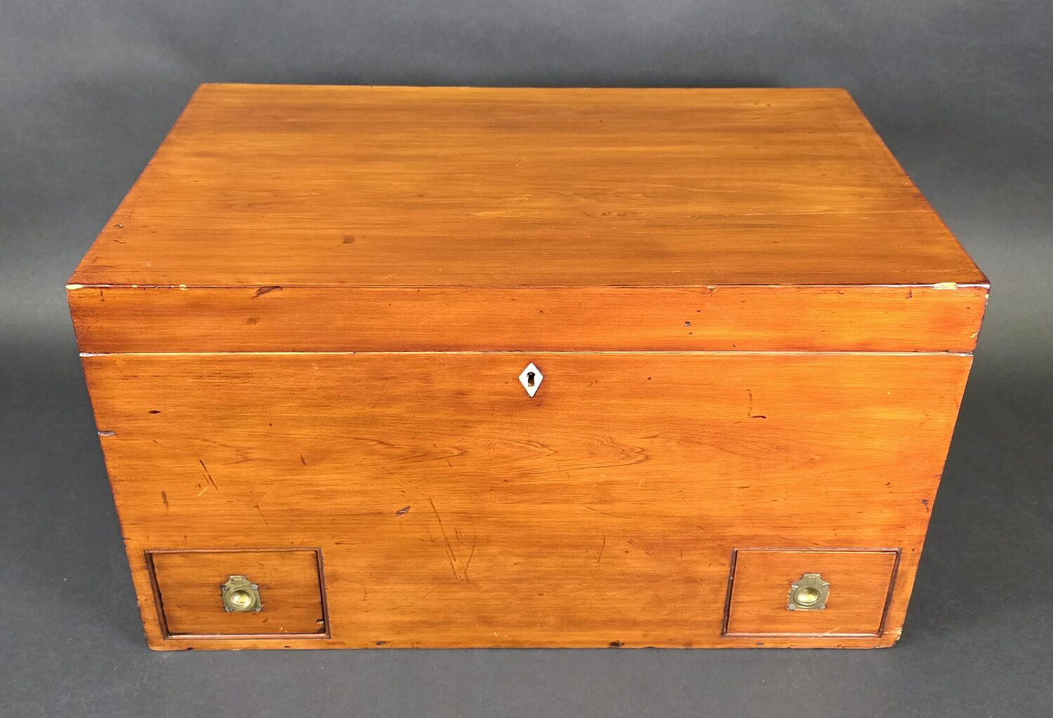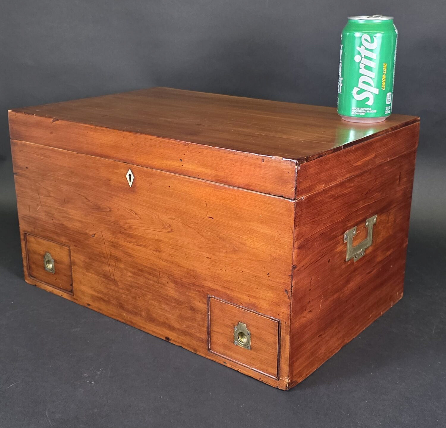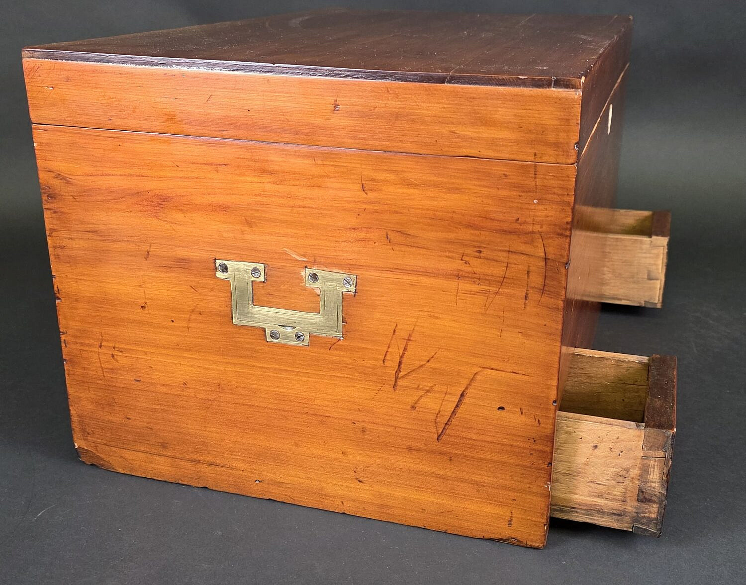 Antique Campaign Camphorwood Storage Box, 19th century, with inlaid escutcheon and recessed brass drawer pulls and carrying handles.