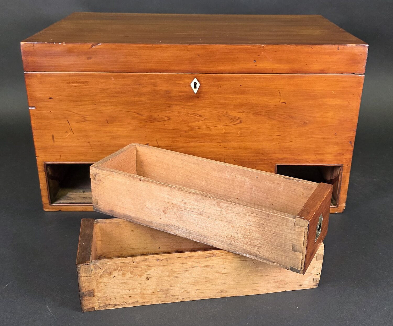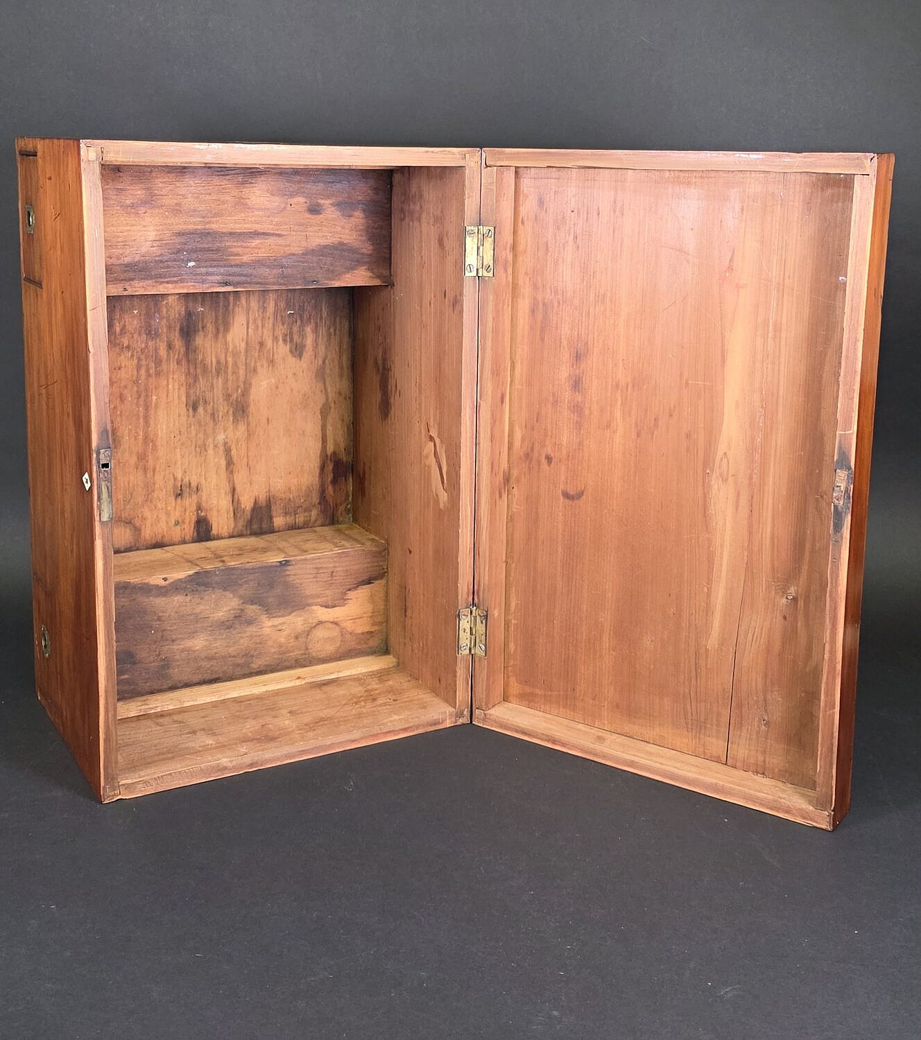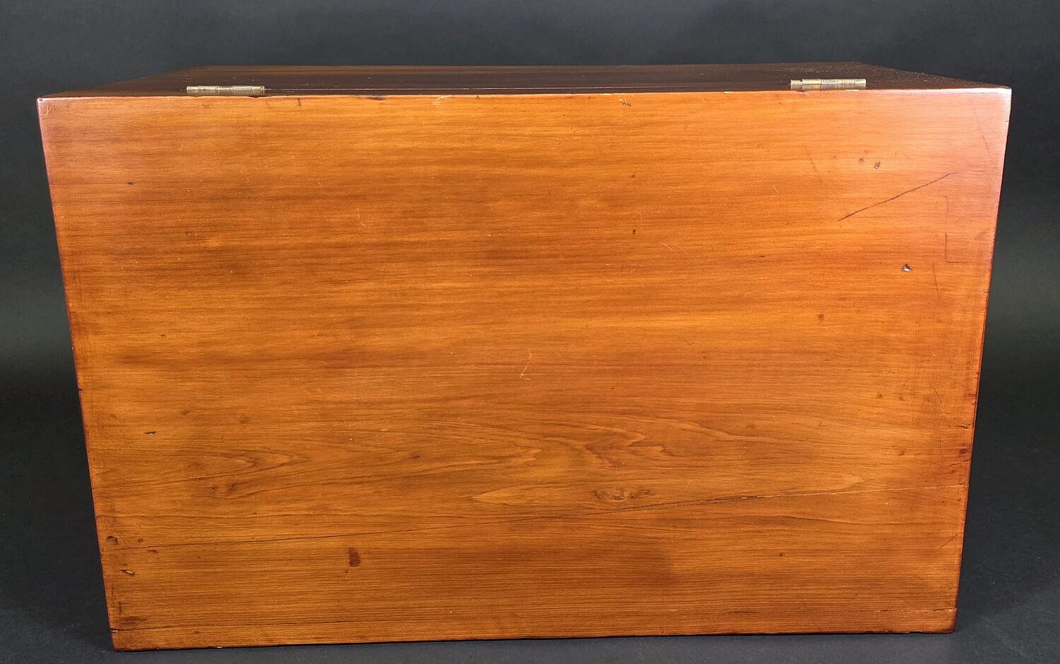 Antique Campaign Camphorwood Storage Box, 19th century, with inlaid escutcheon and recessed brass drawer pulls and carrying handles.