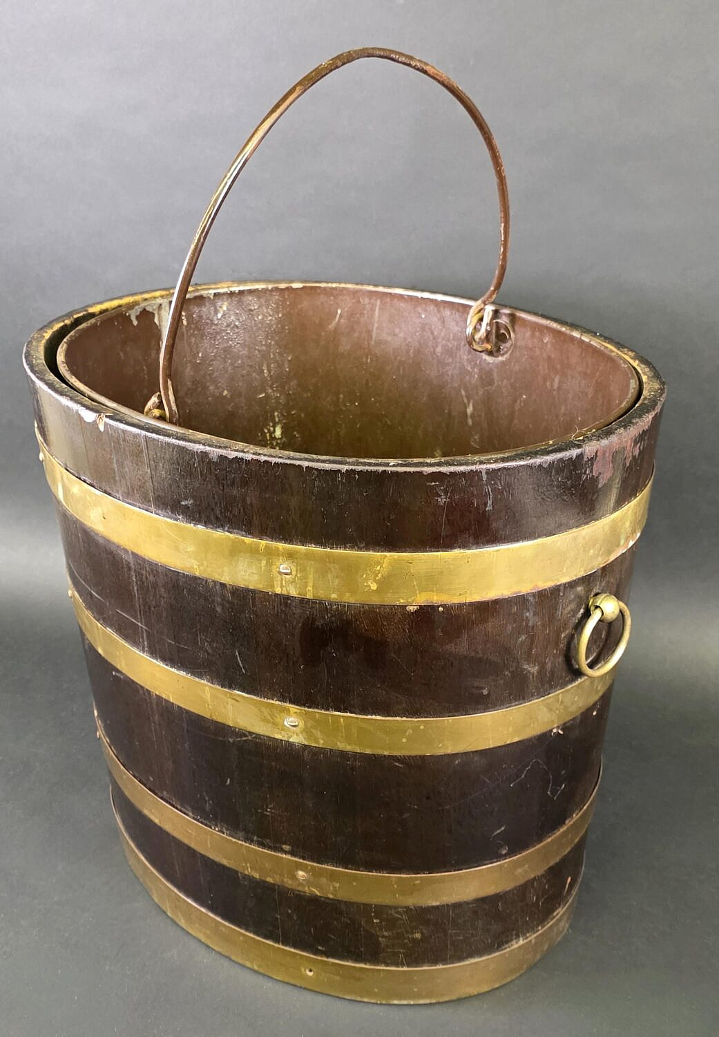 Antique English Oak Brass Bound Peat Bucket, 19th Century Consign Now DeptAmericana and Folk Arts, Decorative Arts, Furniture/Decorative ArtsSizeHeight 15.25 in. Width 19 in. Depth 13.75 in. Antique English Oak Brass Bound Peat Bucket, 19th Century, swing handle, removable brass scuttle lining, and loop handles. Height 15.25 in. Width 19 in. Depth 13.75 in. Please note that this auction has ended. Click here for an overview of this auction.