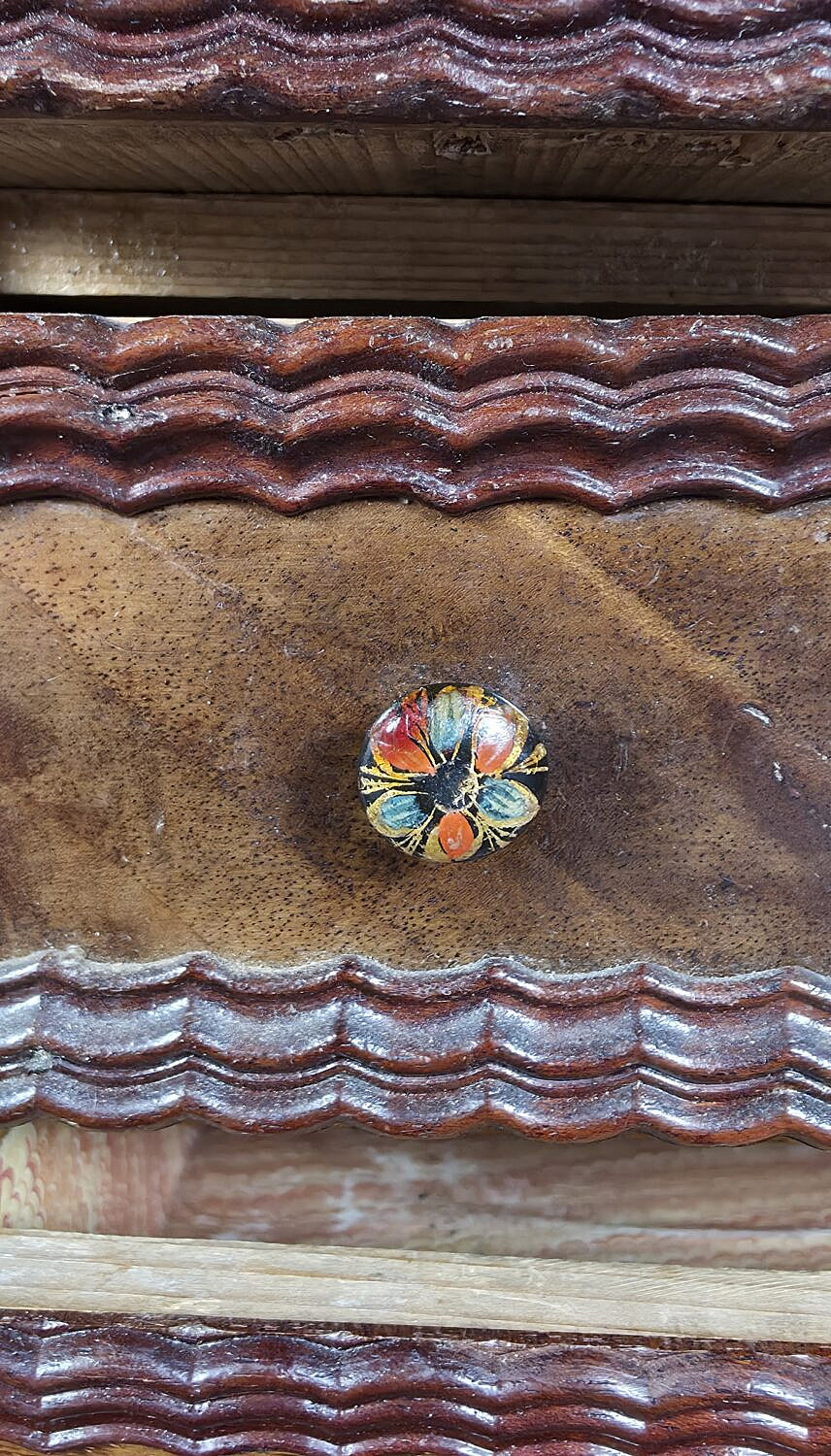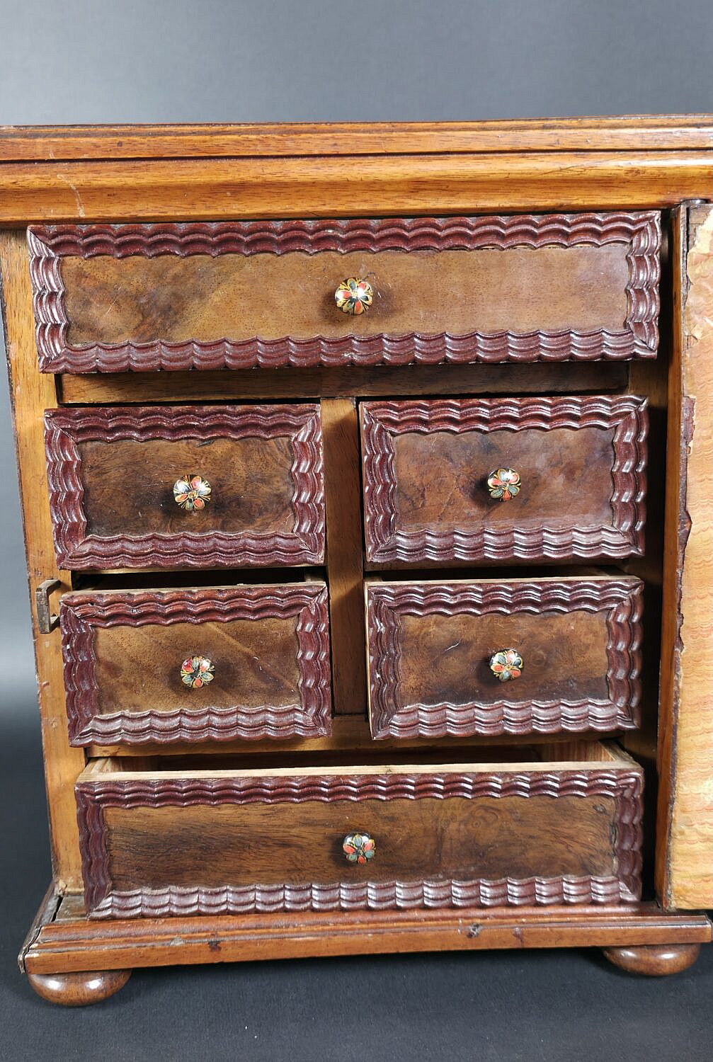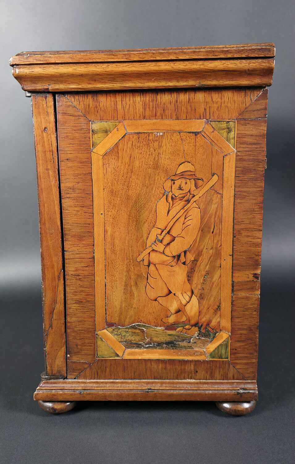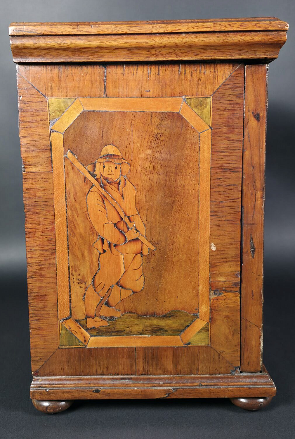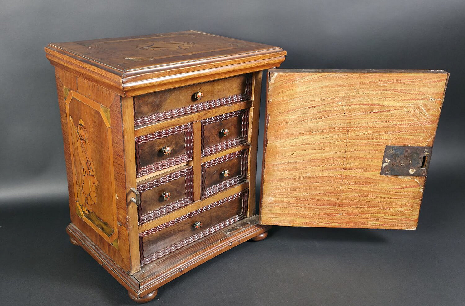 Antique English Regency Inlaid Six-Drawer Spice Cabinet, 19th century Consign Now DeptDecorative Arts, Furniture/Decorative ArtsSizeHeight 13 in. Width 11 in. Depth 8.5 in. Antique English Regency Inlaid Six-Drawer Spice Cabinet, 19th century, multiwood construction, with floral, bird, and figural inlay panels, a cabinet door exposing six drawers, each with three layers of scalloped edges and hand painted knob. Height 13 in. Width 11 in. Depth 8.5 in. Please note that this auction has ended. Click here for an overview of this auction.
