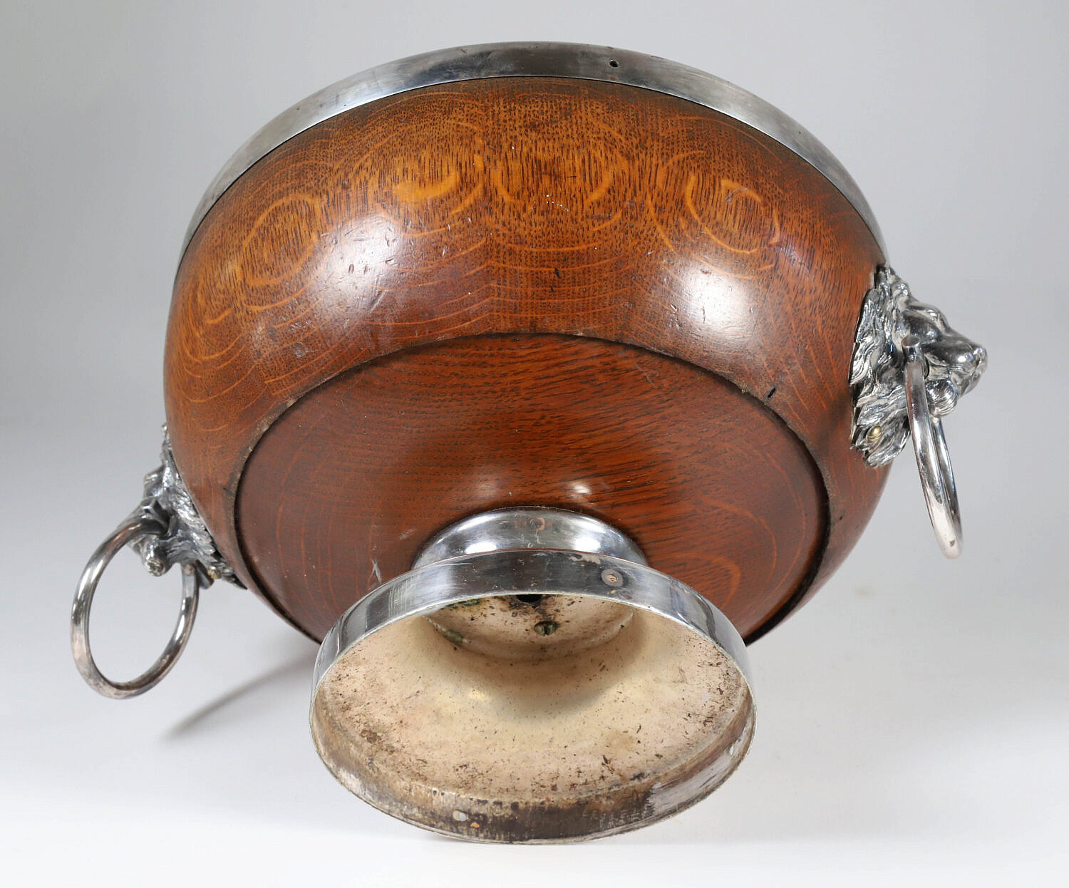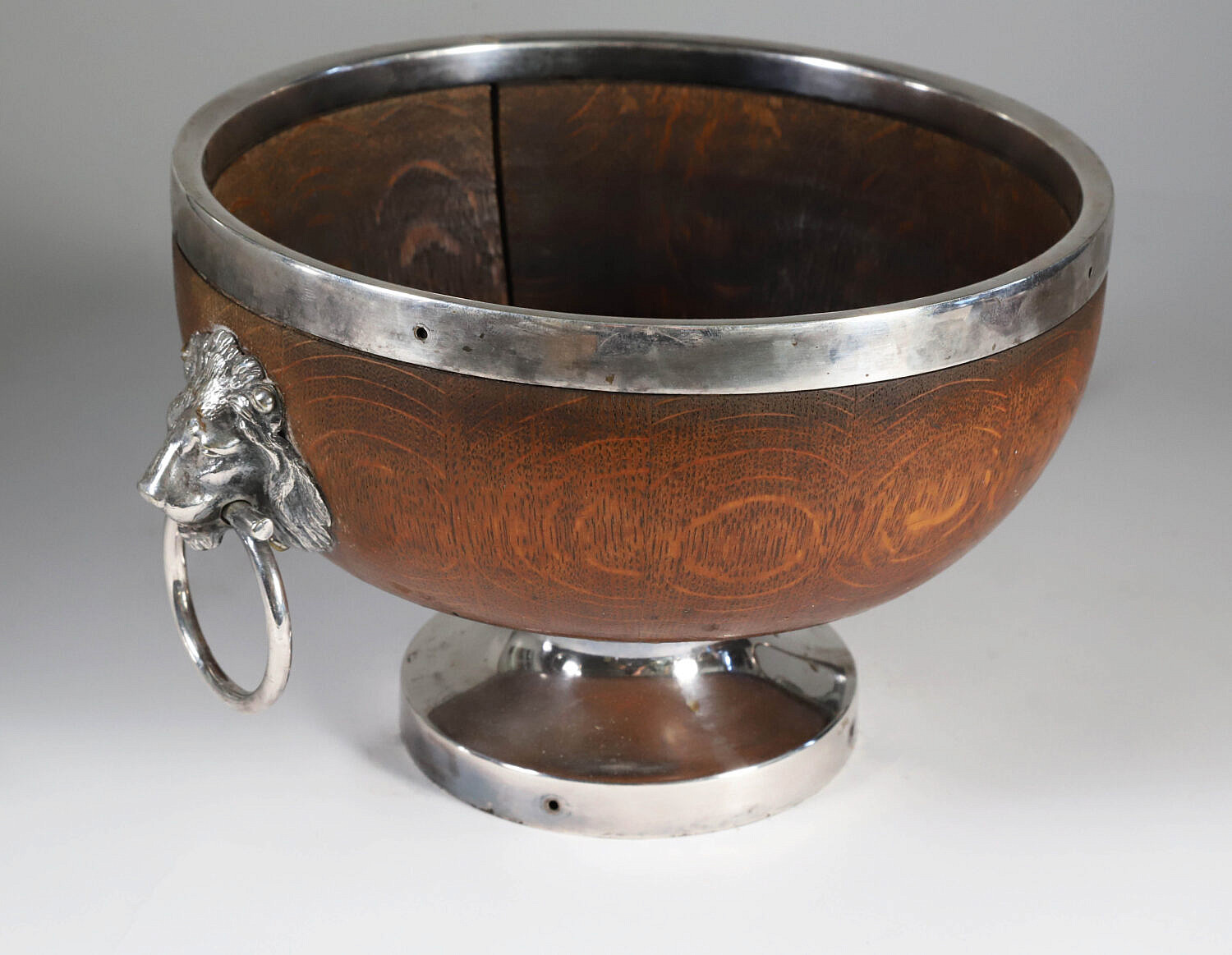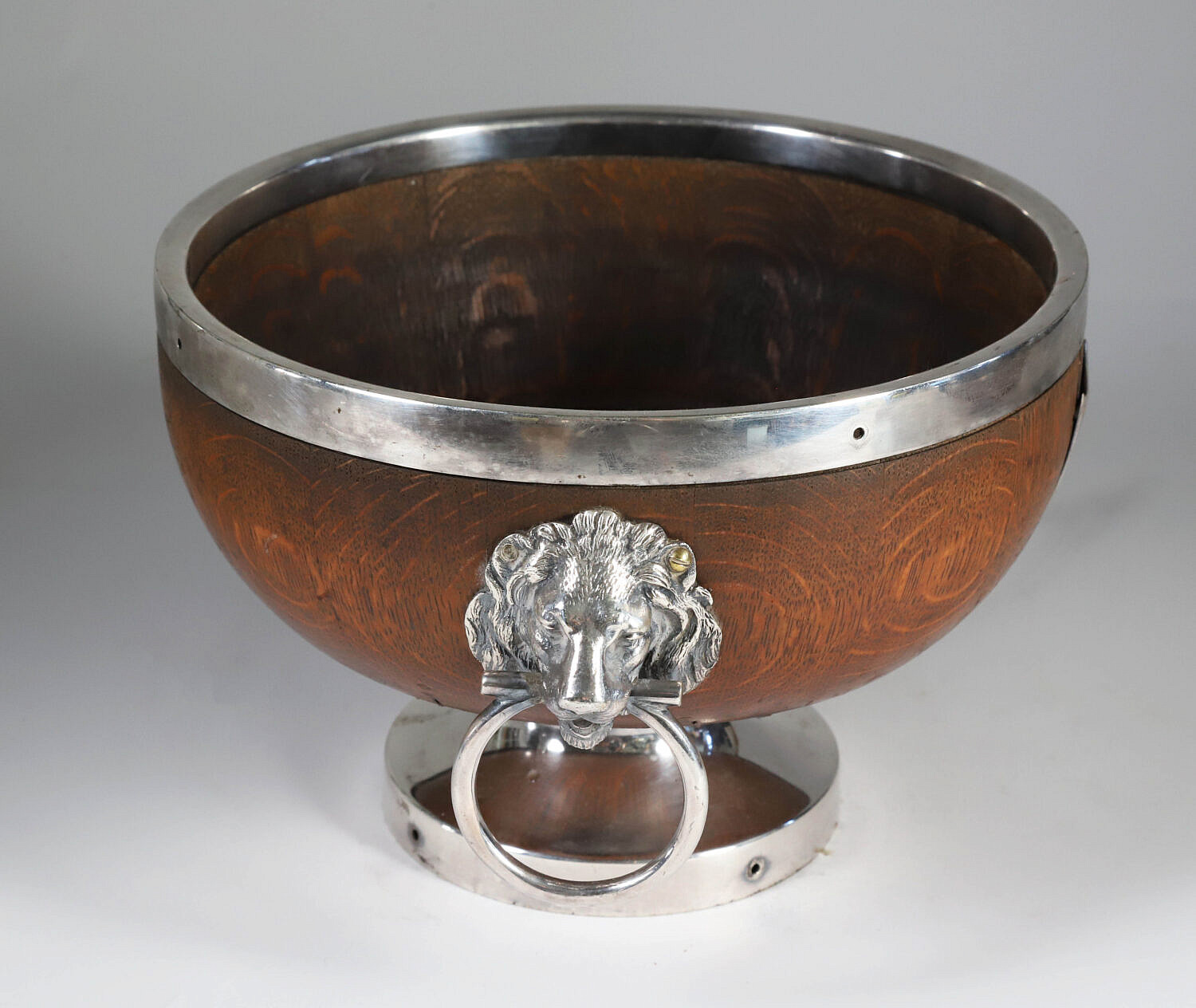 Antique English Silver Plated Oak Fruit Bowl, pedestal base, ringed lion handles, shield and rim