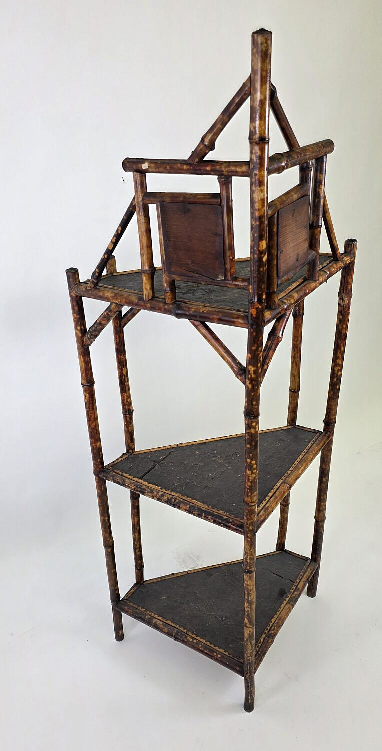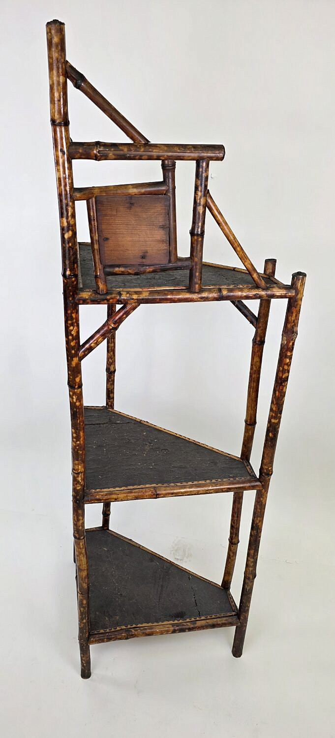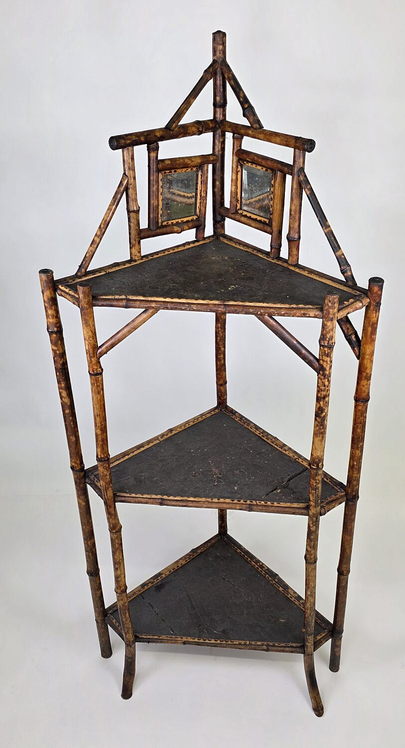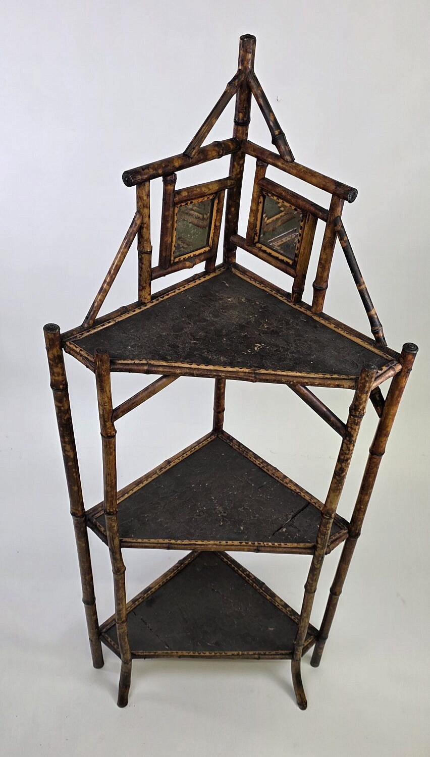 Antique English, “Tortoiseshell”, Bamboo Three-Tier Corner Shelf Etagere, 19th century, lacquered shelves and mirror backsplash.