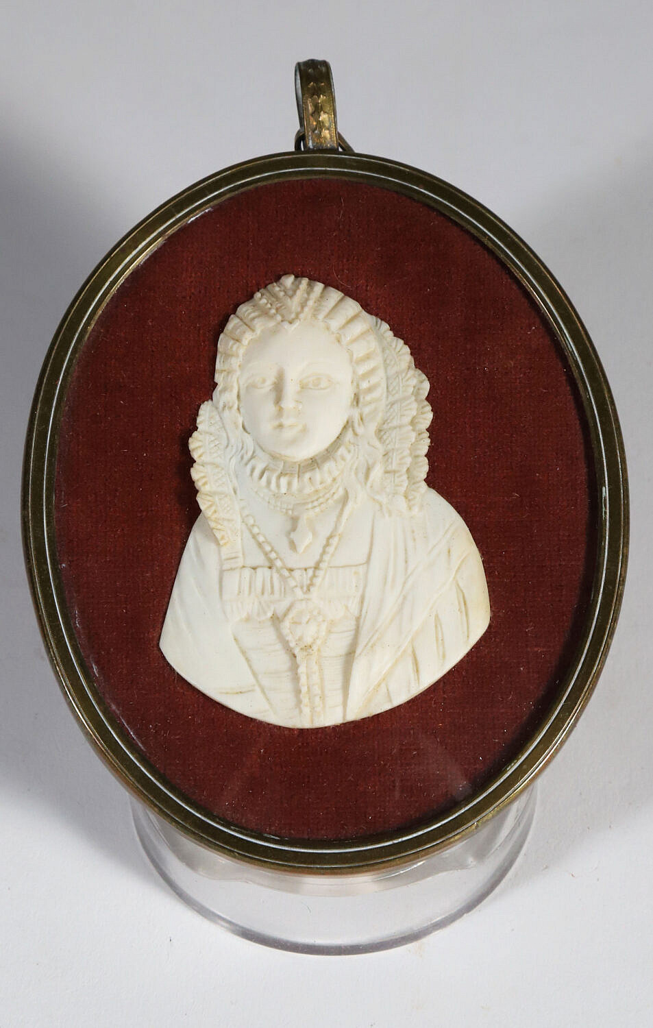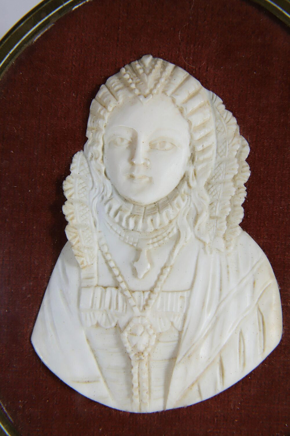 Antique Miniature Carved Portrait of an Elizabethan Woman, in brass frame