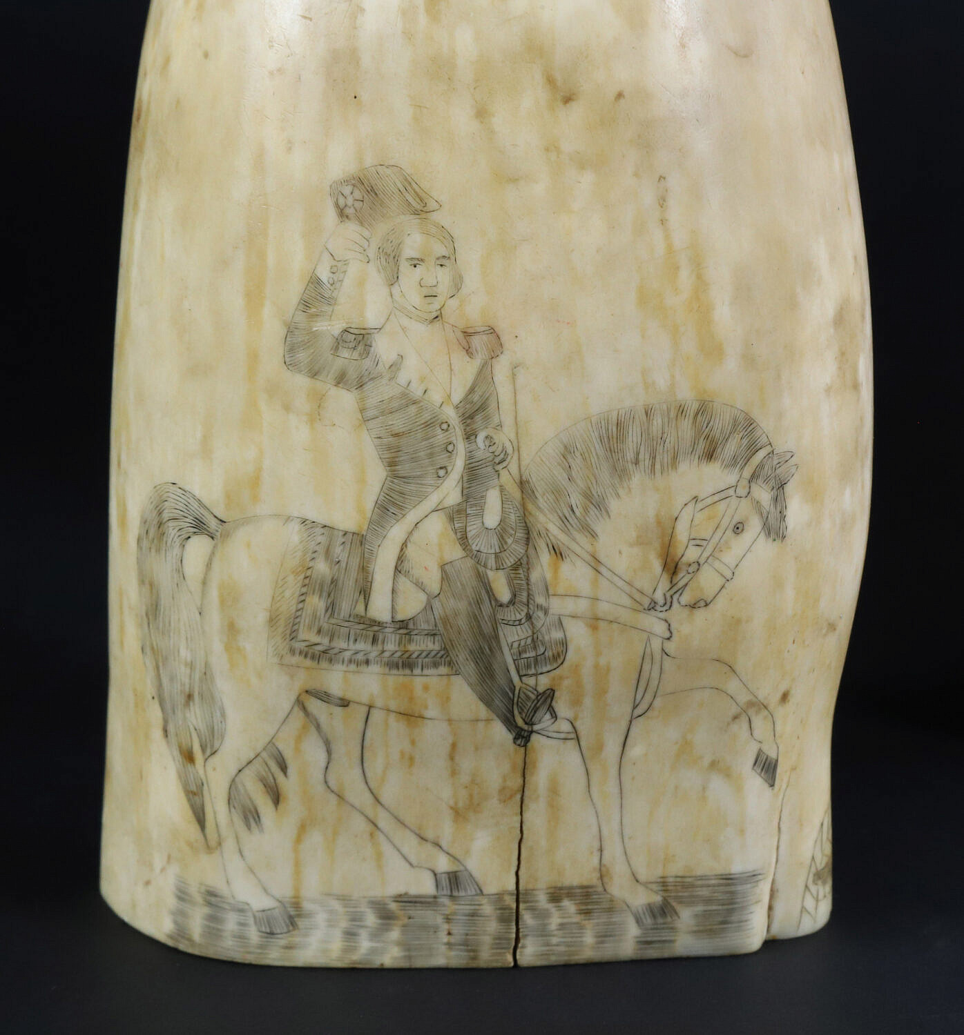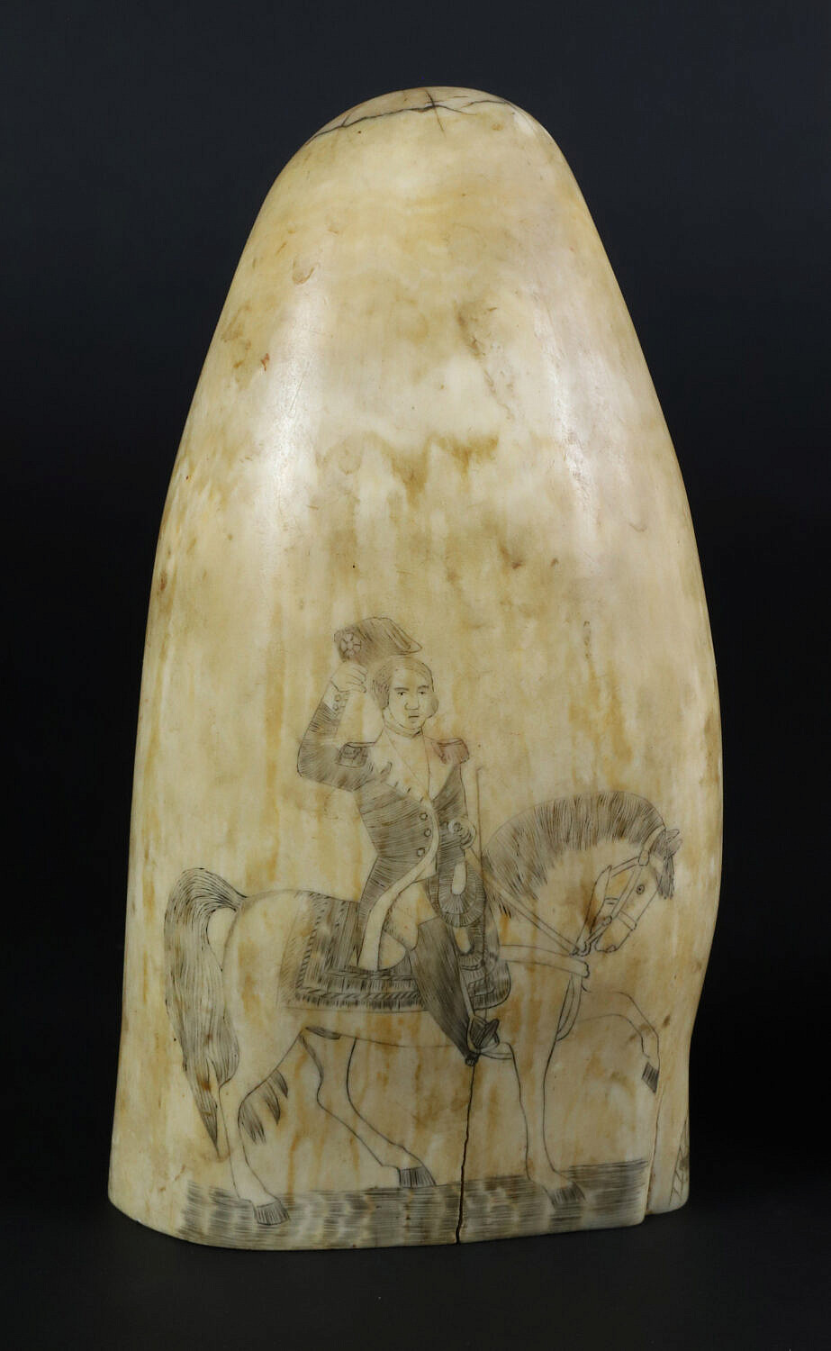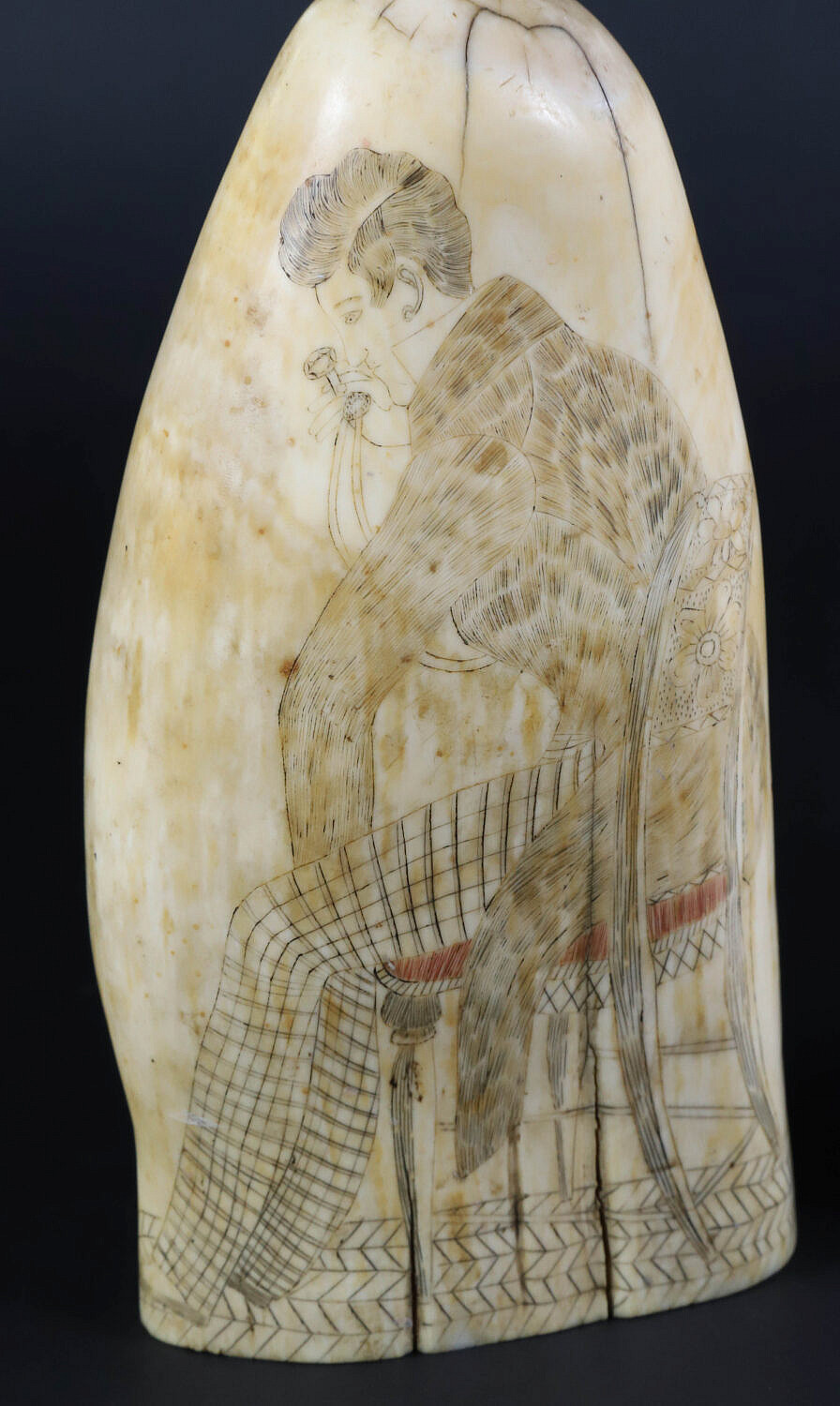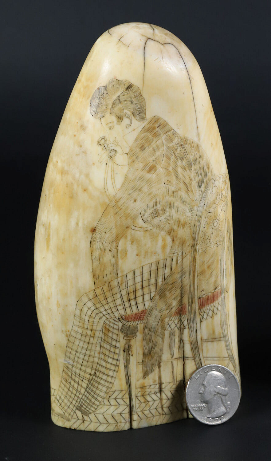 Antique Polychrome Scrimshaw Whale Tooth Depicting the Locket Engraver, 19th Century