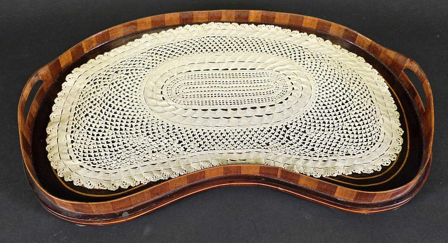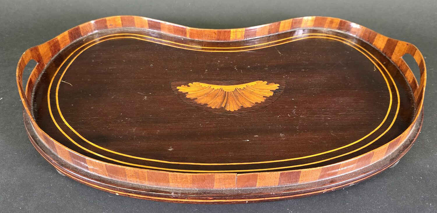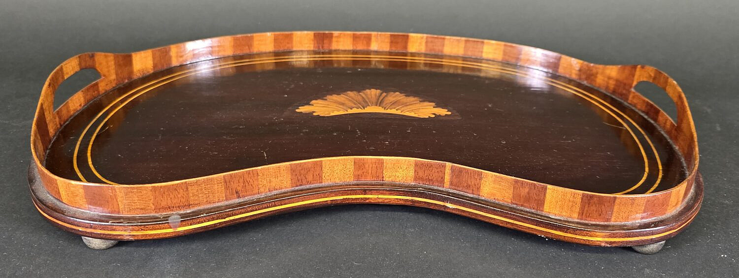 Antique Regency Kidney Shaped Satinwood Inlaid Serving Tray, 19th century, diminutive in size, accompanied by custom fabric doily.