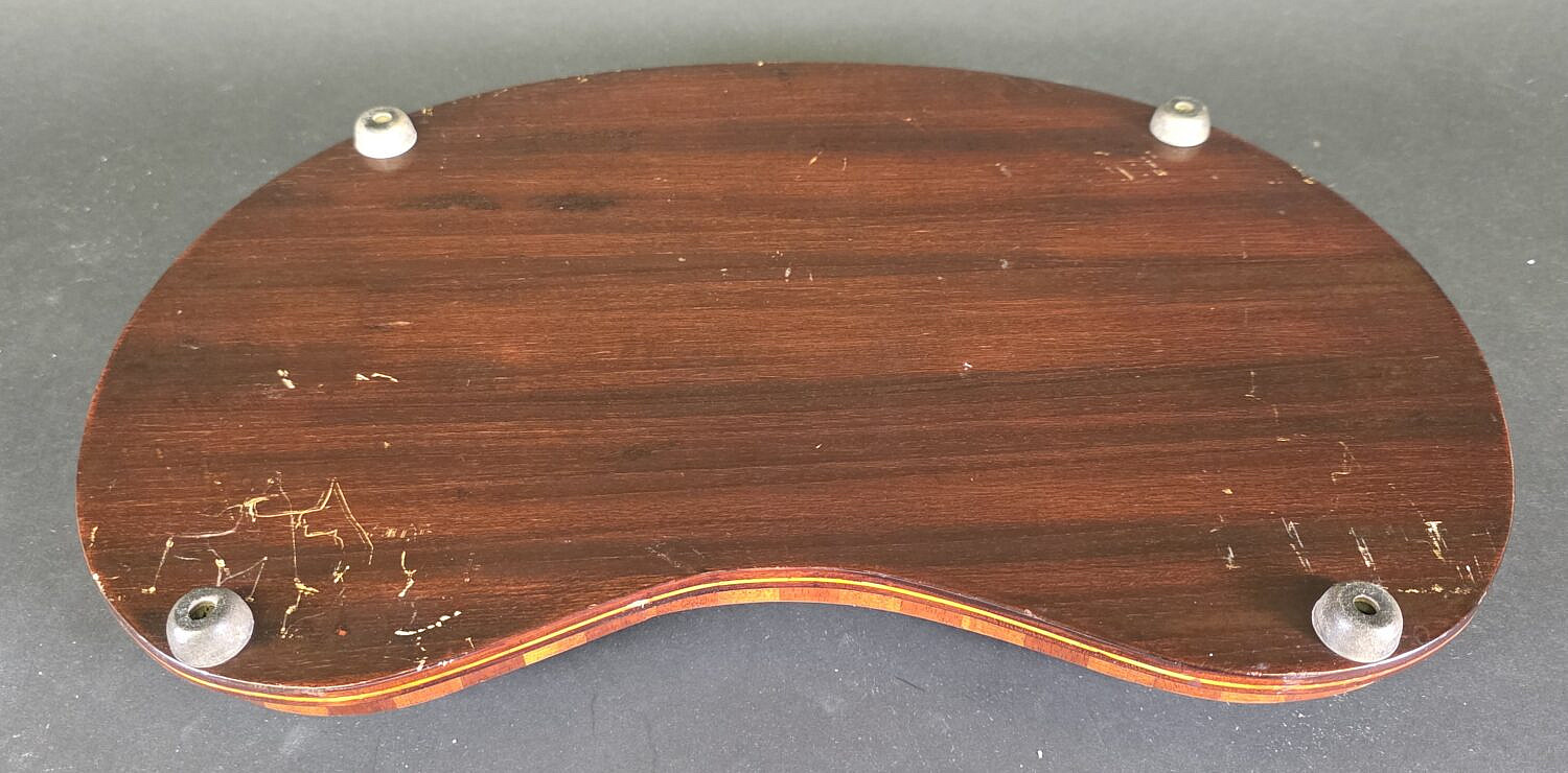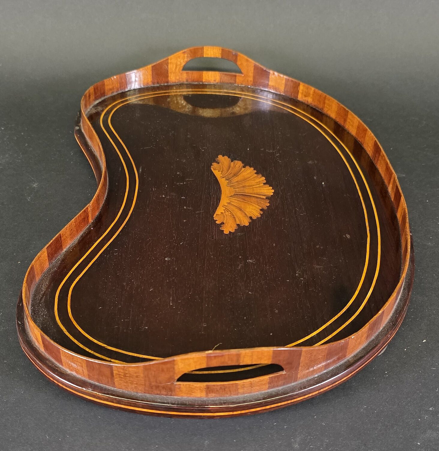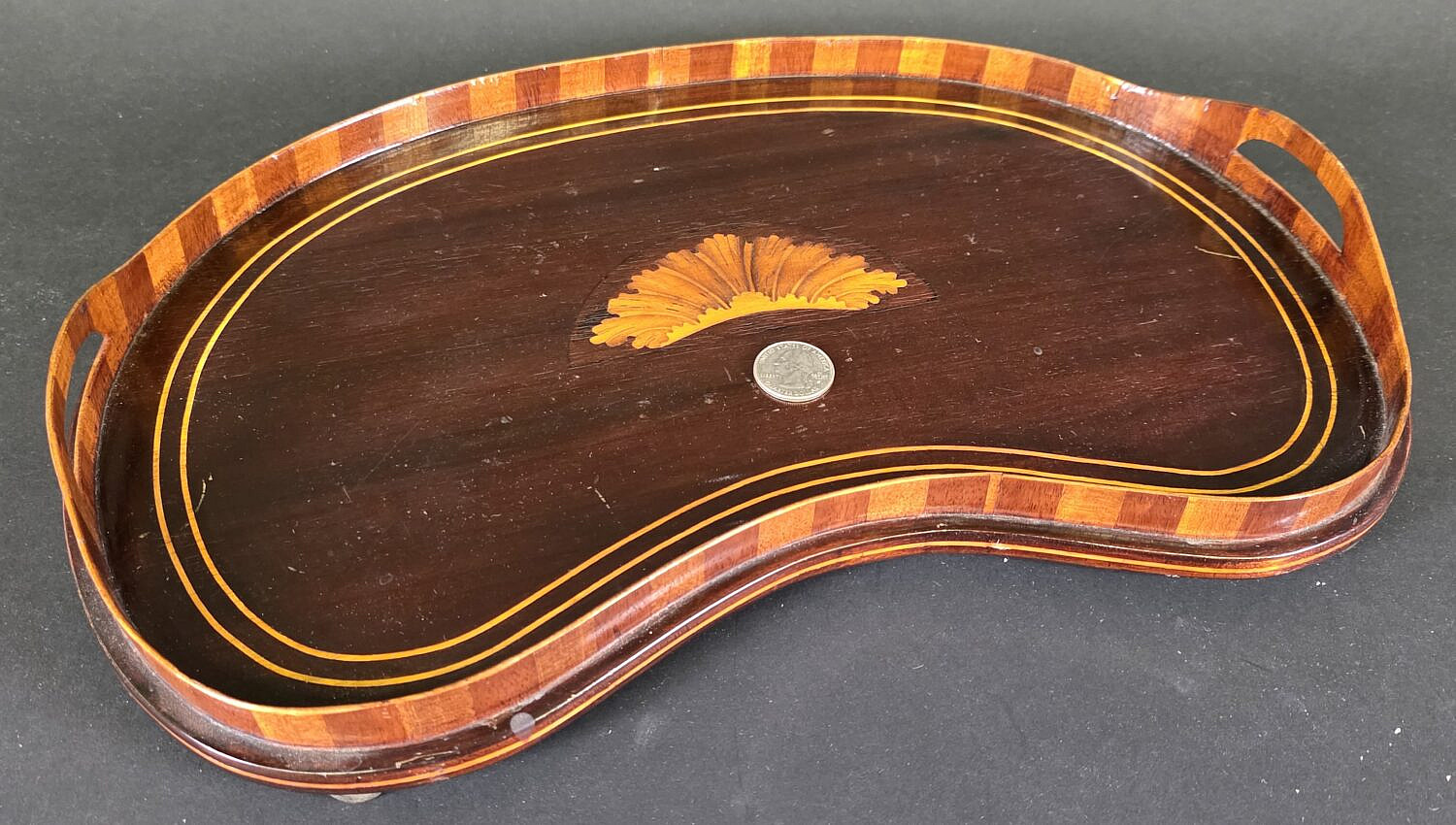 Antique Regency Kidney Shaped Satinwood Inlaid Serving Tray, 19th century, diminutive in size, accompanied by custom fabric doily.