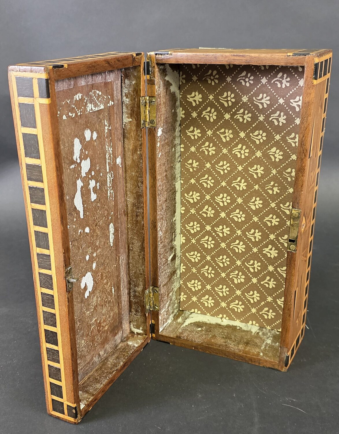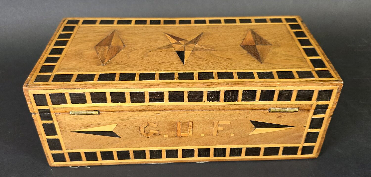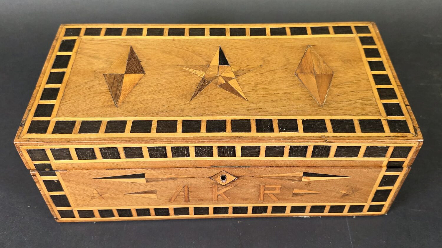 Antique Sailor Made Ebony and Satinwood Inlaid Lift Top Box, 19th century, star and diamond inlay decoration, with the initials, A.K.R.