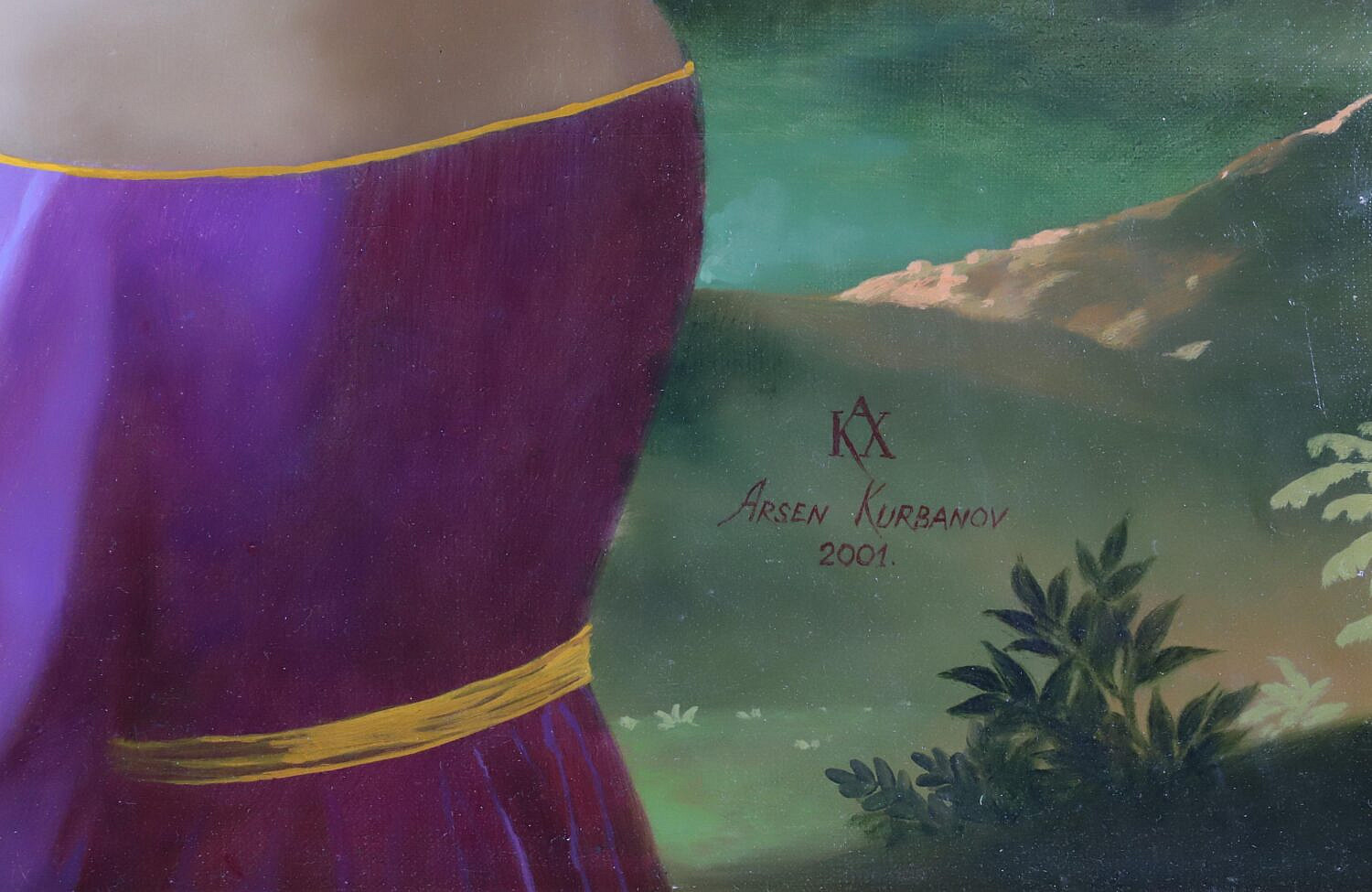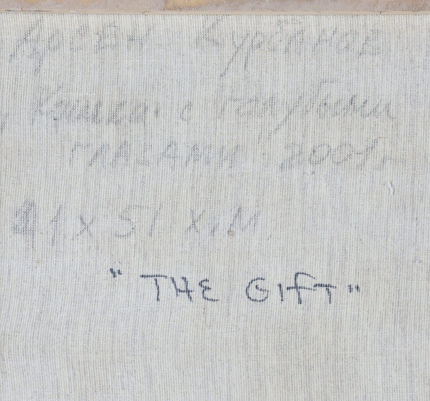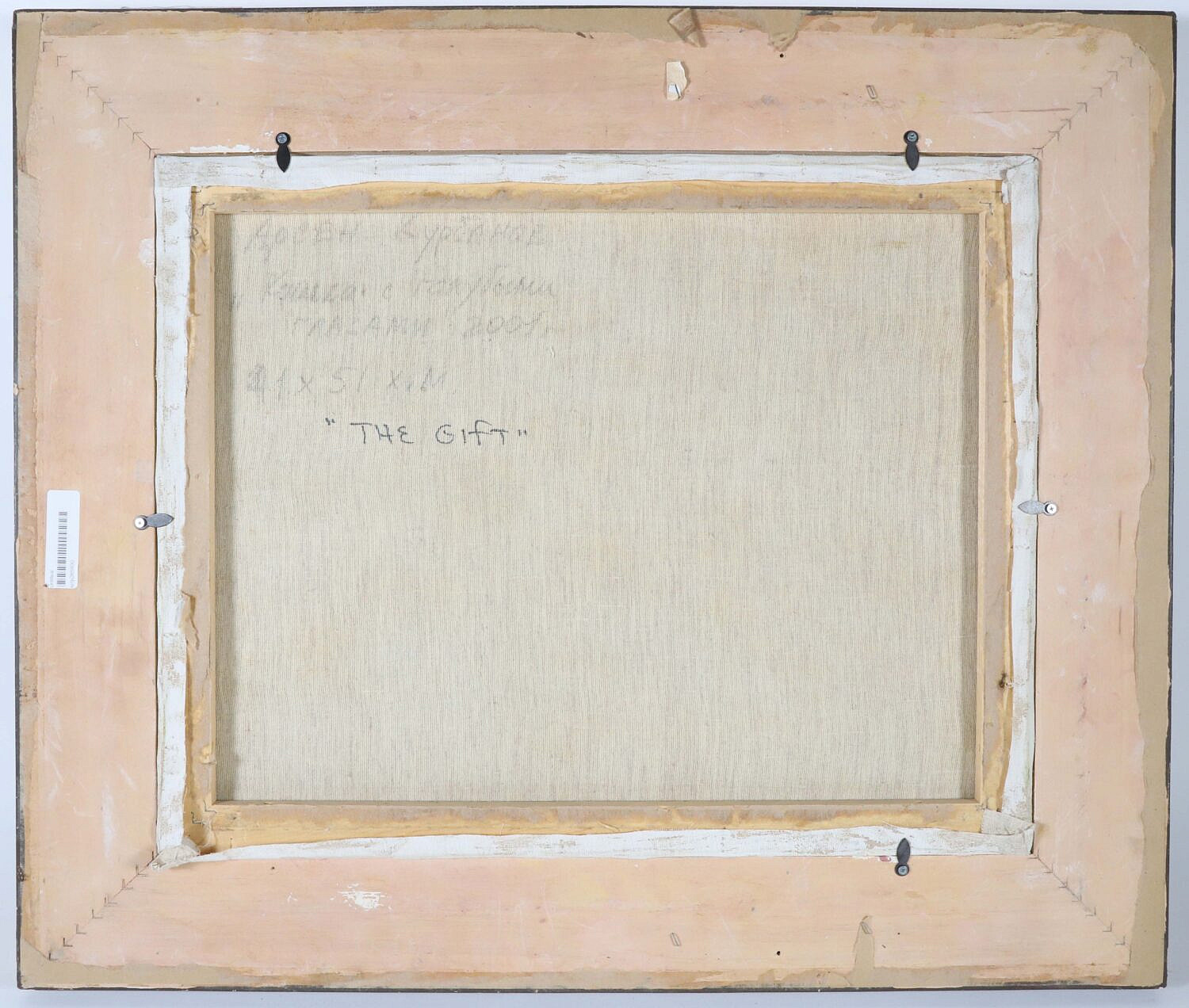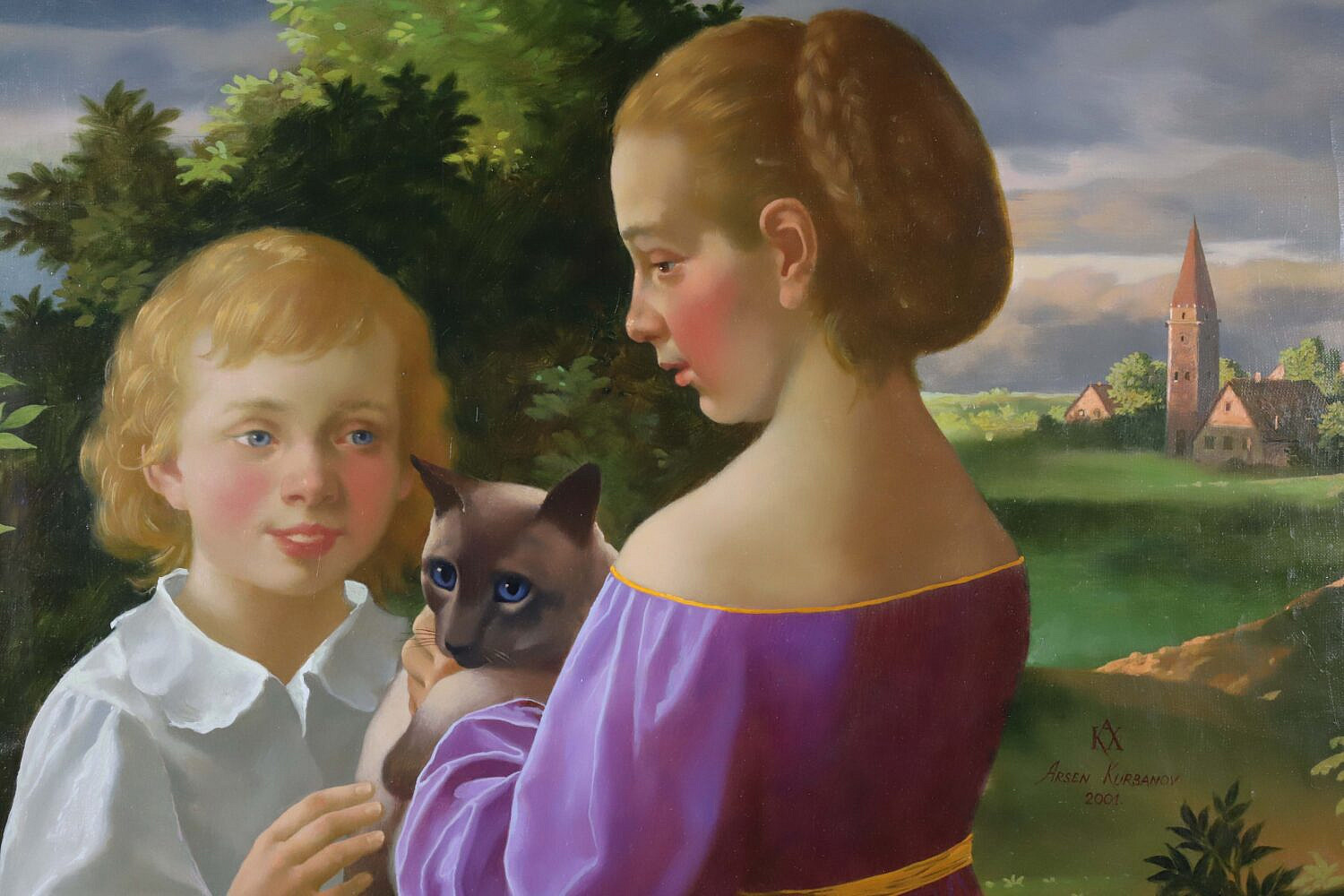 Arsen Kurbanov (Russian b. 1969) Oil on Canvas “The Gift”, depicting two young girls with their new pet cat, Monogrammed, signed and dated 2001 lower left and notated on reverse, in gold leaf hand carved frame