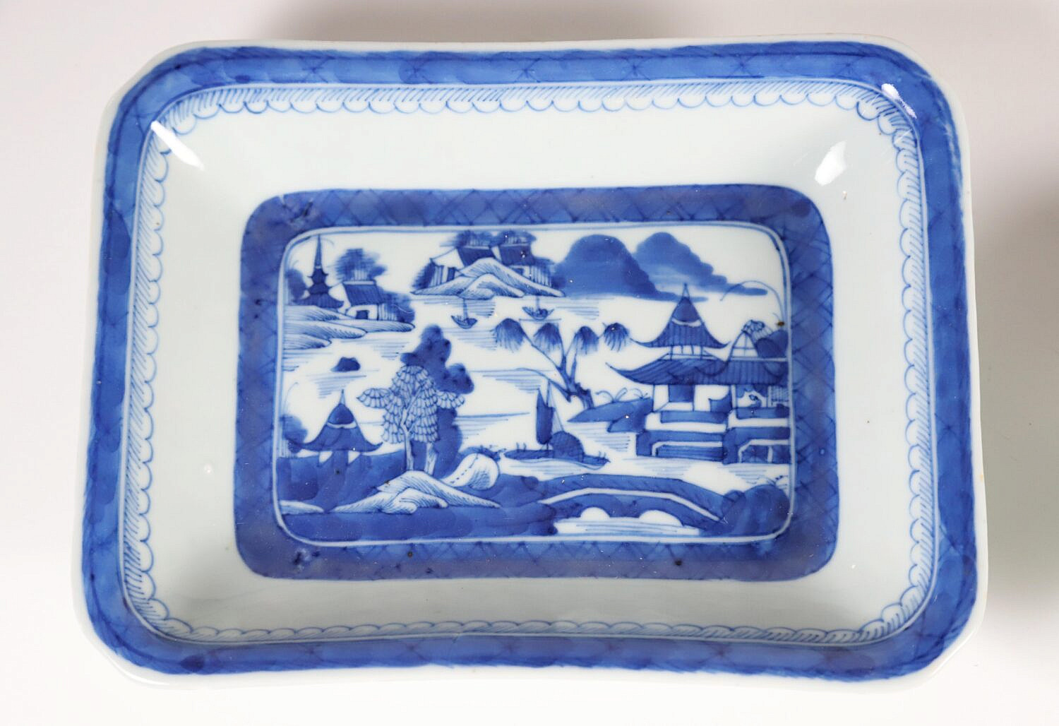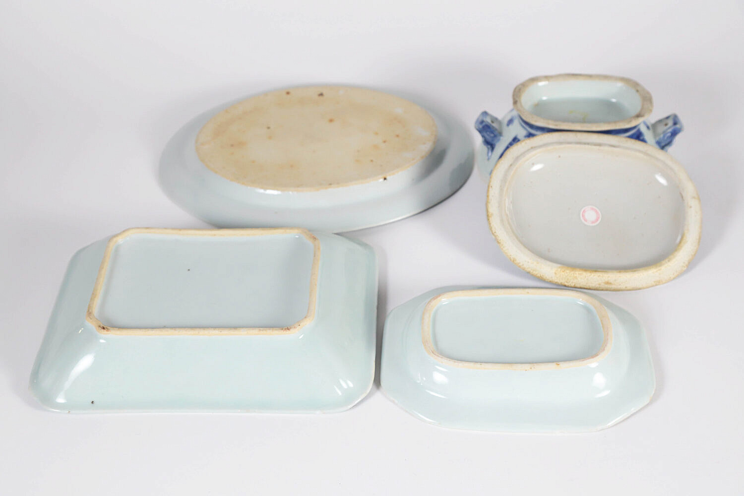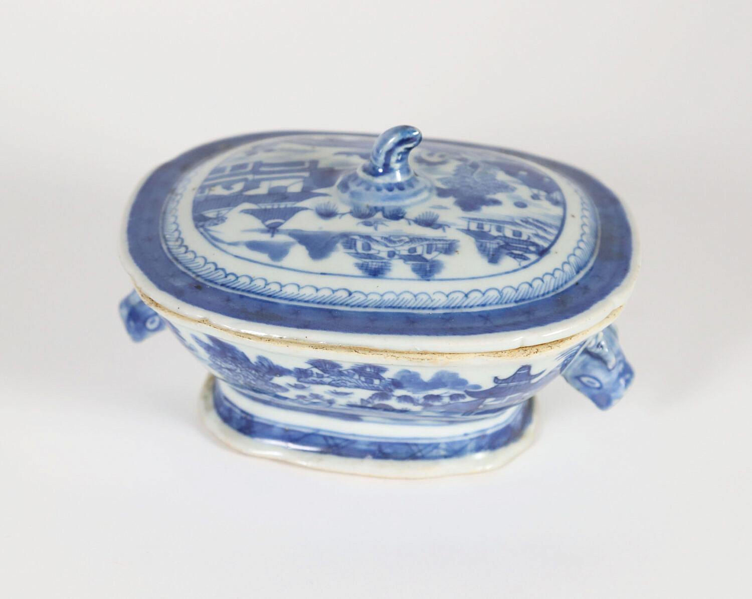 Assortment of Four Pieces of Blue and White Canton China, 19th Century, comprising: oval platter, two rectangular platters and one covered sauce tureen