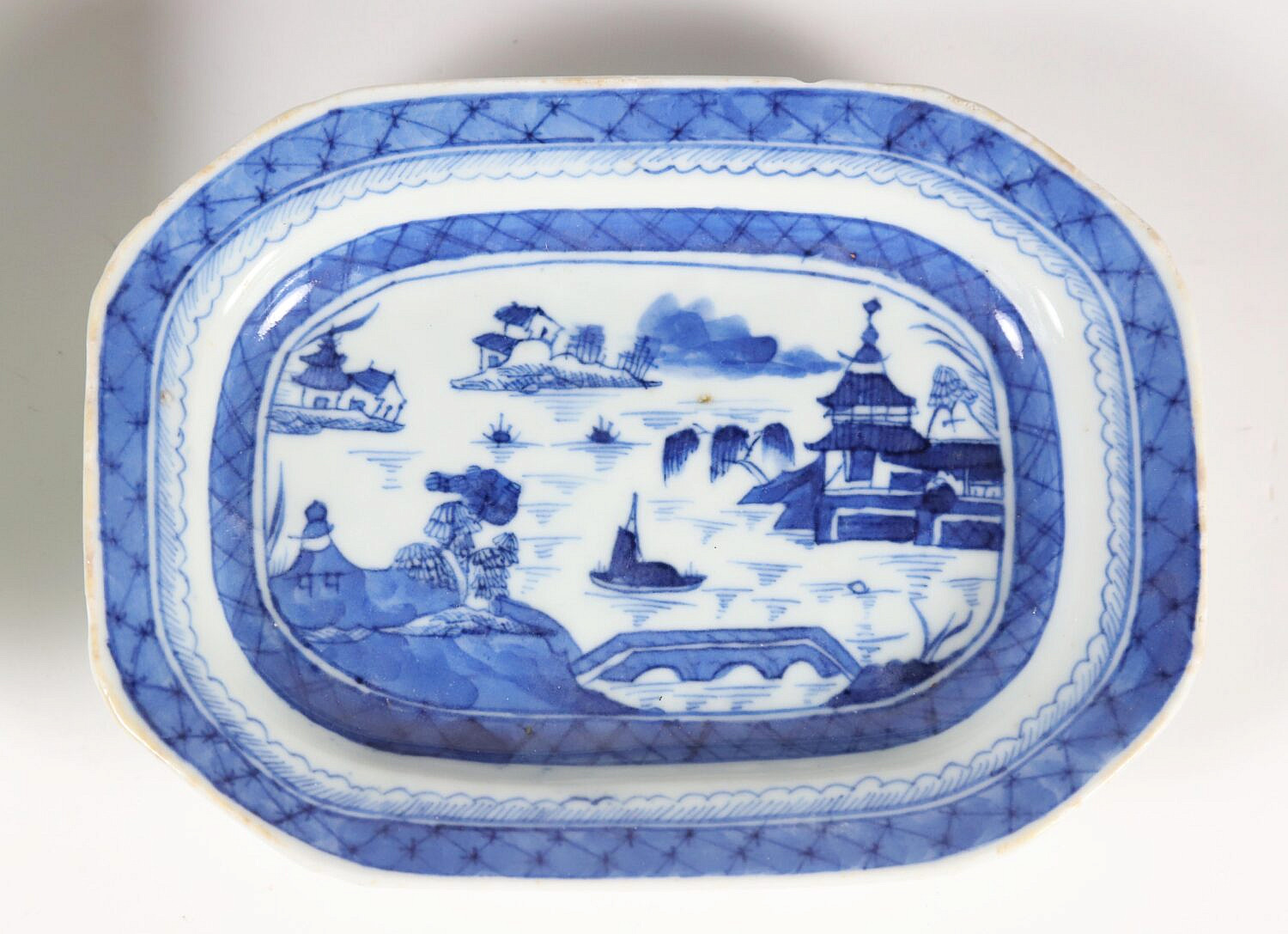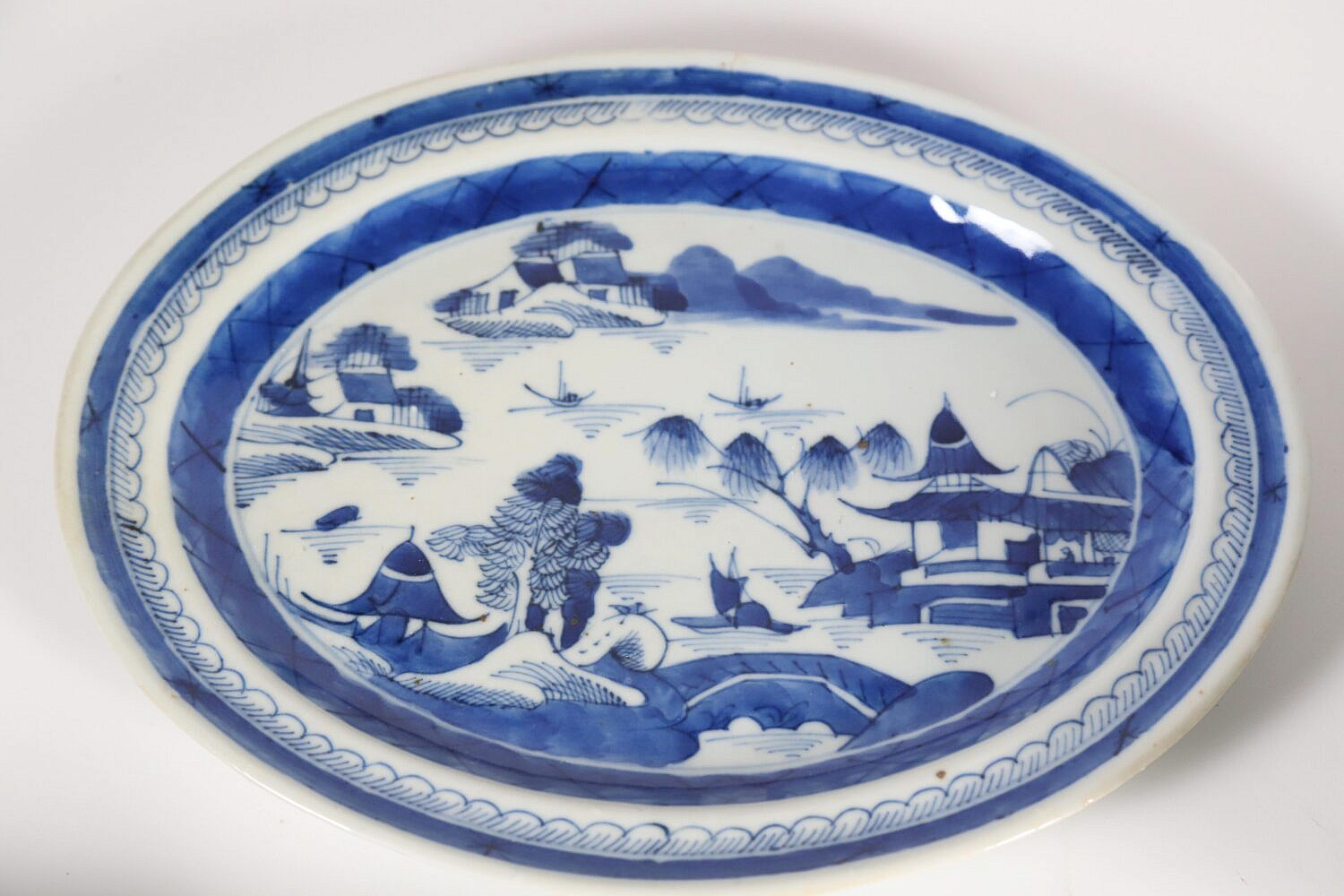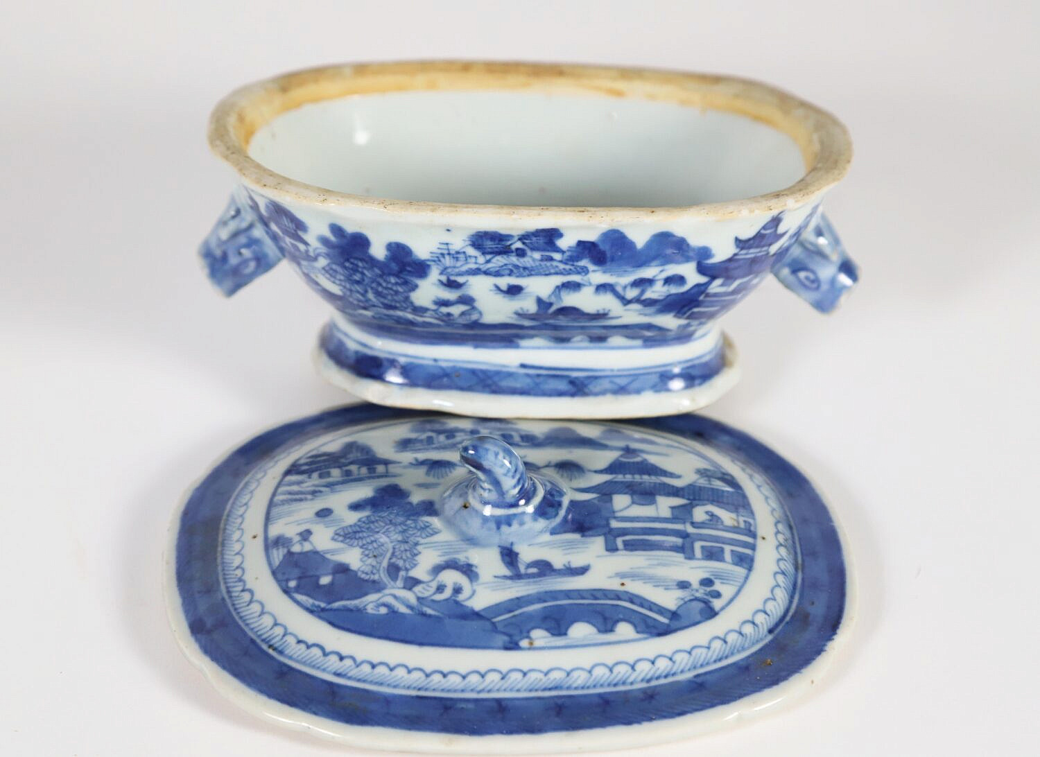 Assortment of Four Pieces of Blue and White Canton China, 19th Century, comprising: oval platter, two rectangular platters and one covered sauce tureen