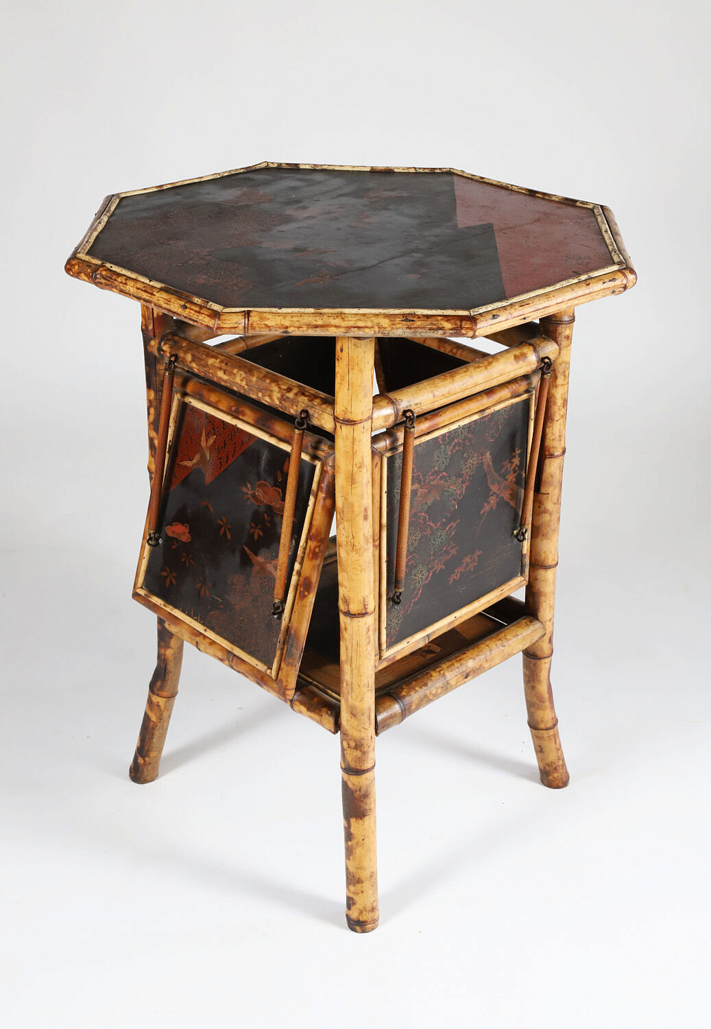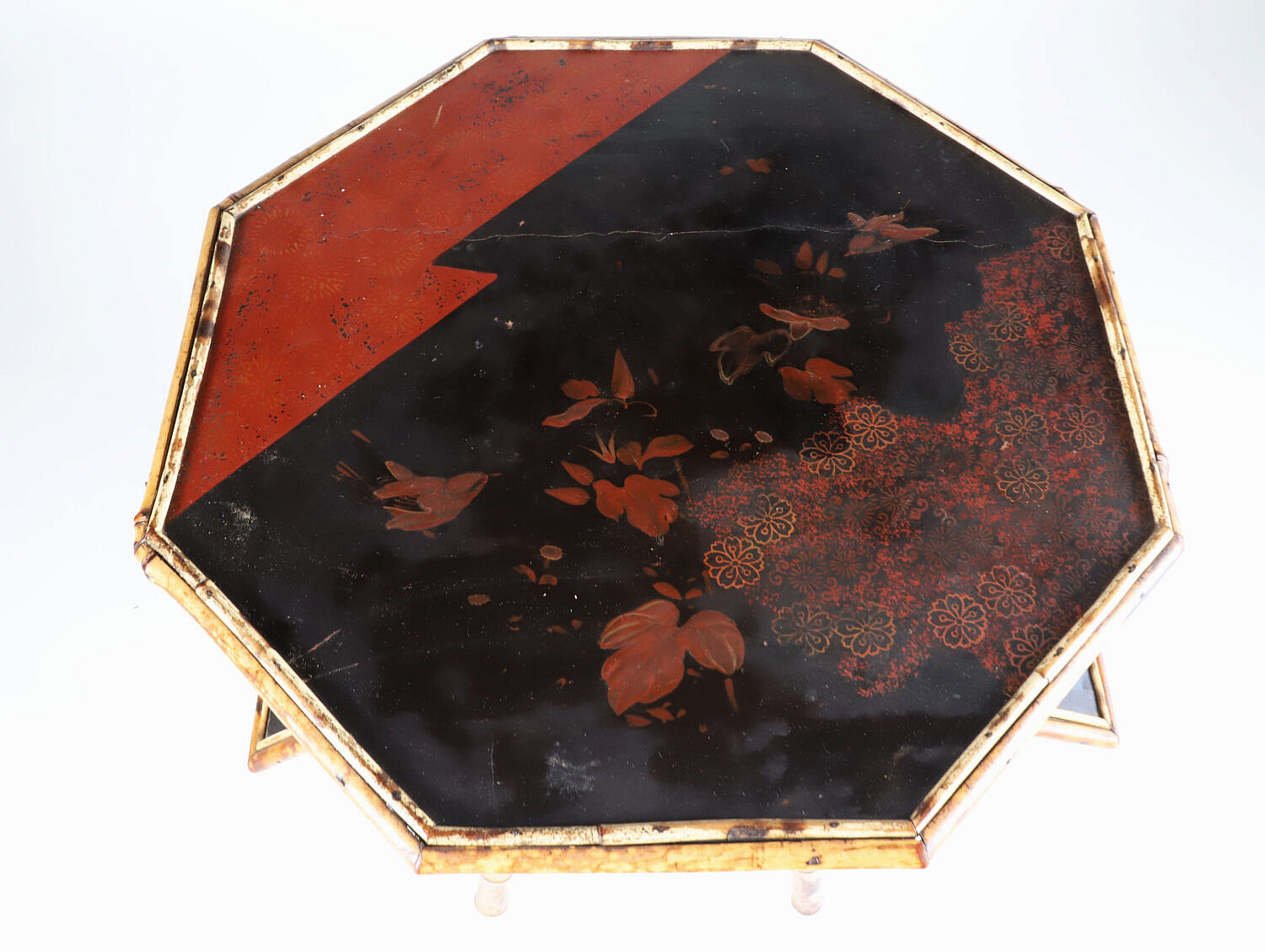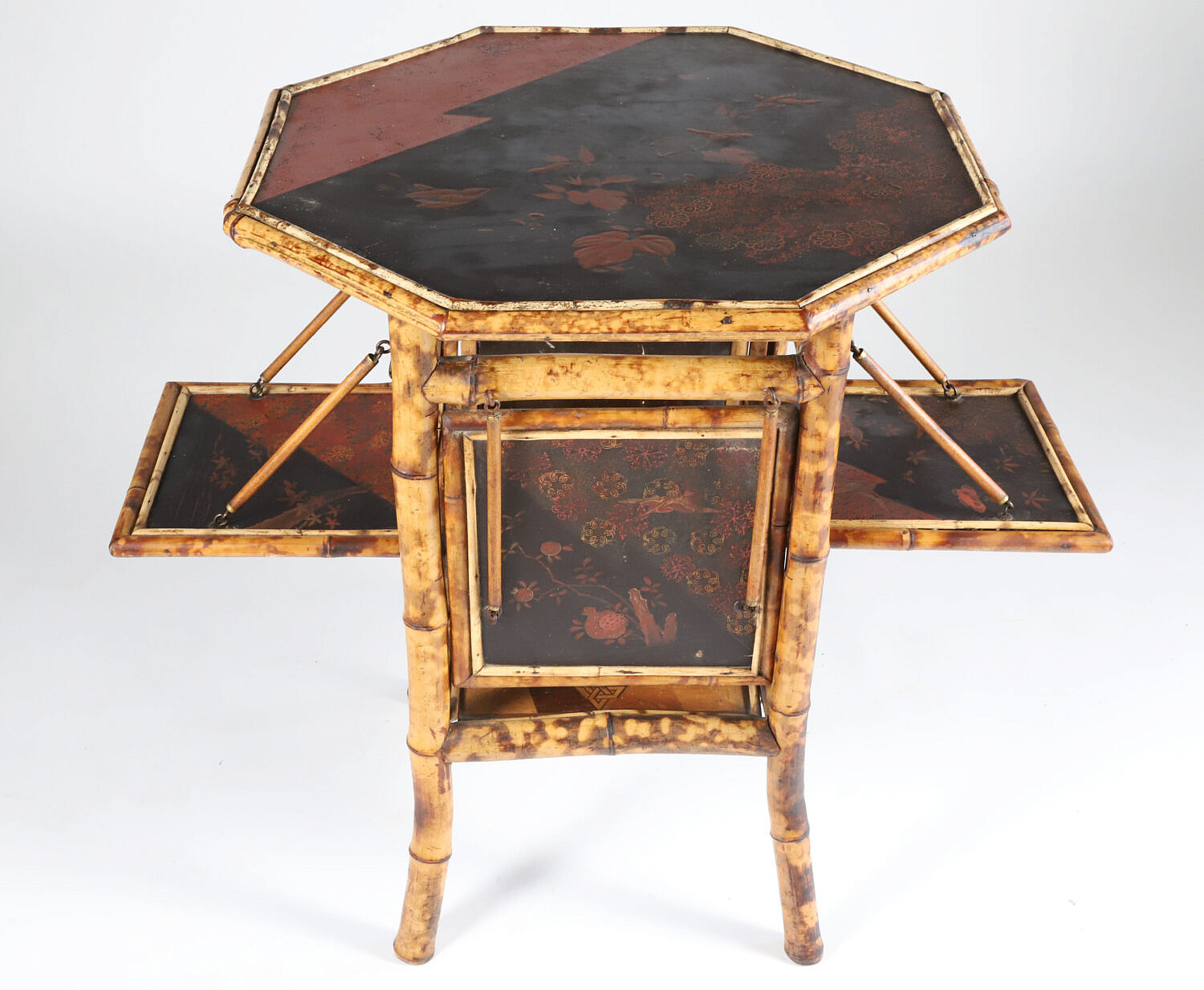 Bamboo Lacquered Occasional Table, 19th Century, octagonal top above four retractible shelves