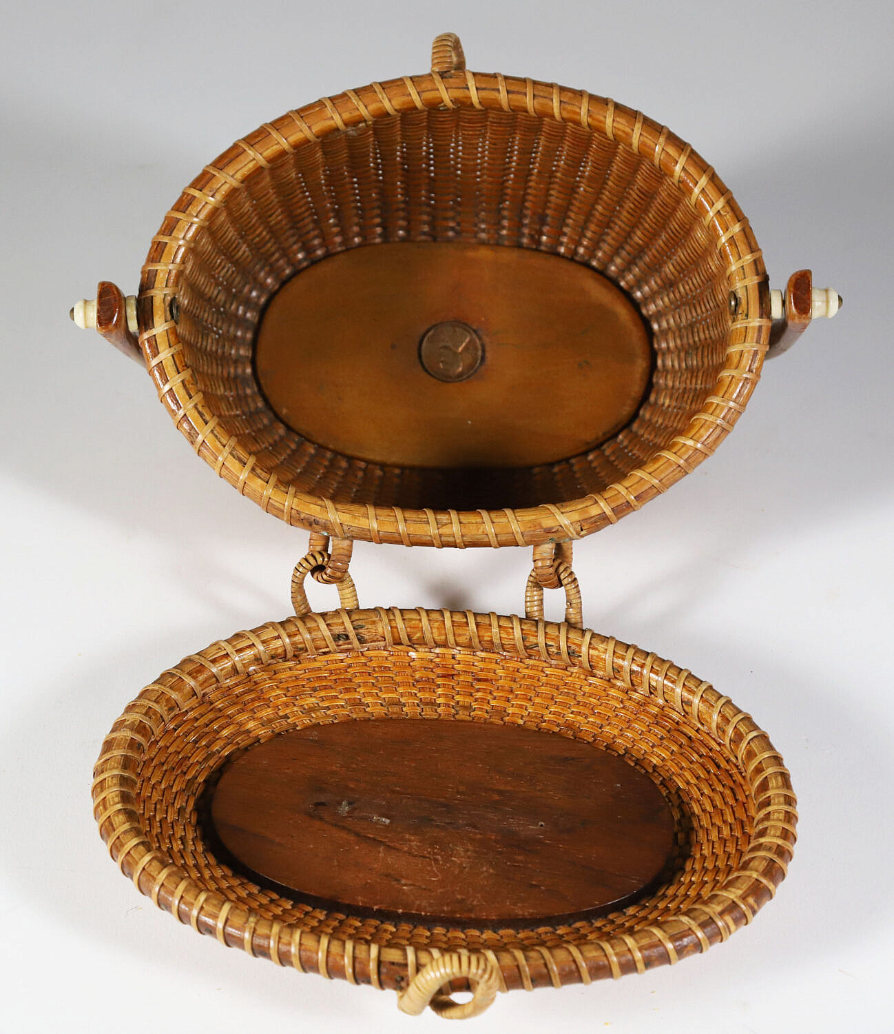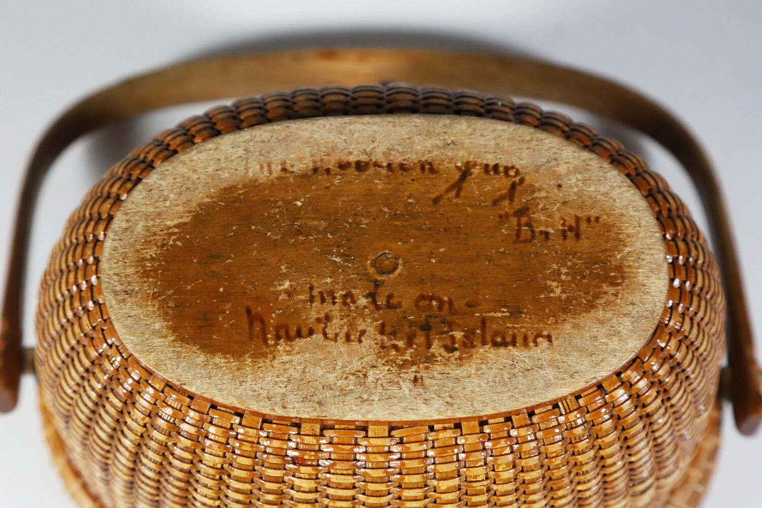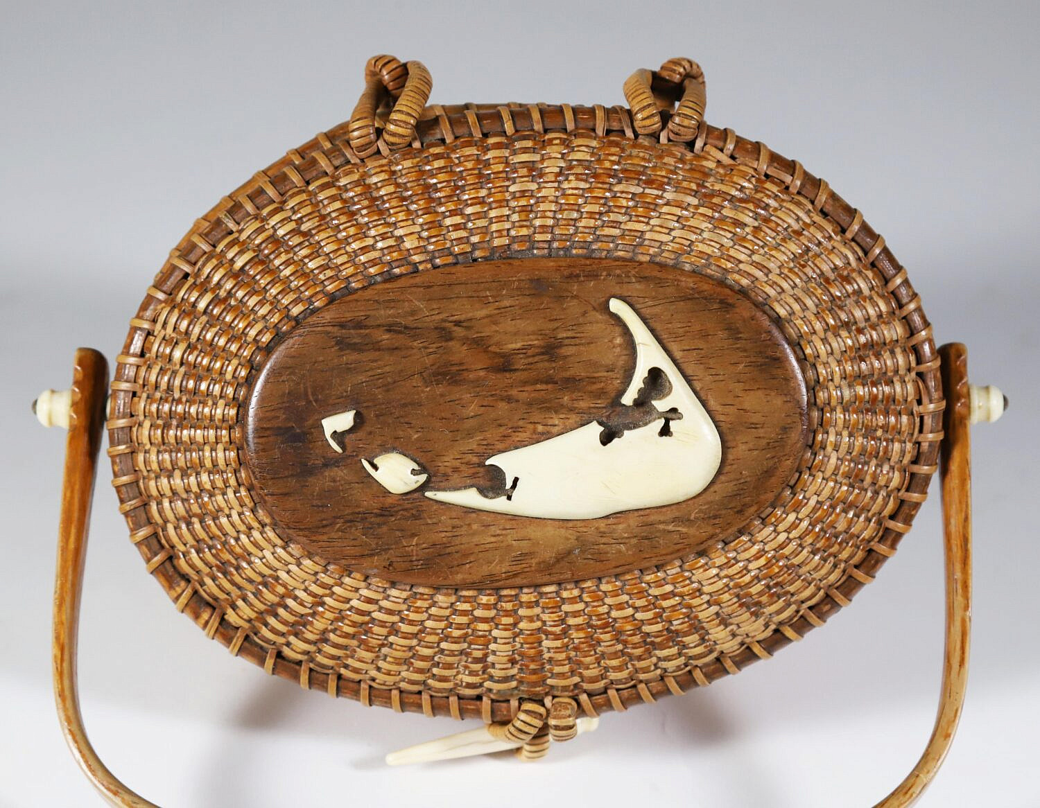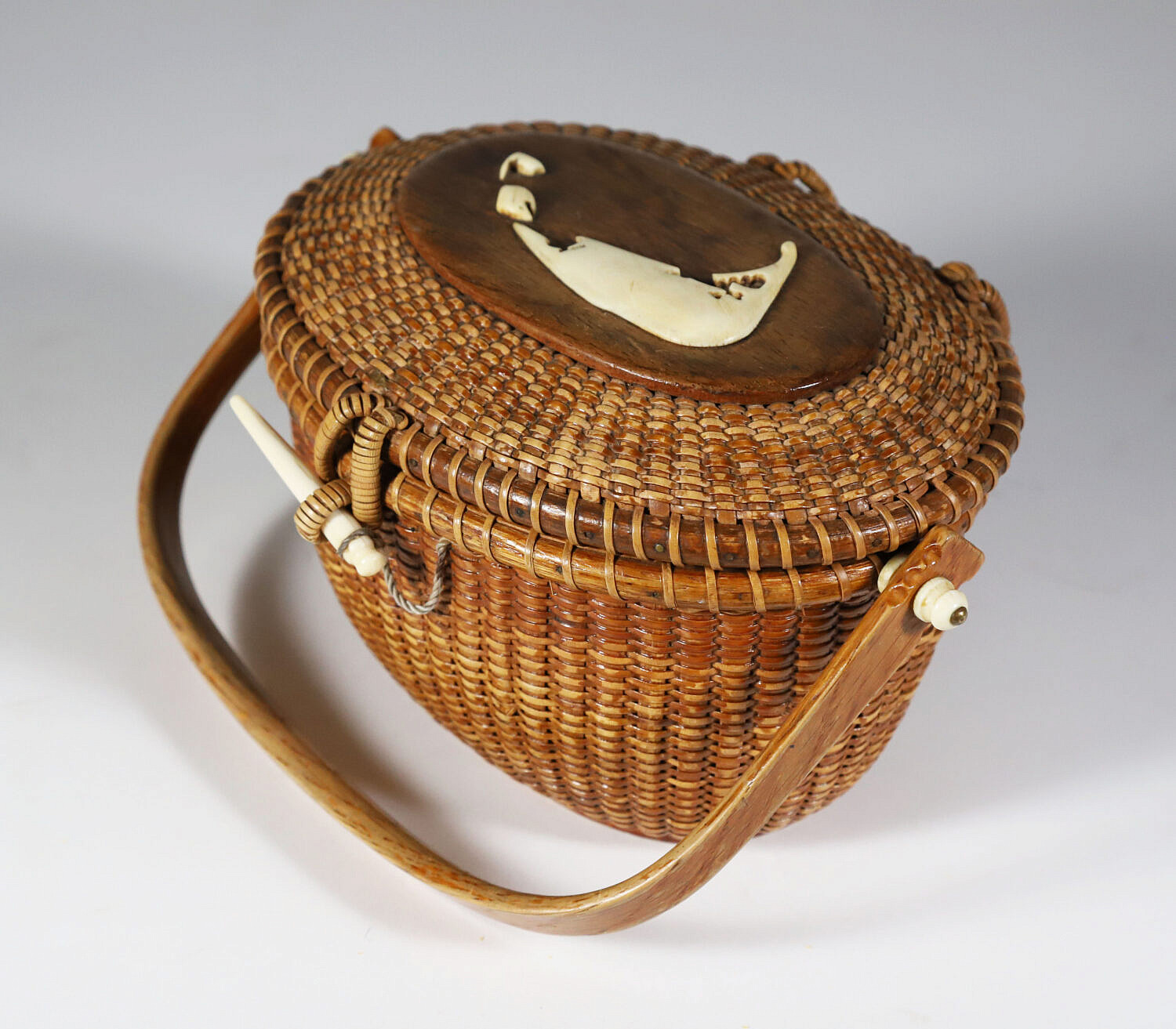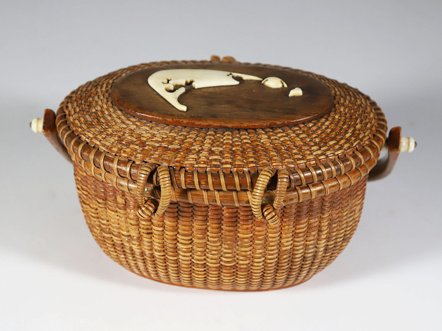 Bea & Hellen “The Wooden Jug” Nantucket Cocktail Basket with Carved Nantucket Island on Lid, circa 1960s