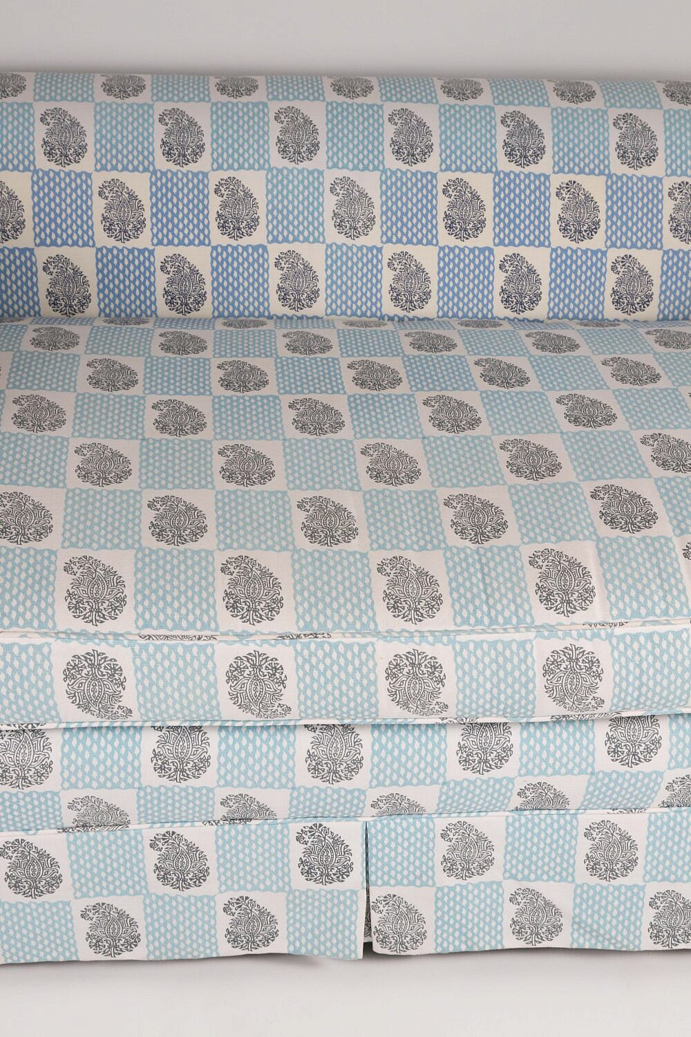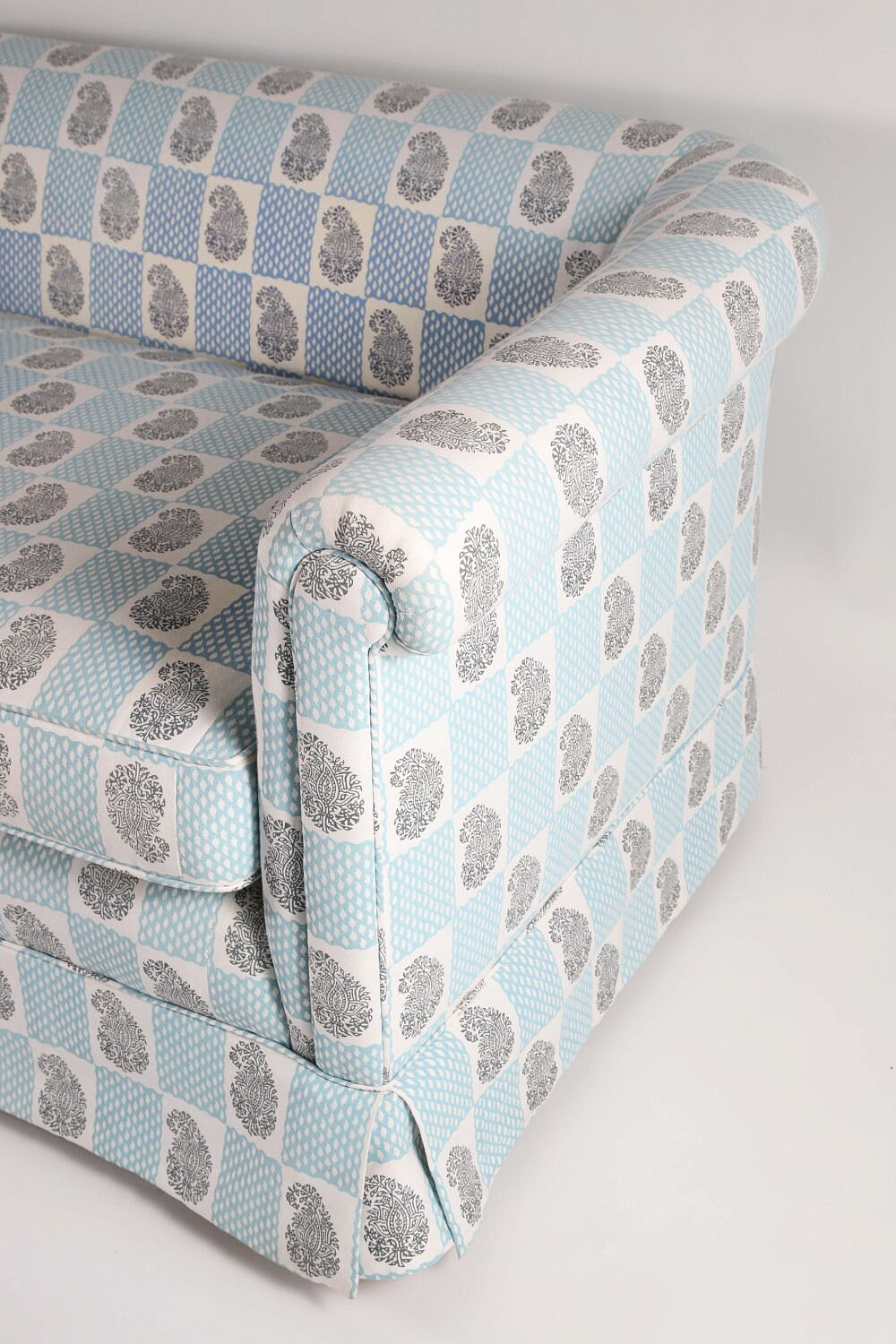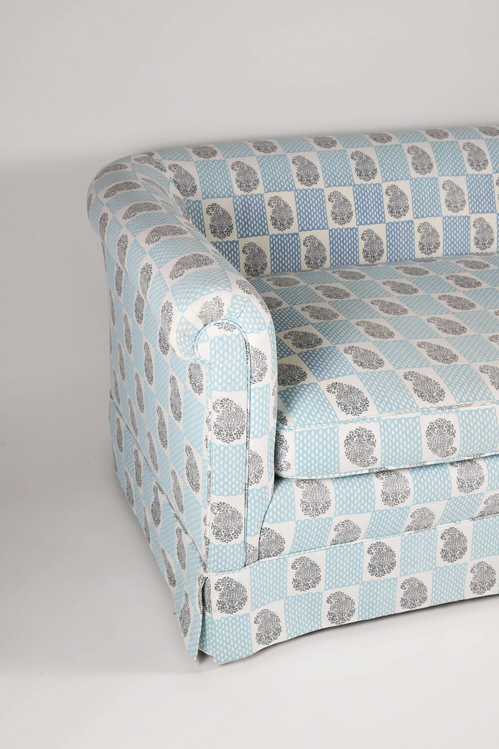 Blue and White Upholstered Rolled Arm Single Cushion Skirted Sofa