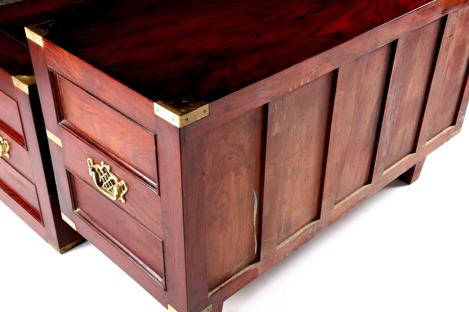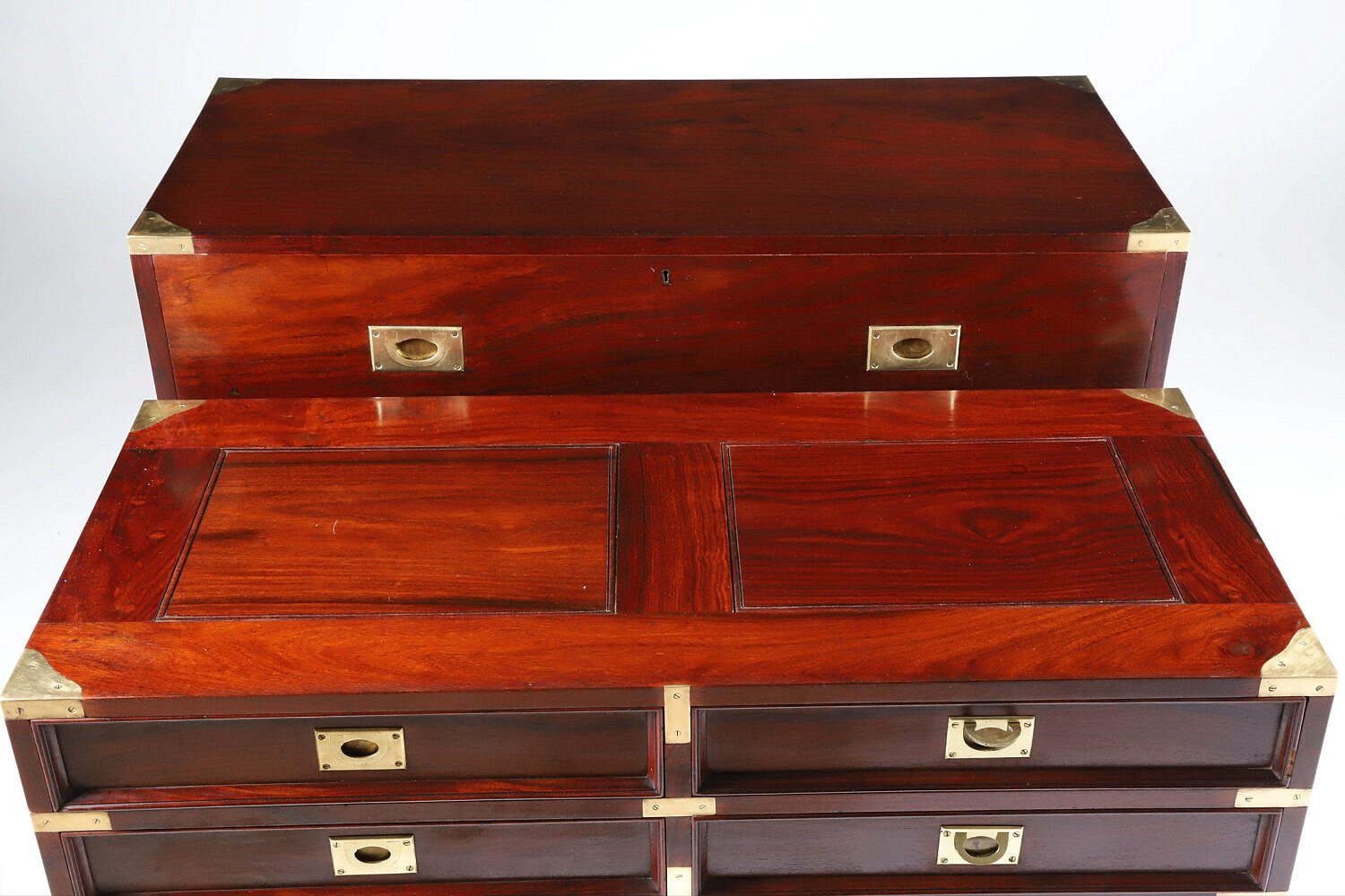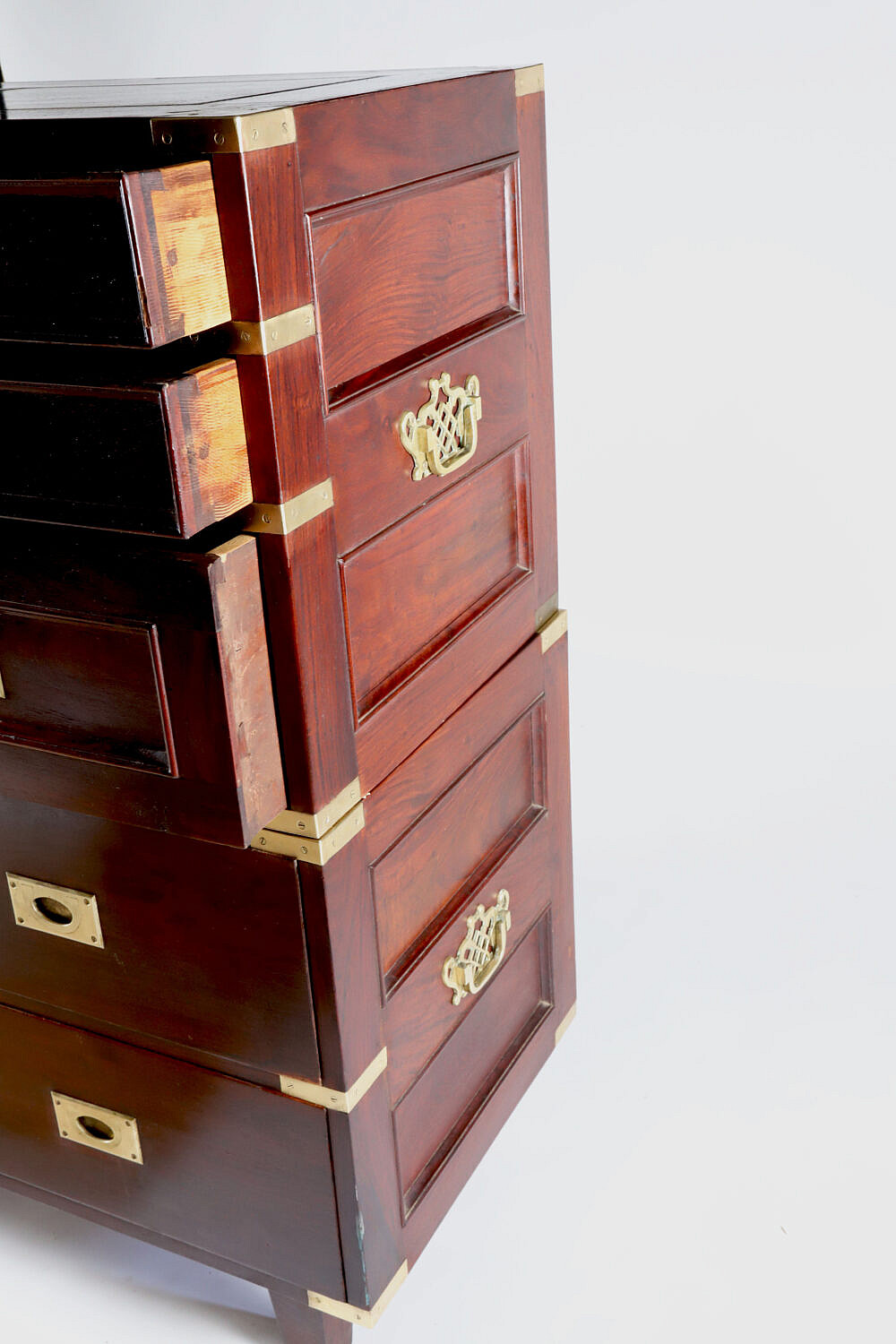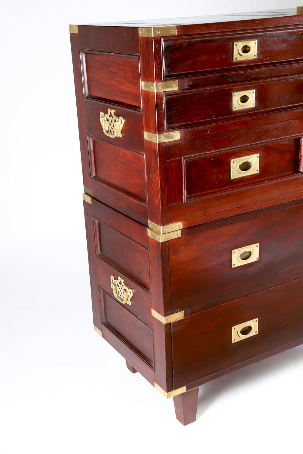 Brass Bound Campaign Chest of Drawers, labeled M. Heyat & Bros. Peshawar, Pariston, in two sections, the upper with a paneled top above four over one drawer, the lower section with two long drawers on removable feet