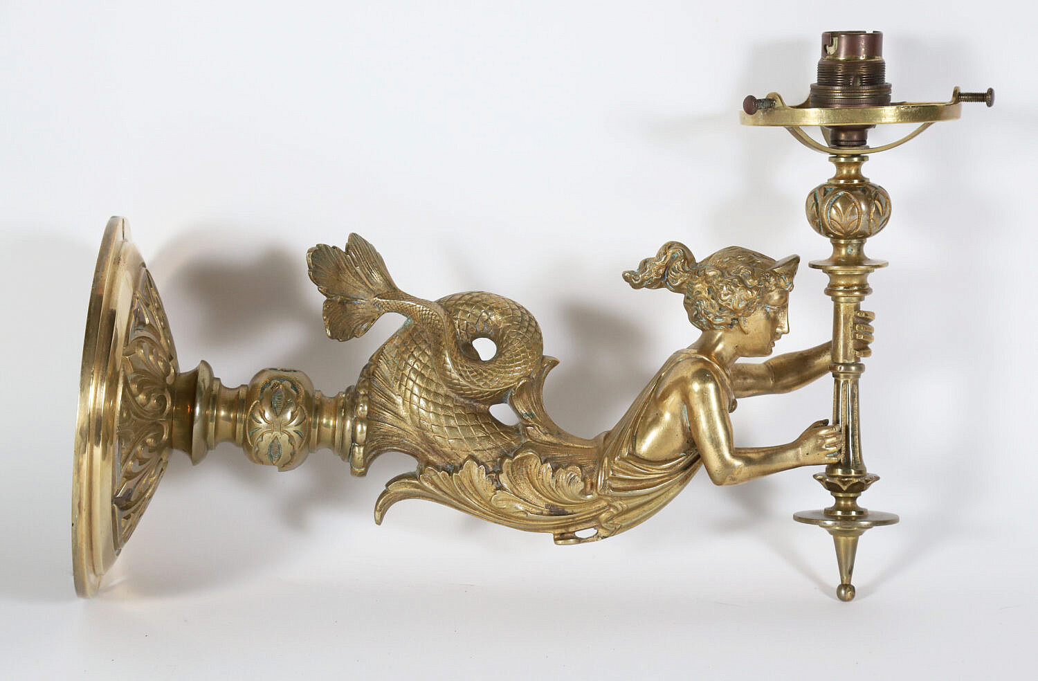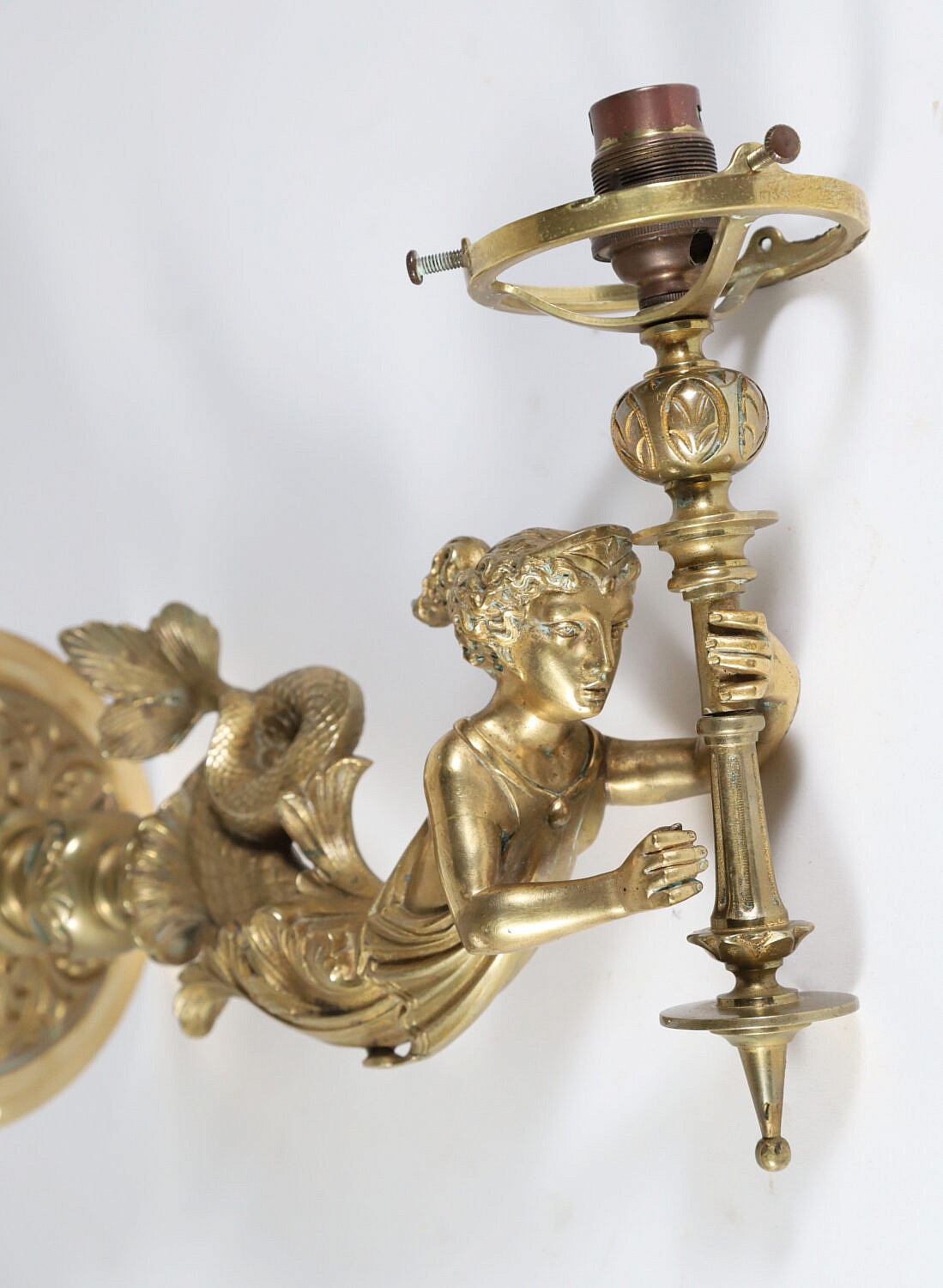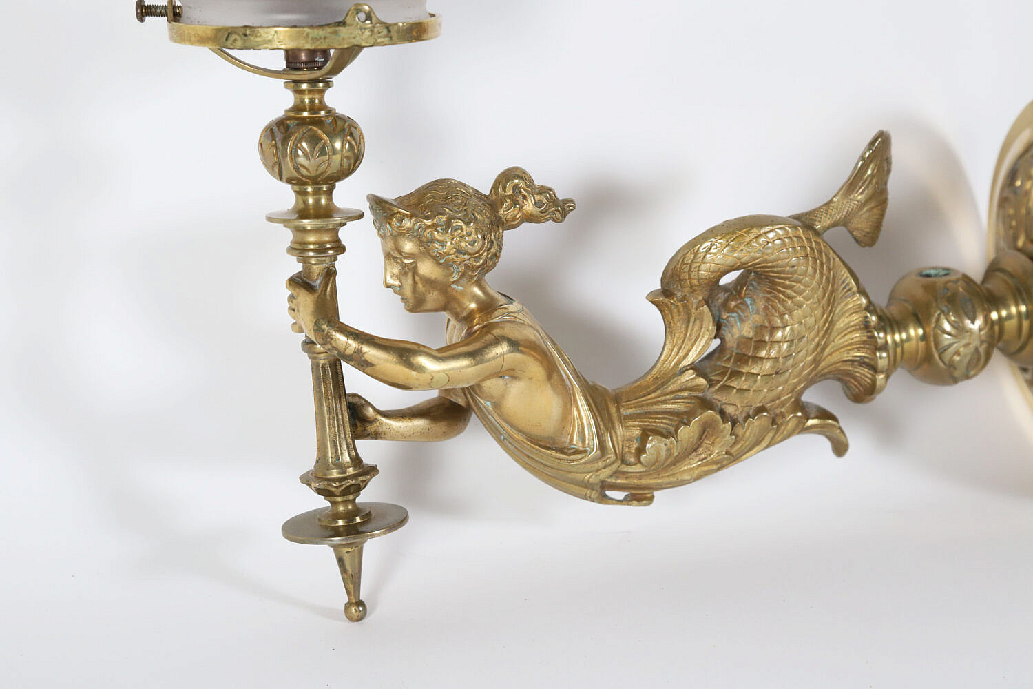 Brass Wall Sconce in the Form of a Mermaid Holding a Shade, American, circa 1850-1860