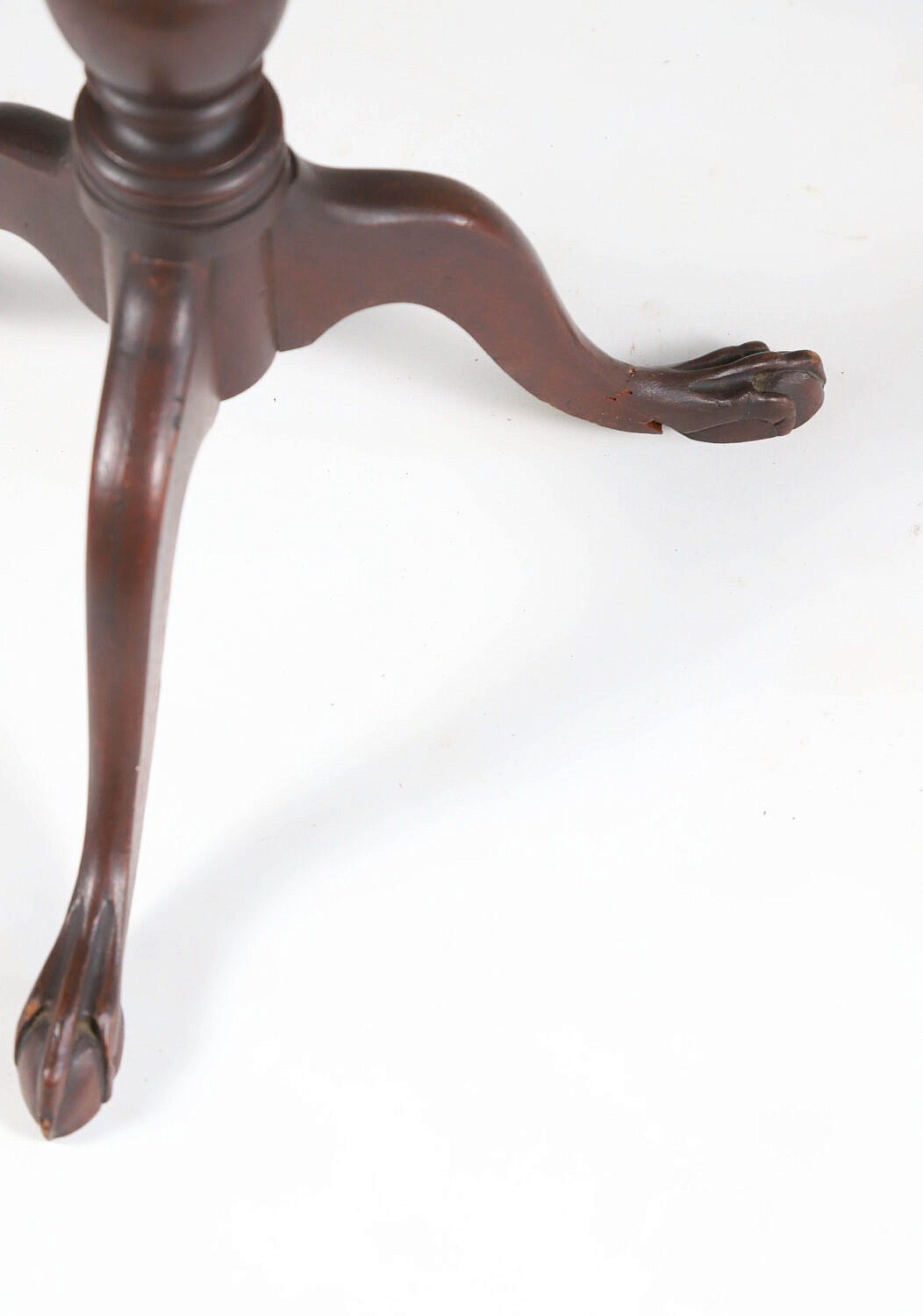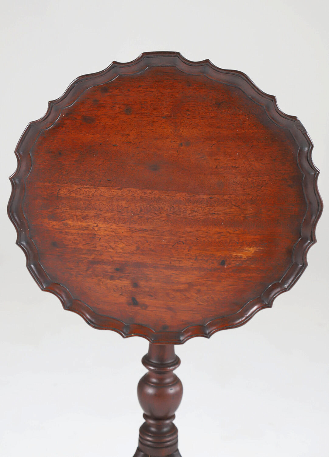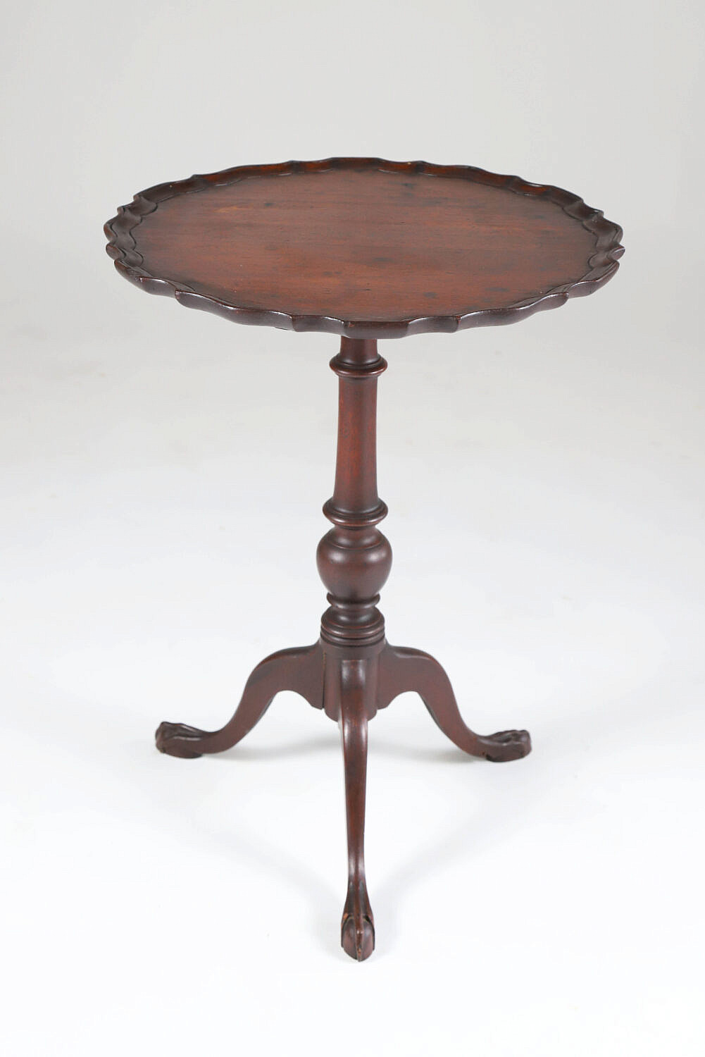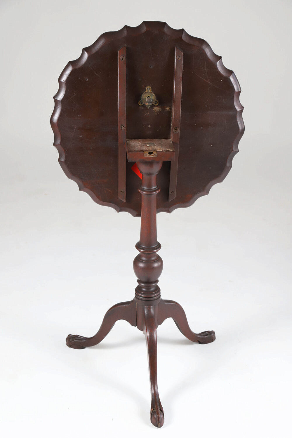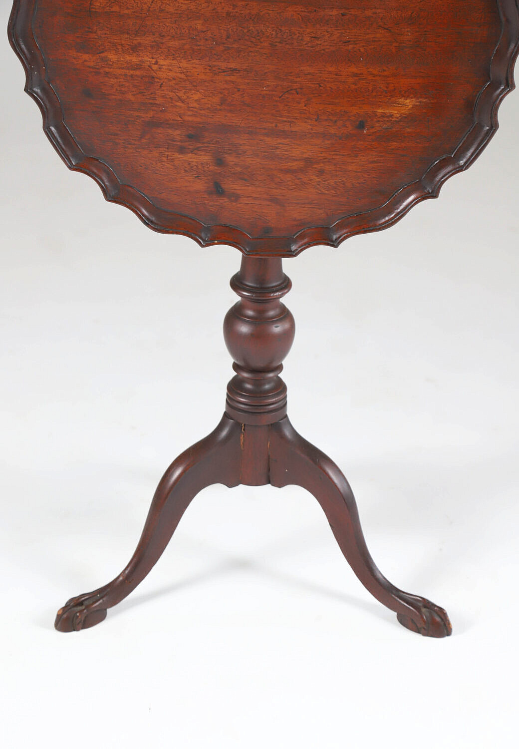Chippendale Mahogany Pie Crust Tilt Top Tea Table, 19th Century, turned standard on three down swept legs ending in ball and claw feet