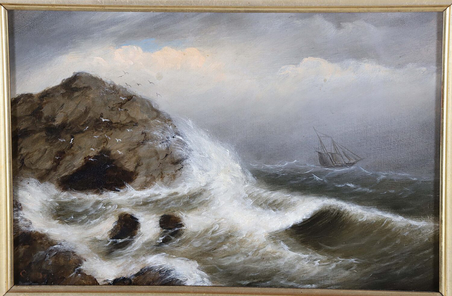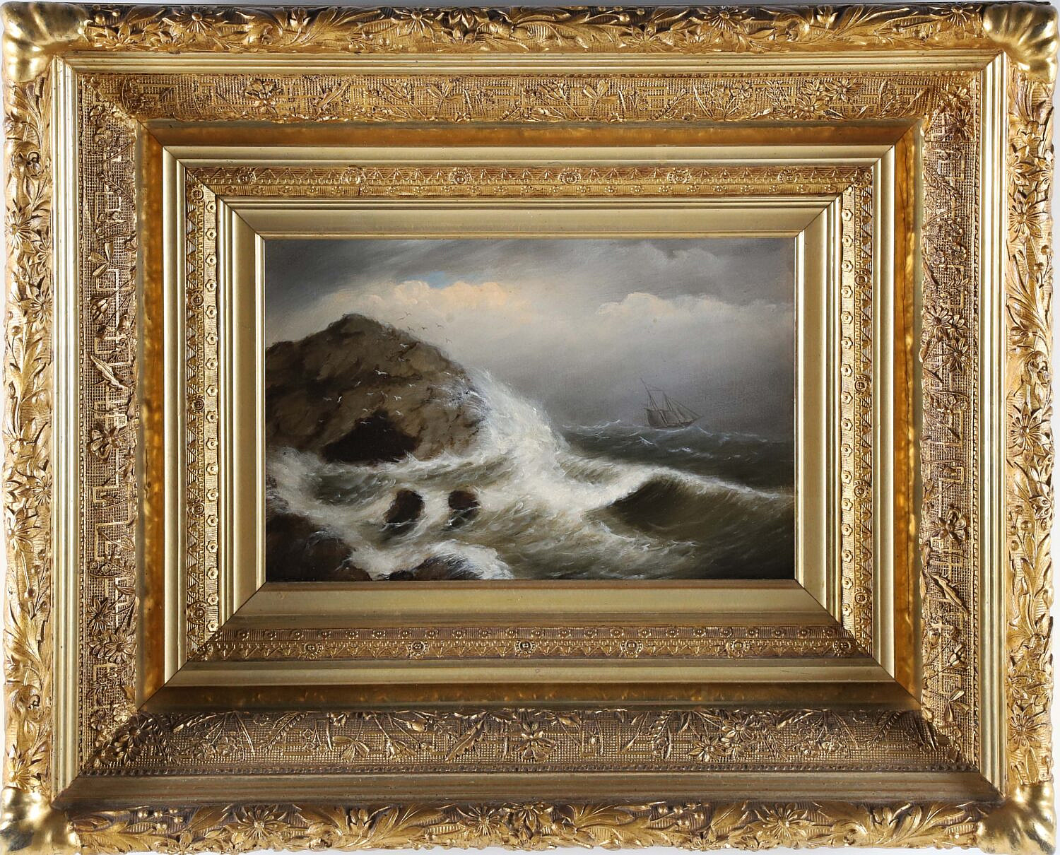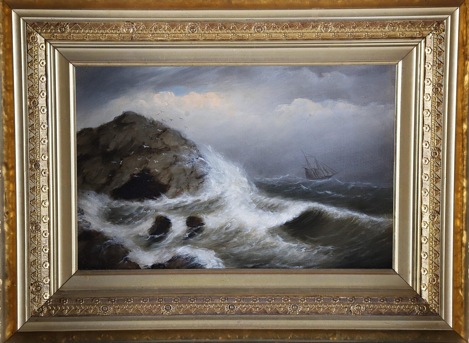 Clement Drew Oil on Canvas “Clipper Ship in Stormy Seas”, signed lower left C . Drew, in period gilt frame. Drew was a marine painter of harbor scenes and vessels at sea, especially in rough oceans; most of his paintings were done between 1838 and 1886 and his earliest paintings were views of Boston’s South Shore