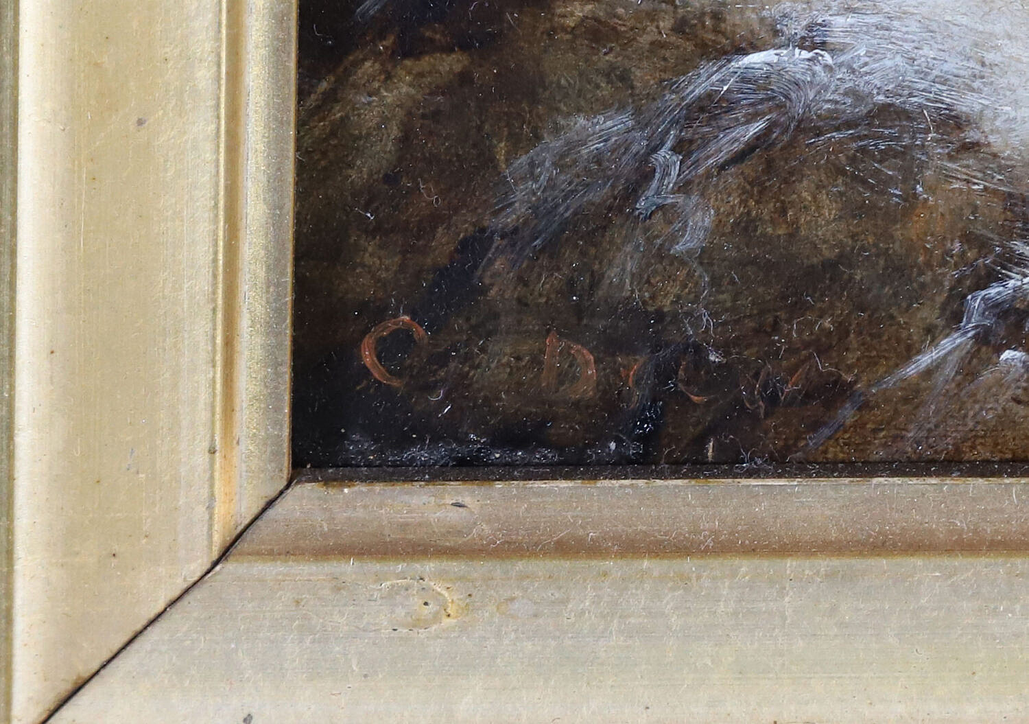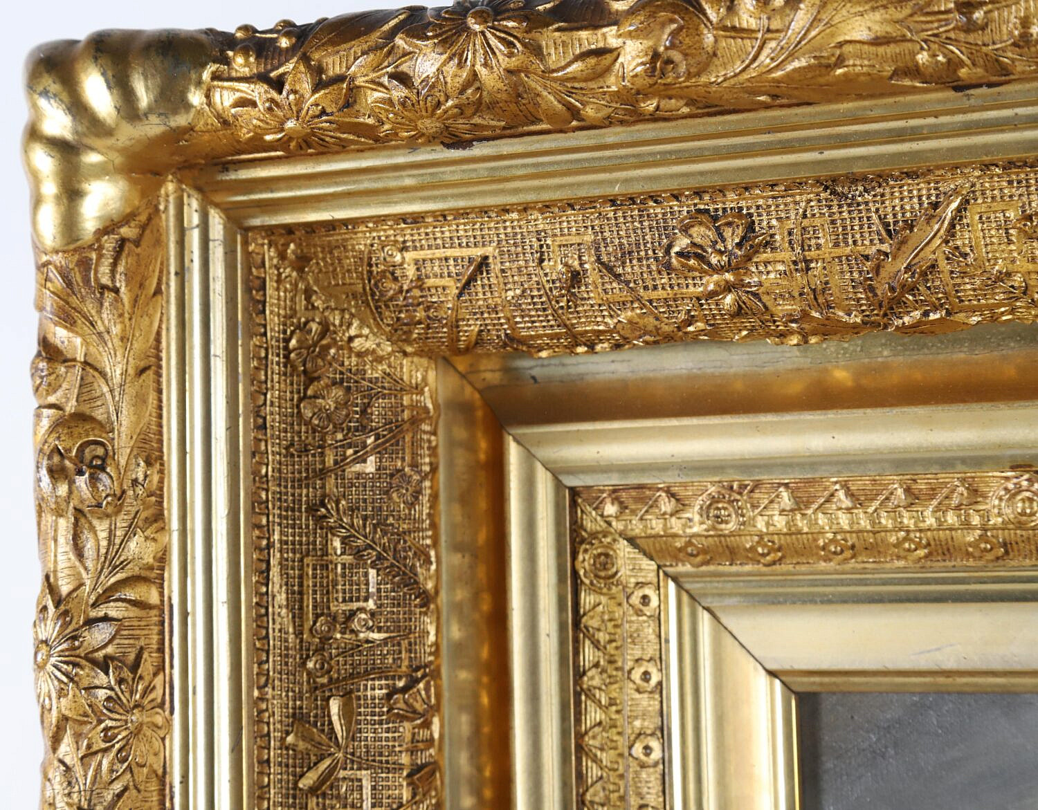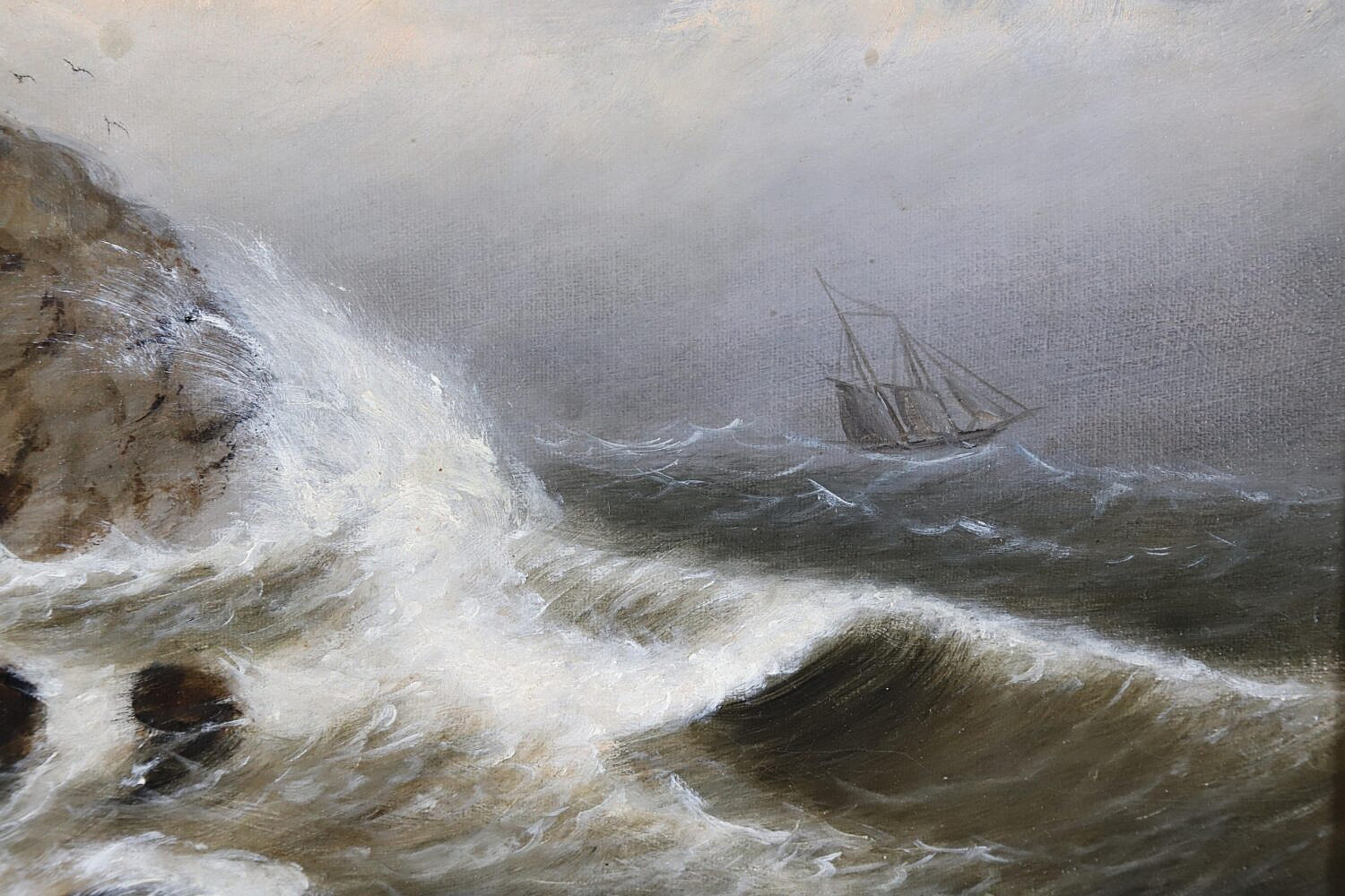 Clement Drew Oil on Canvas “Clipper Ship in Stormy Seas”, signed lower left C . Drew, in period gilt frame. Drew was a marine painter of harbor scenes and vessels at sea, especially in rough oceans; most of his paintings were done between 1838 and 1886 and his earliest paintings were views of Boston’s South Shore