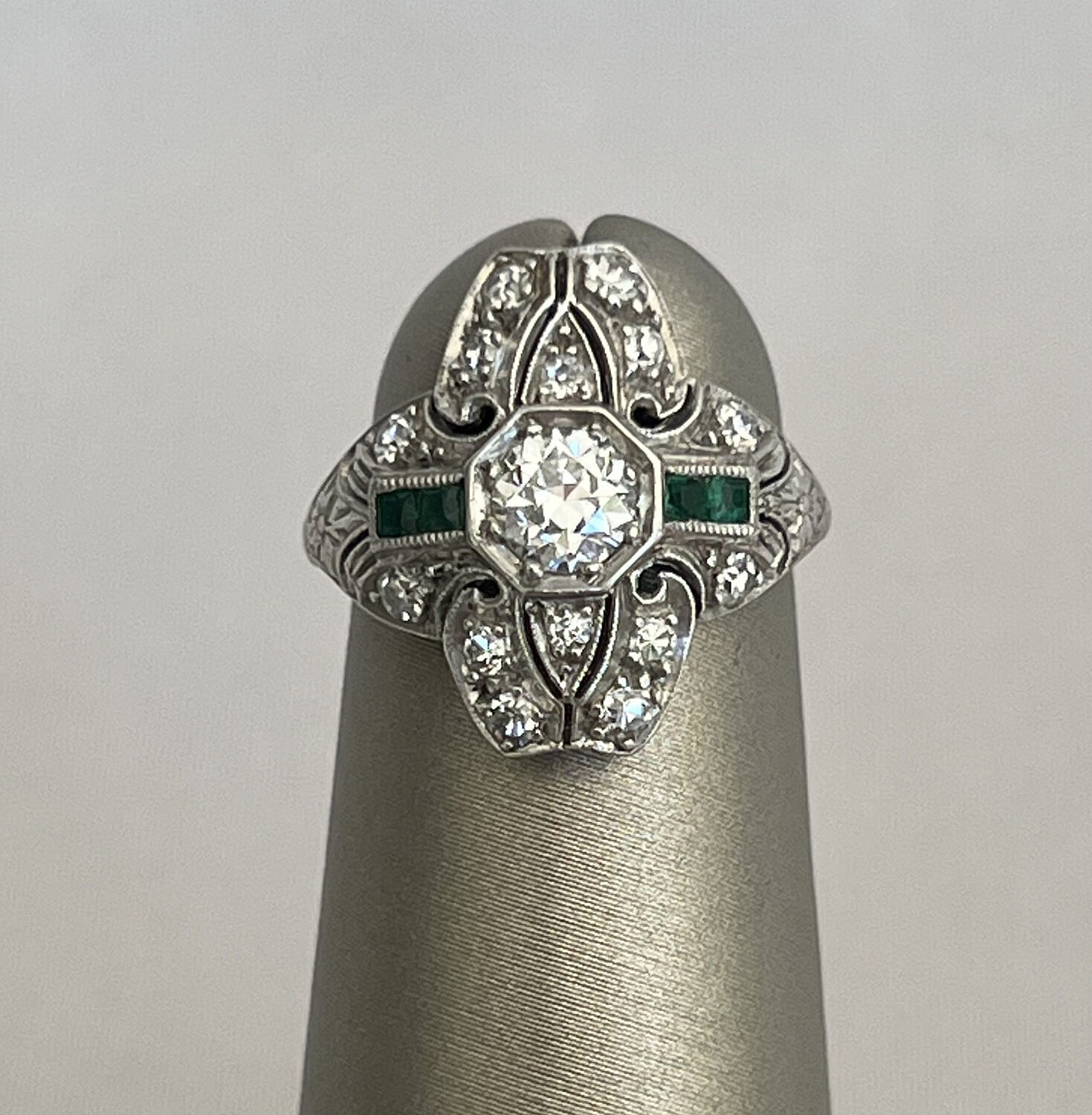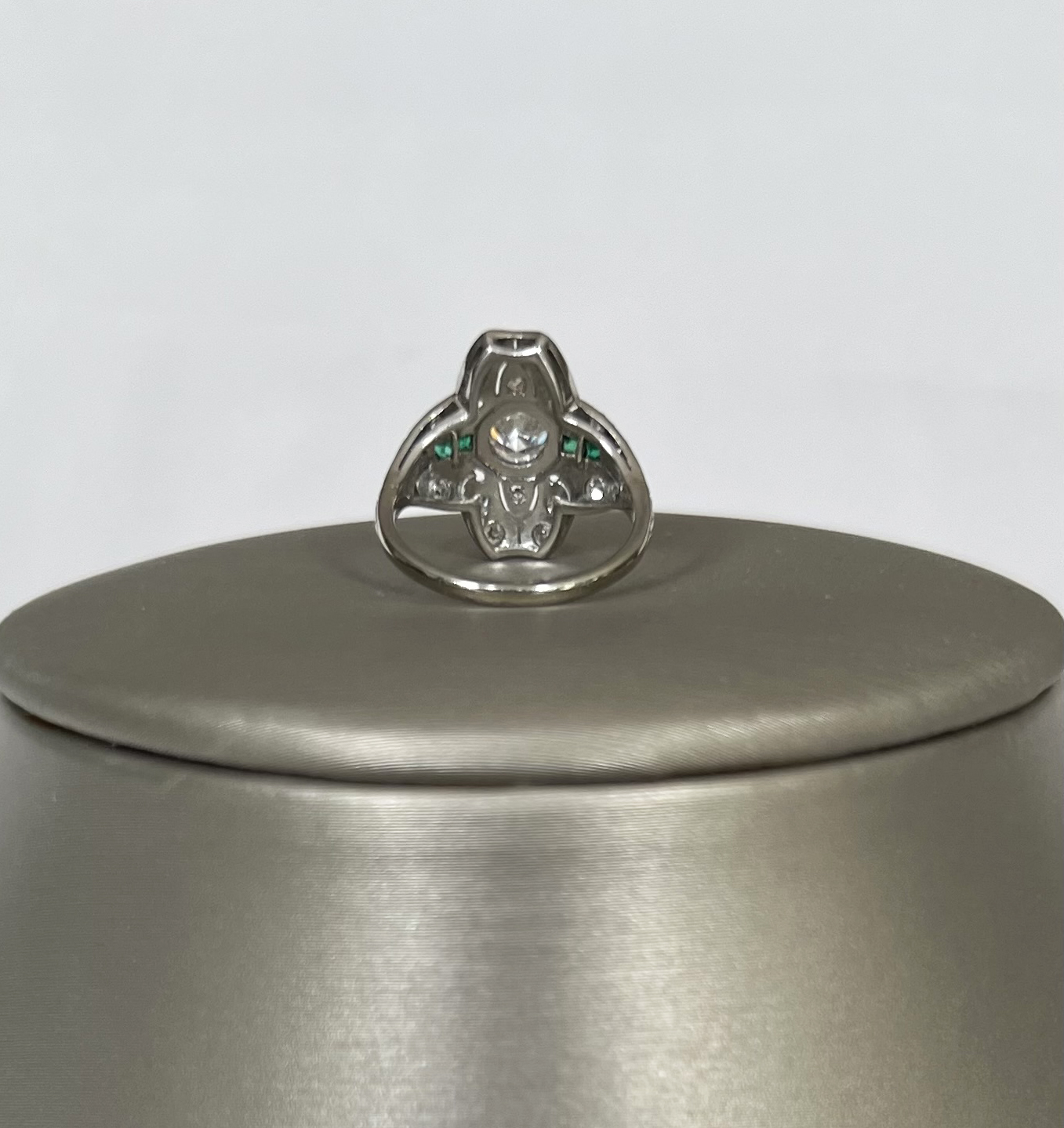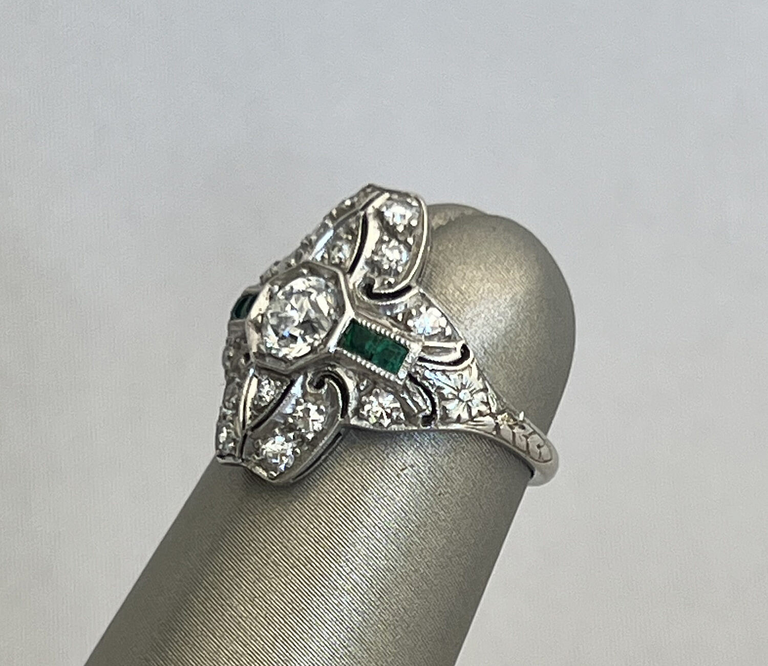 Diamond and Emerald Lady’s Cocktail Ring Set in Platinum Consign Now DeptJewelrySizeSize 4 Diamond and Emerald Lady’s Cocktail Ring Set in Platinum, central diamond surrounded by 14 smaller diamonds and 4 square cut emeralds flanking the central stone Size 4 Please note that this auction has ended. Click here for an overview of this auction.