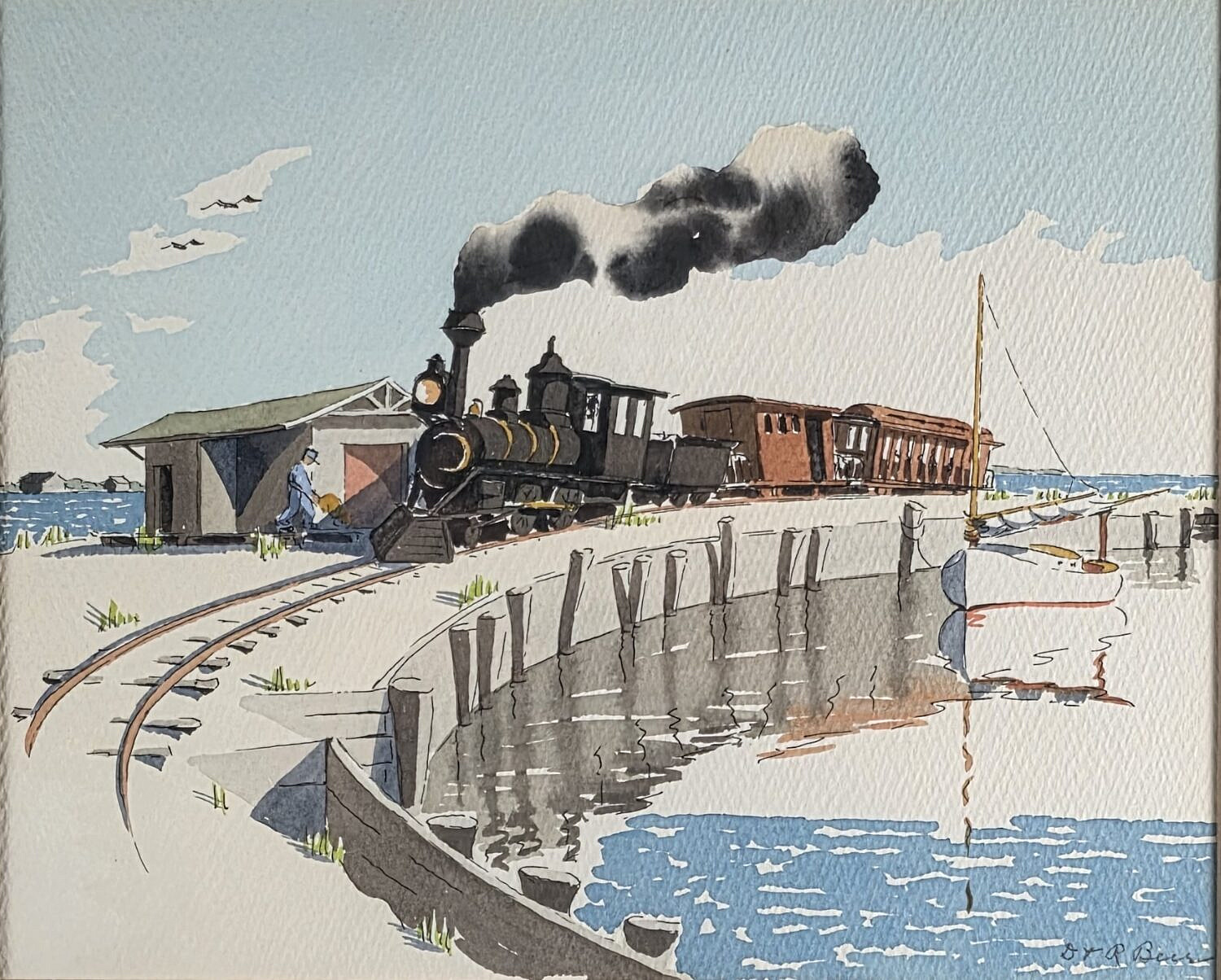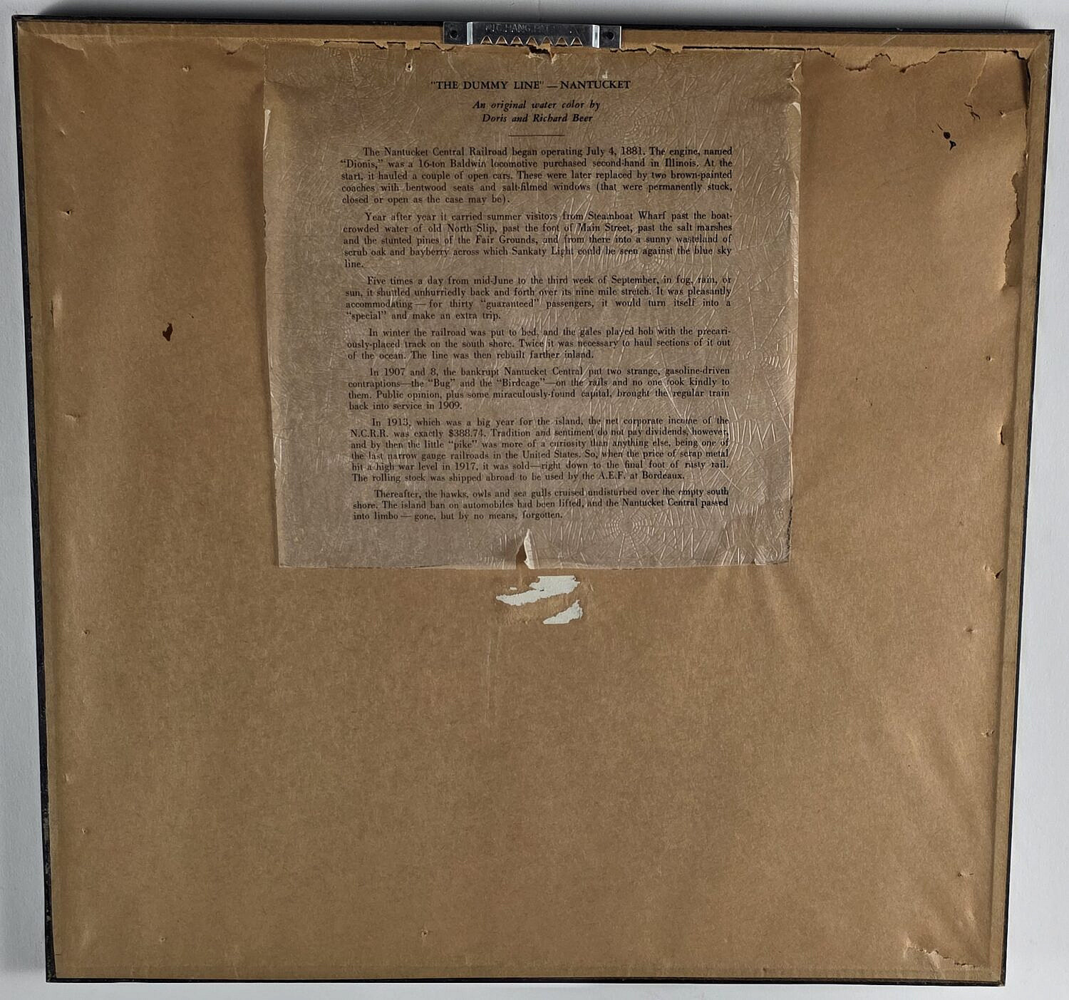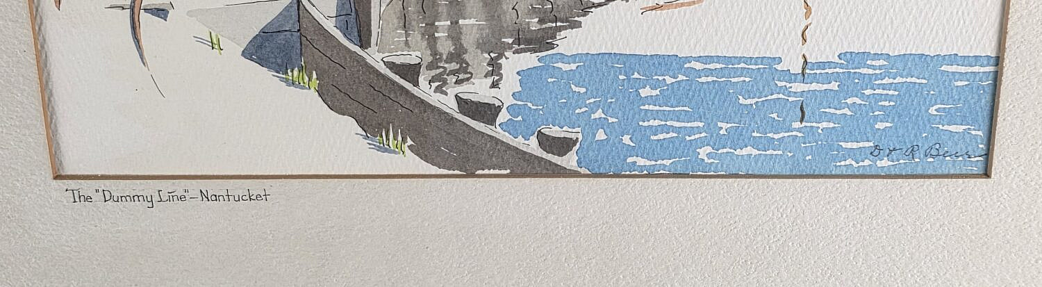 Doris and Richard Beer (1898-1967 & 1893-1959) Watercolor on Paper “The Dummy Line – Nantucket”, pencil signed lower right D&R Beer, pen titled on mat, matted and framed, accompanied with spider web translucent onion skin history taped to the reverse.