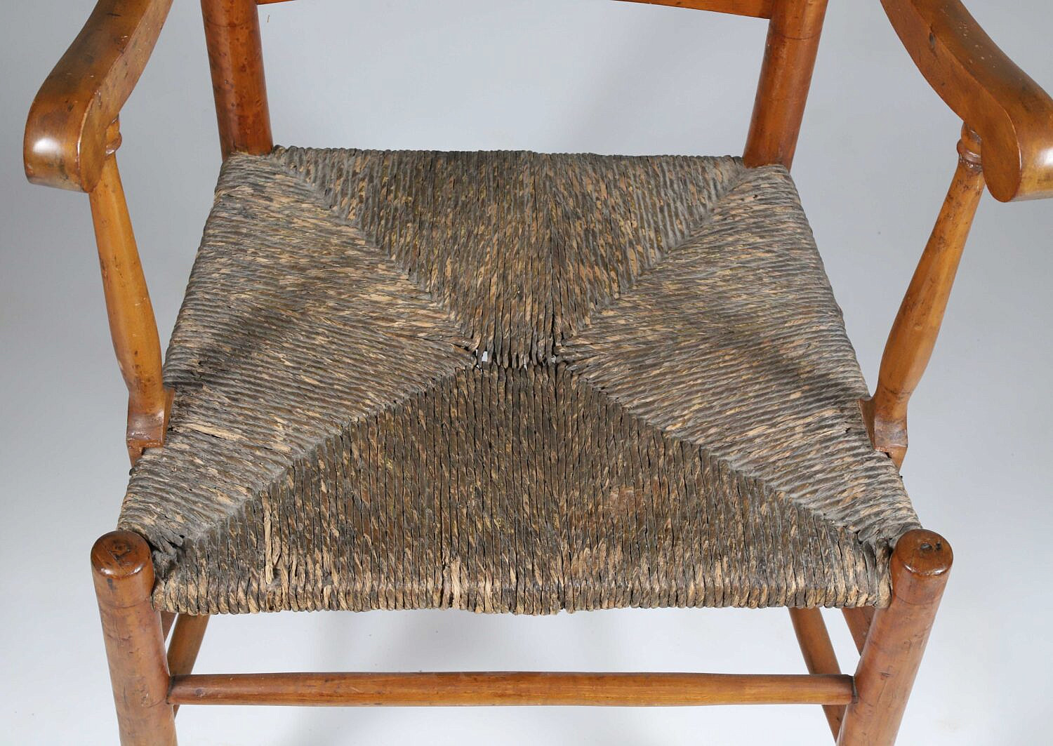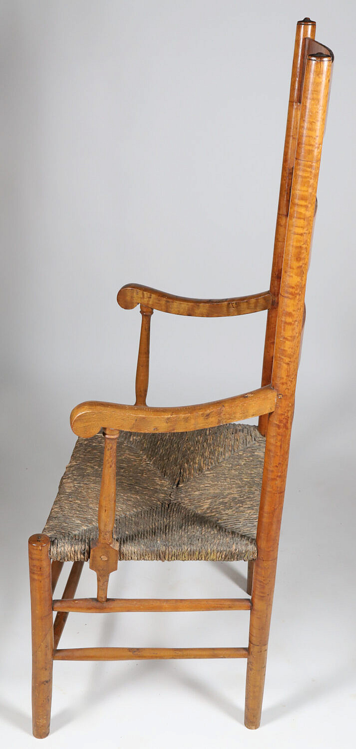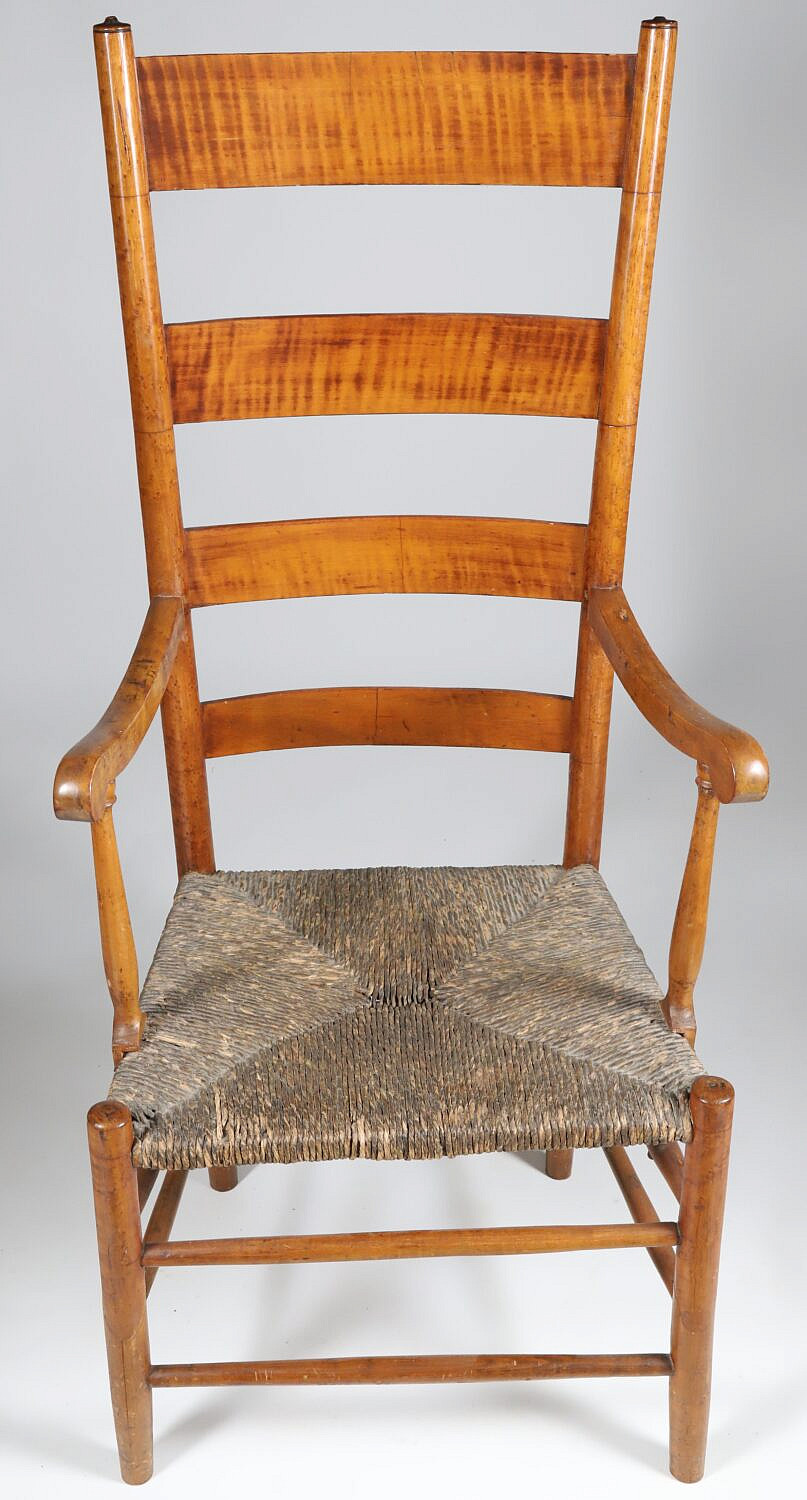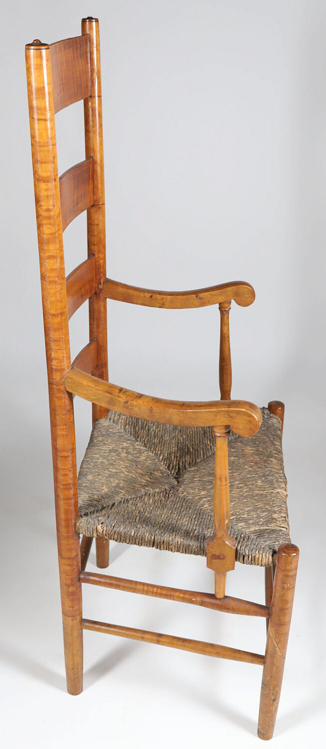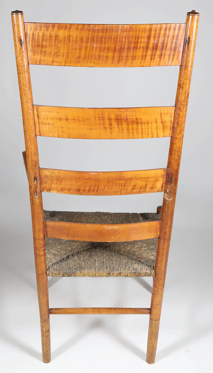 Early American Tiger Maple Ladderback Rush Seat Armchair, 19th Century