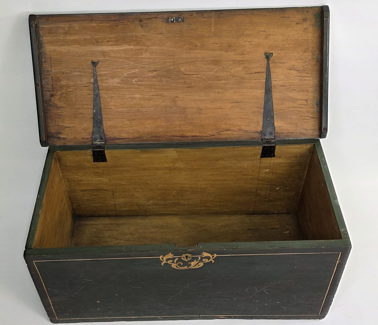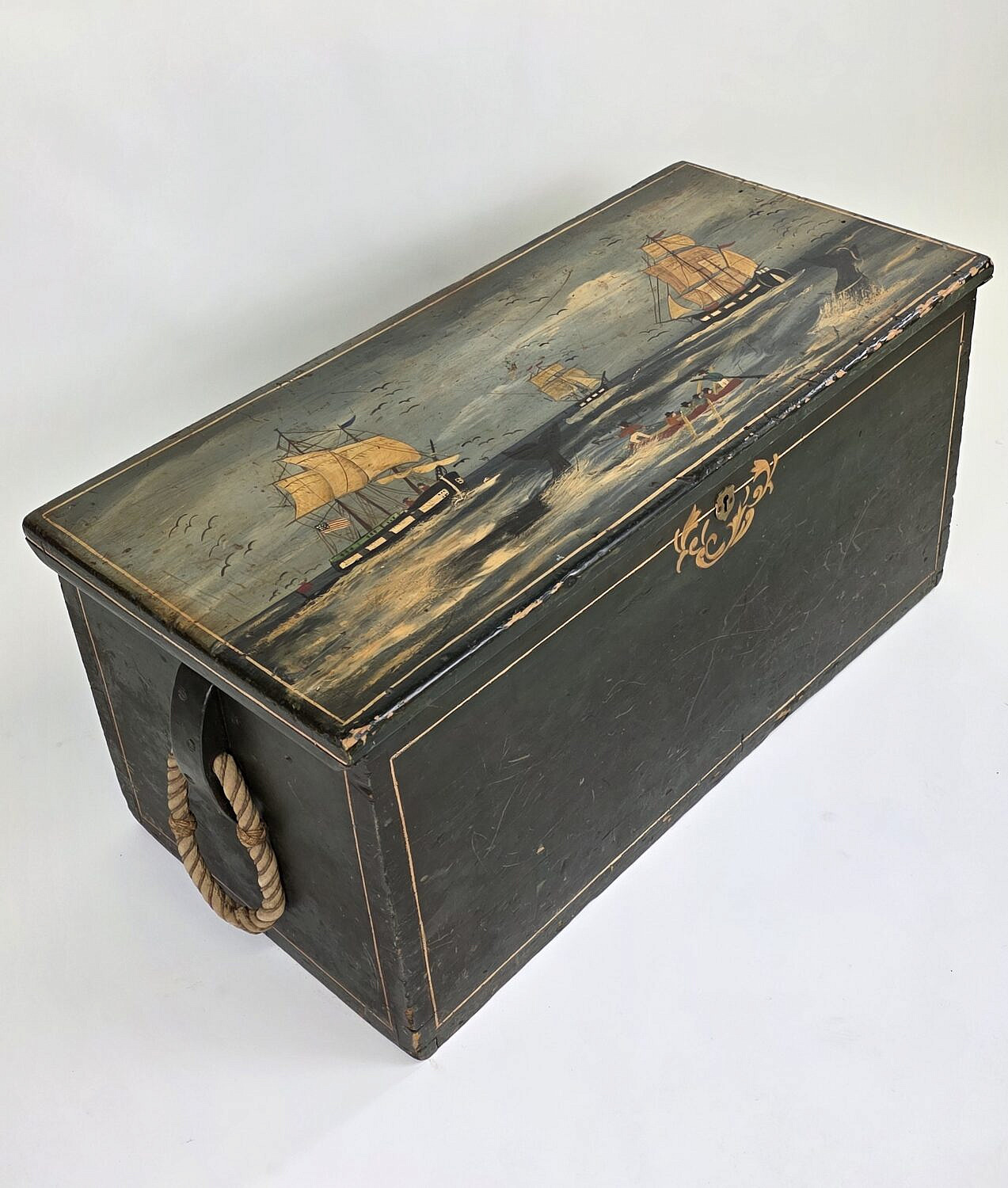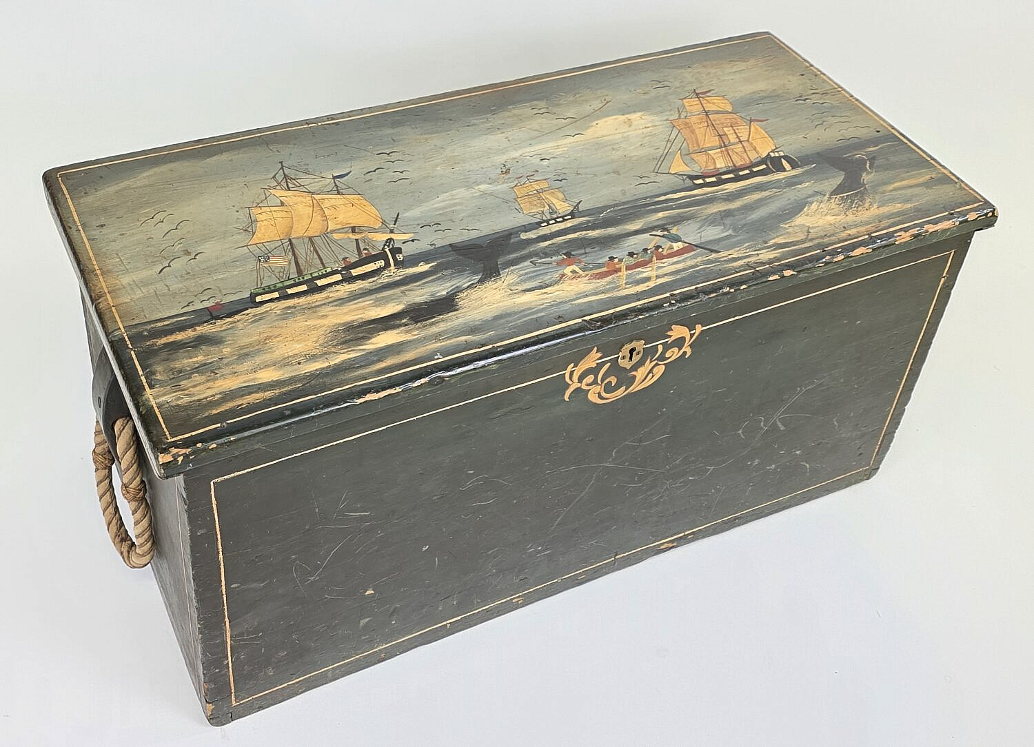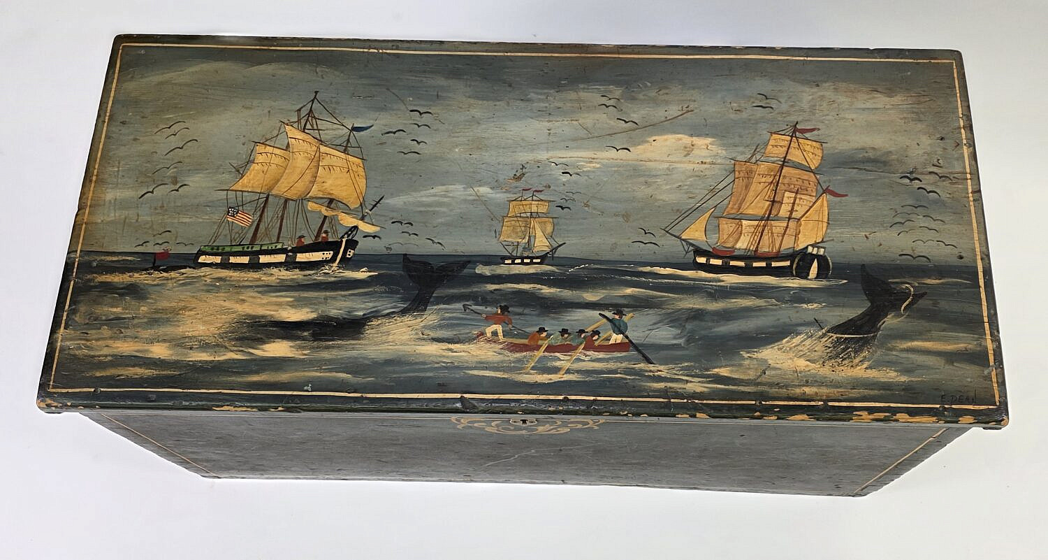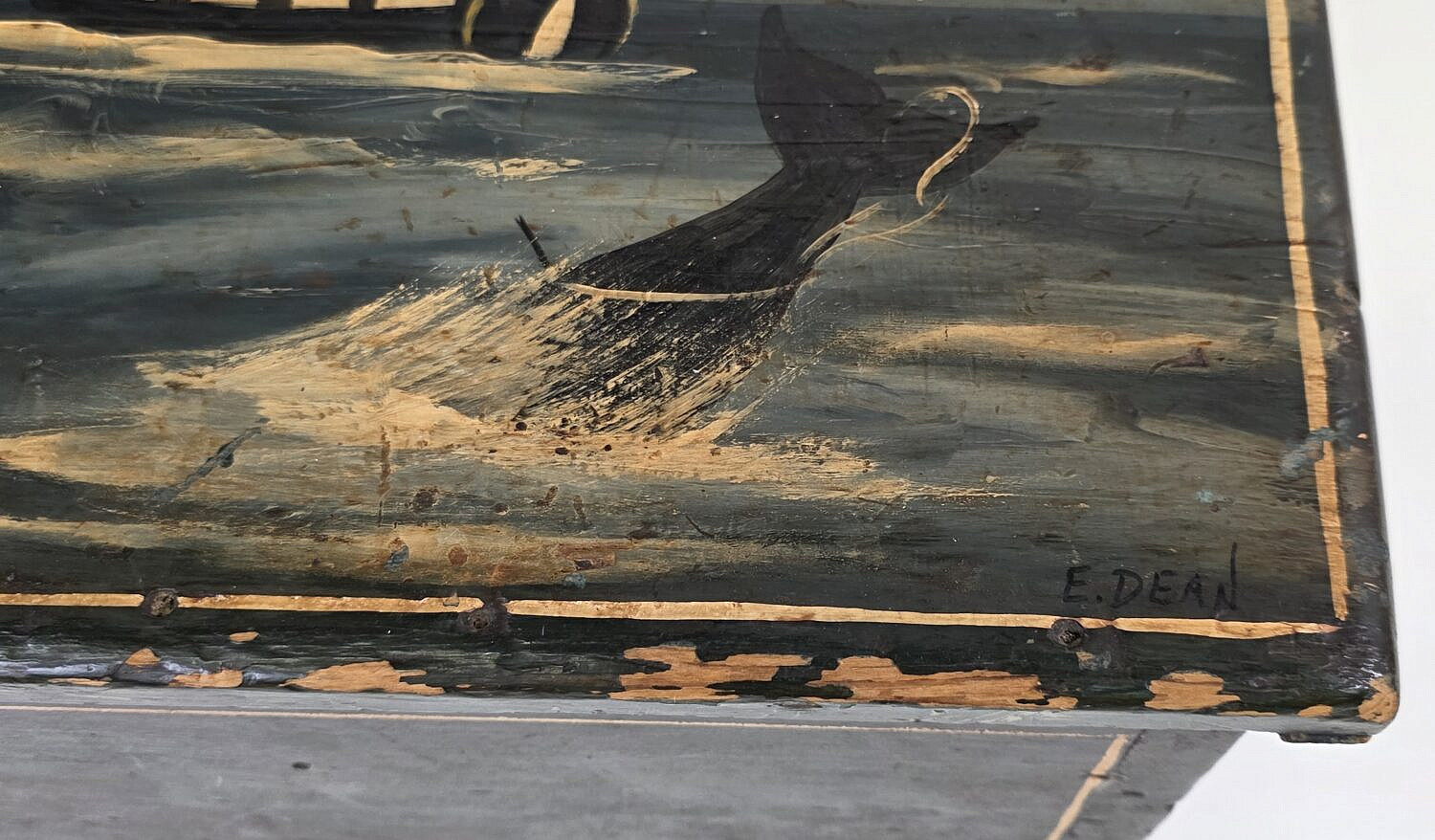 Elizabeth Dean Folk Art Whaling Scene Paint Decorated Trunk, 20th century