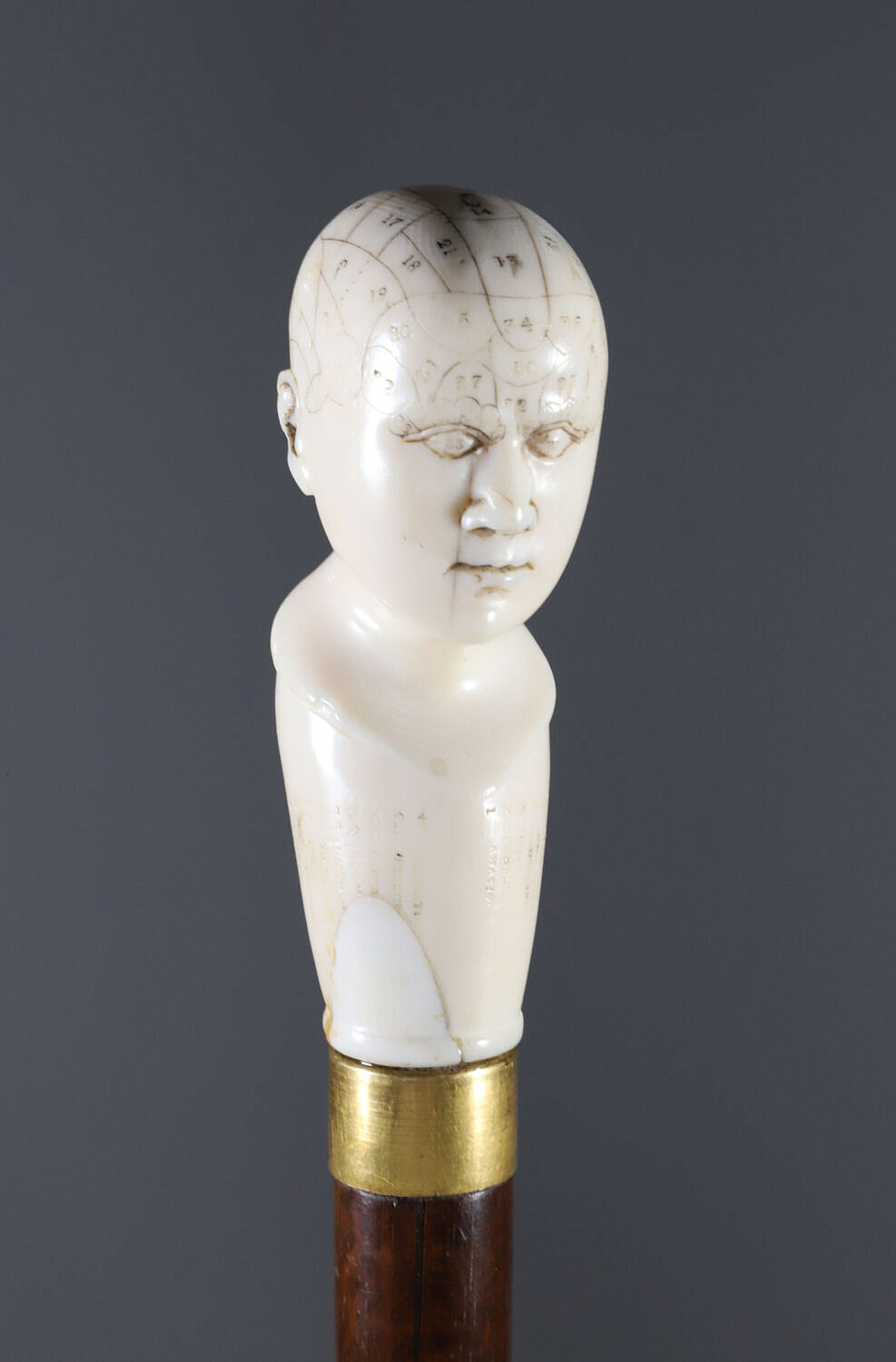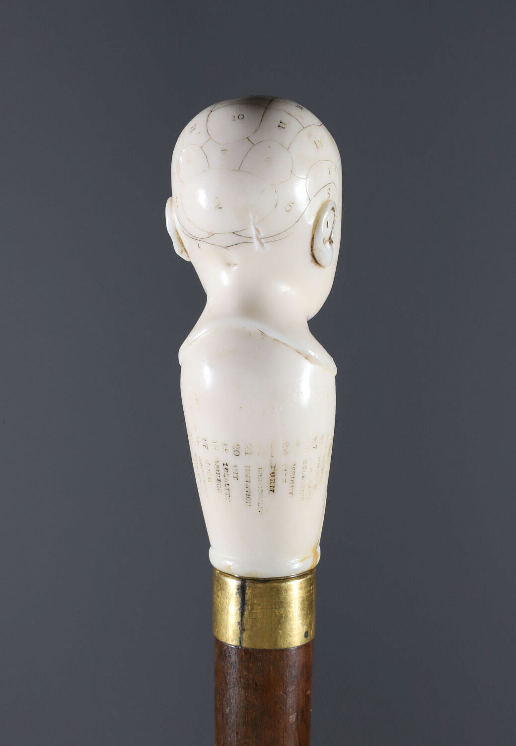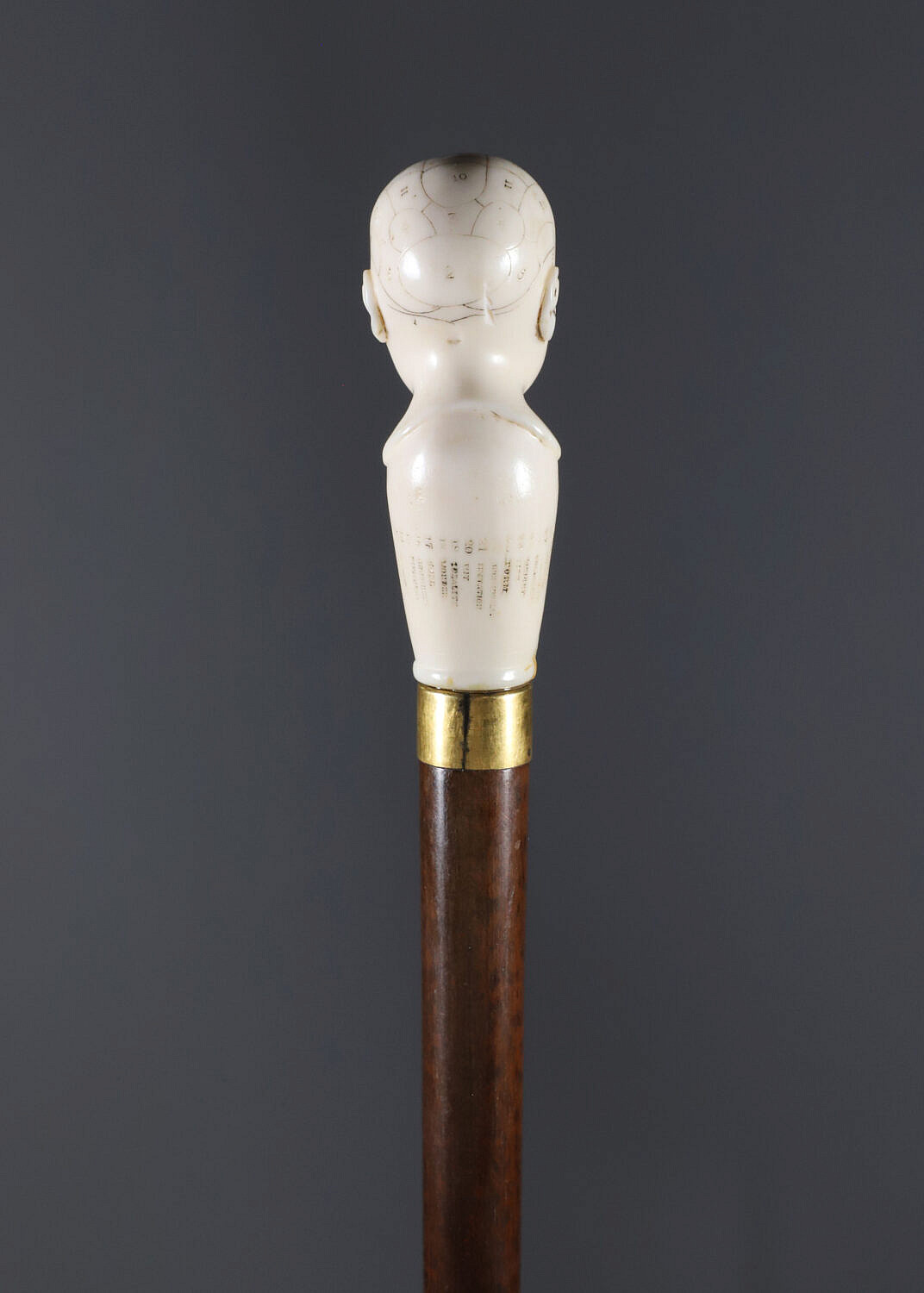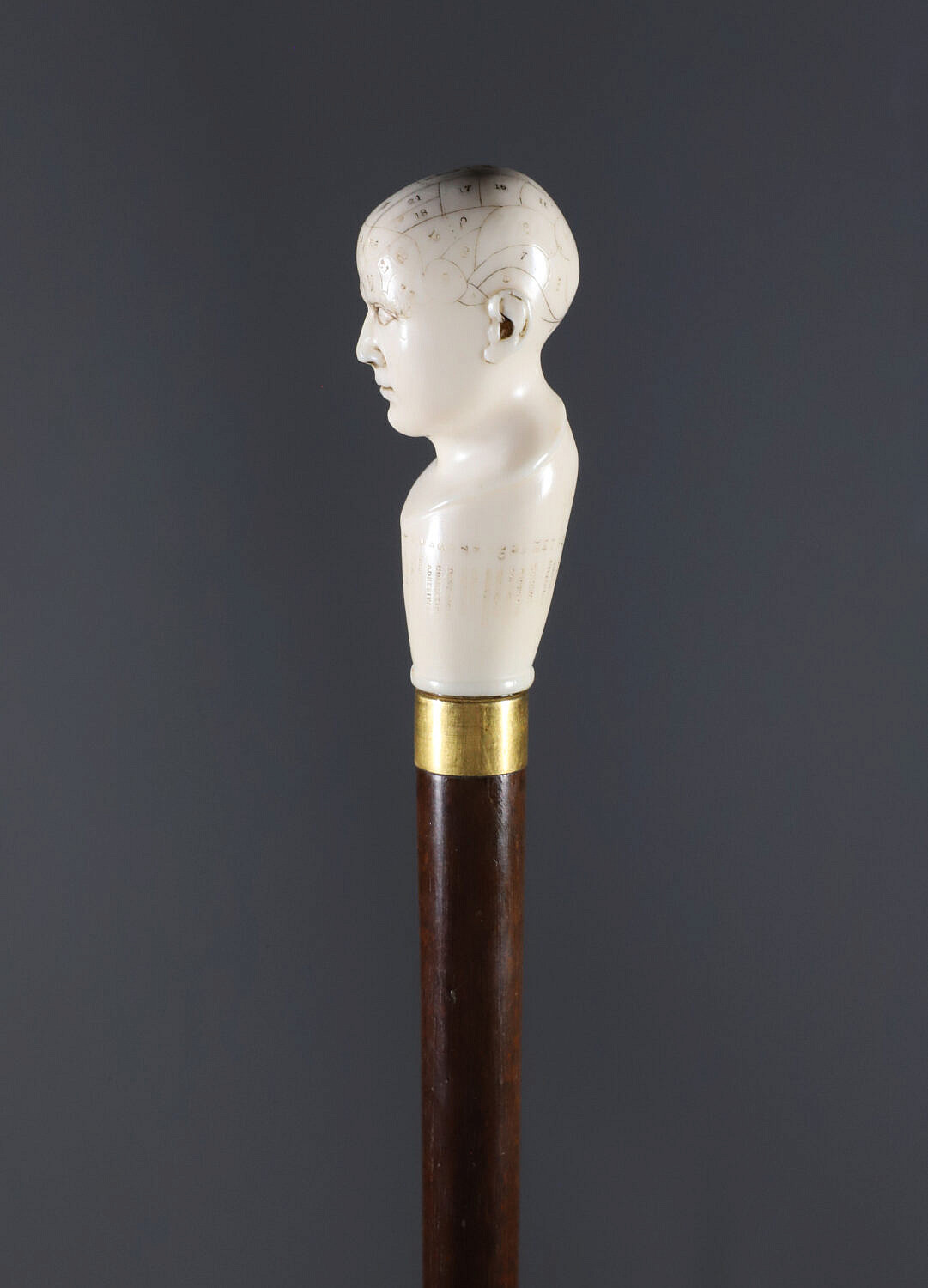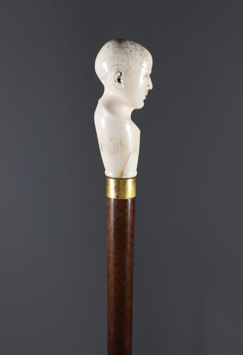 English Engraved Phrenology Head Grip Walking Stick, circa 1870 Consign Now DeptDecorative Arts, Walking Sticks and CanesSizeLength 39 in. English Engraved Phrenology Head Grip Walking Stick, circa 1870, fashioned of engraved antique ivory on hardwood shaft ending in brass ferrule. *Note: This item is not available for International shipping. Length 39 in. Provenance: The Estate of Eddi Van Auken Please note that this auction has ended. Click here for an overview of this auction.