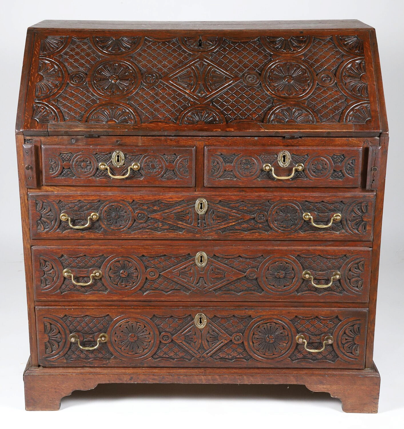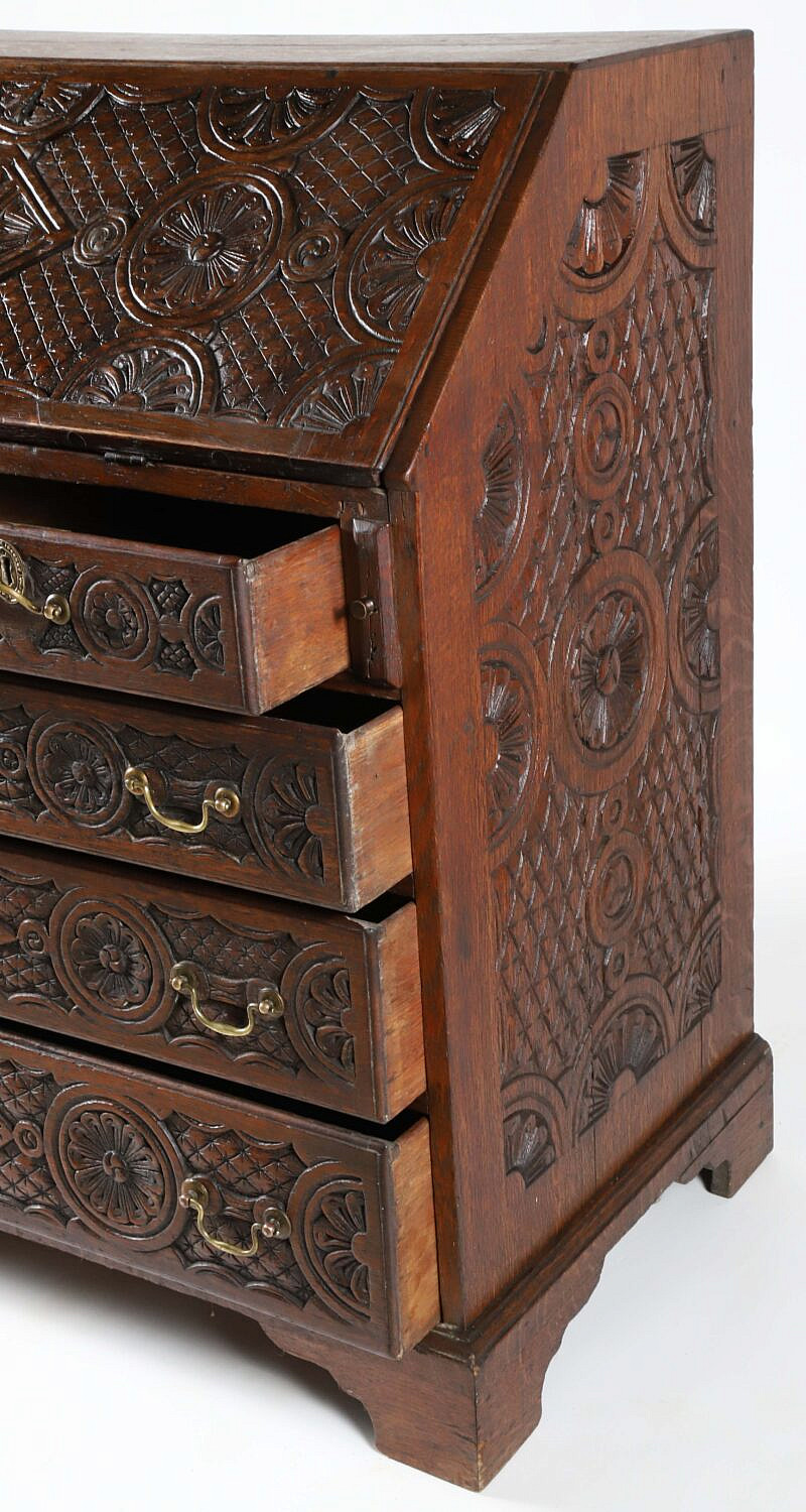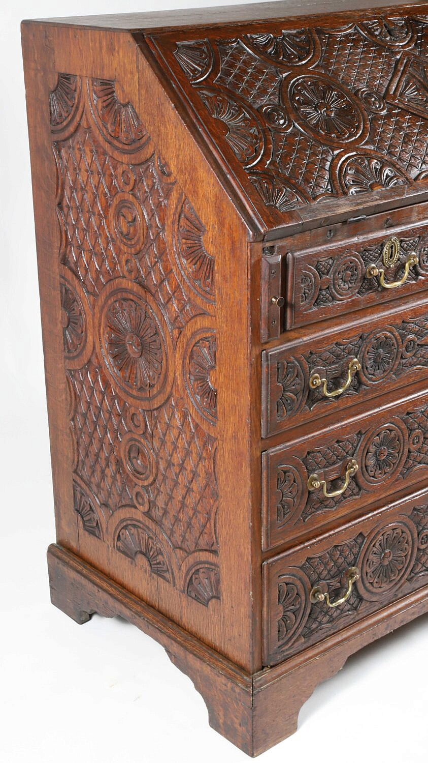 English Oak Profusely Carved Slant Front Desk, 19th Century, decorated with rosettes, pineapple and diamond carvings throughout, the slant lid opens over lopers to reveal cubby holes, drawers and central door compartment flanked by columns, two over three drawer configuration, bracket feet