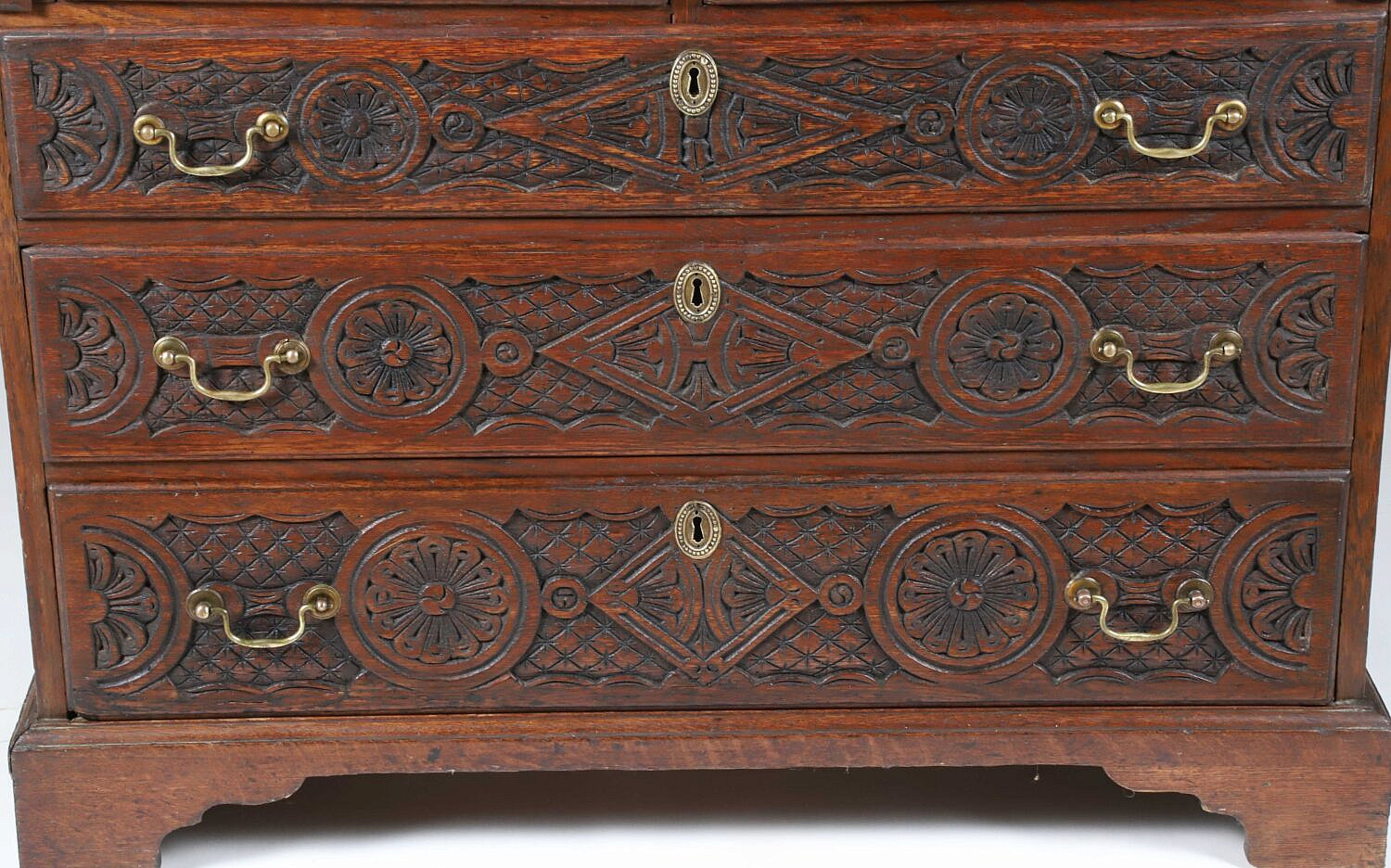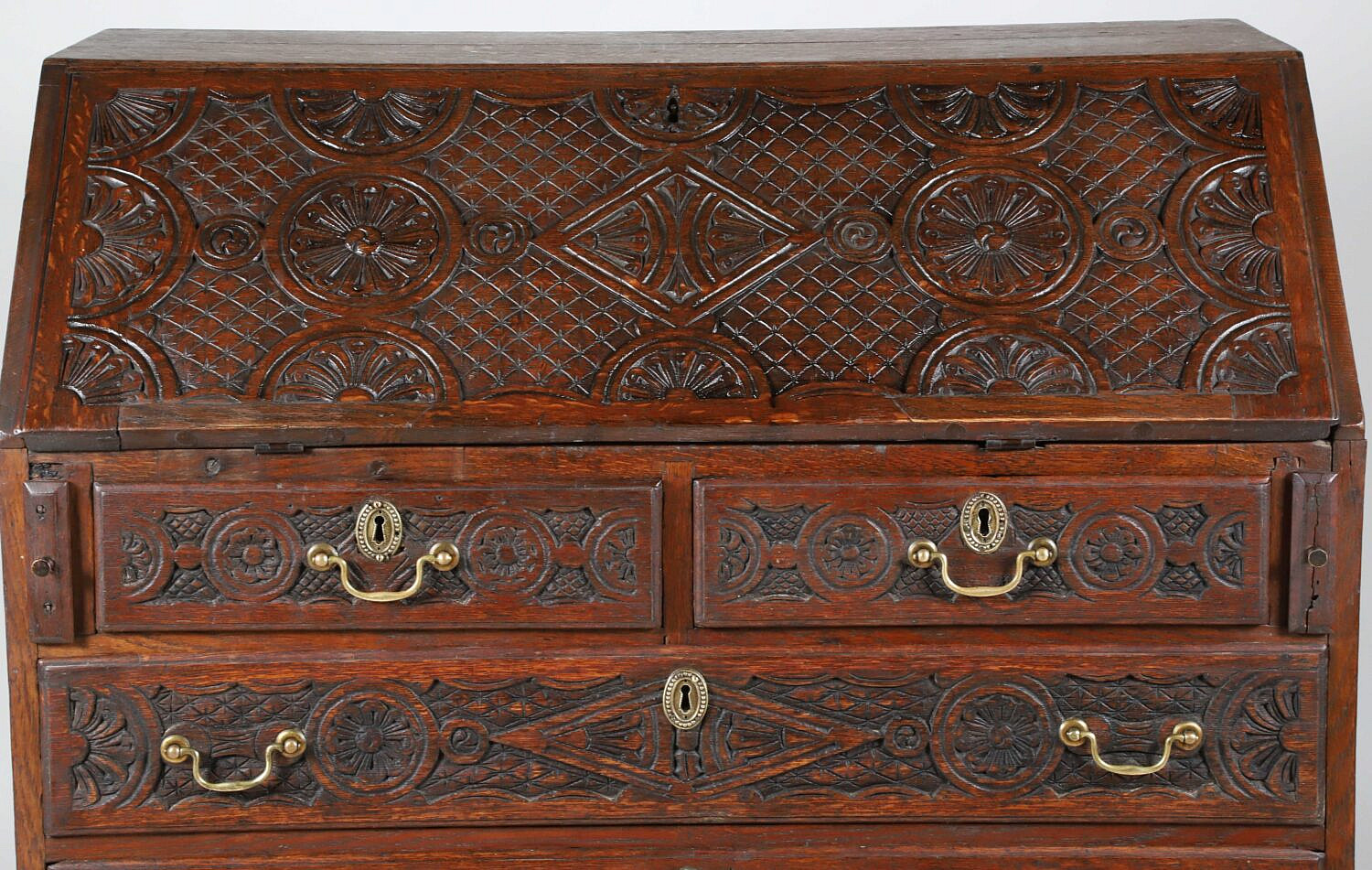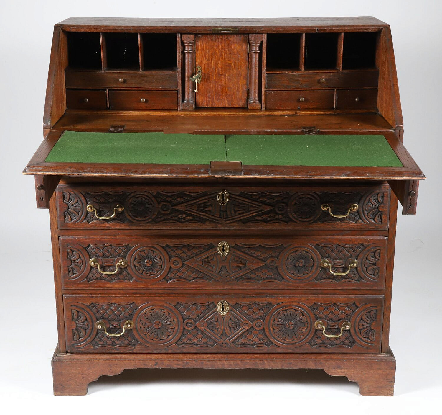 English Oak Profusely Carved Slant Front Desk, 19th Century, decorated with rosettes, pineapple and diamond carvings throughout, the slant lid opens over lopers to reveal cubby holes, drawers and central door compartment flanked by columns, two over three drawer configuration, bracket feet